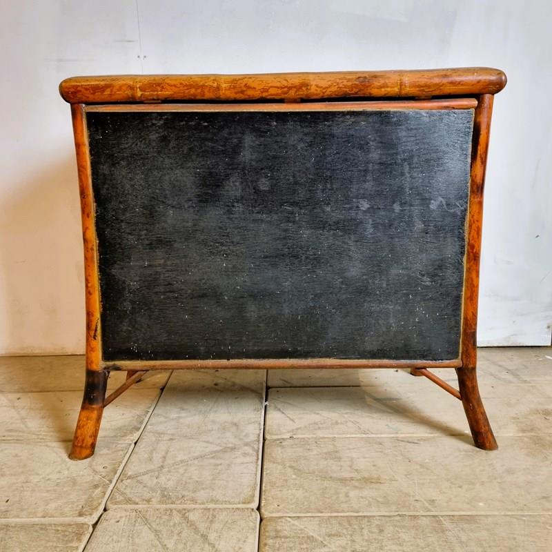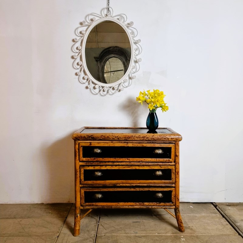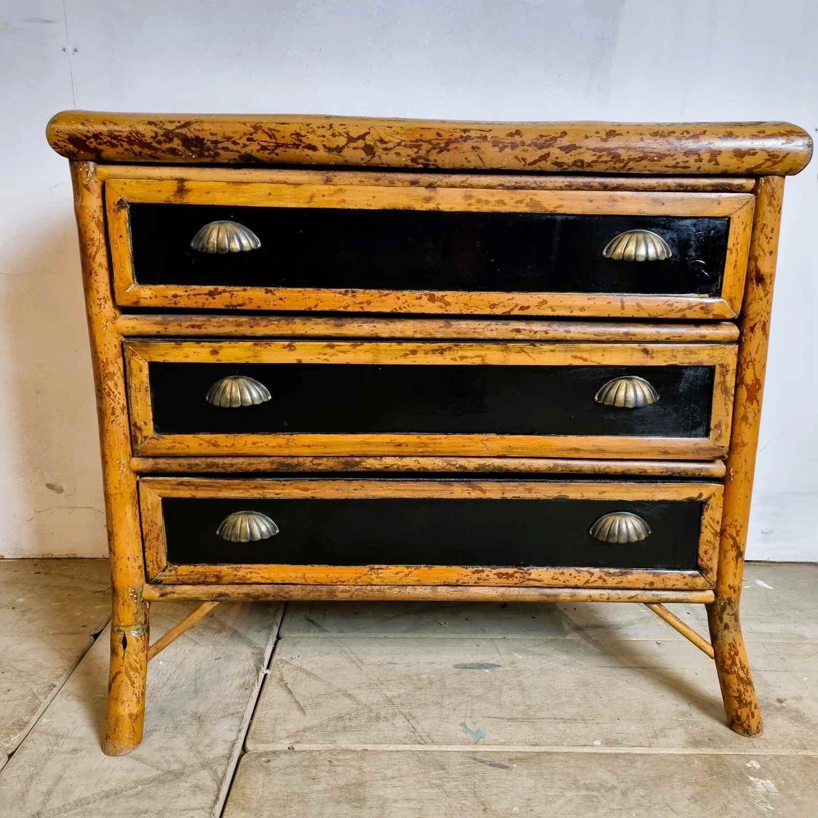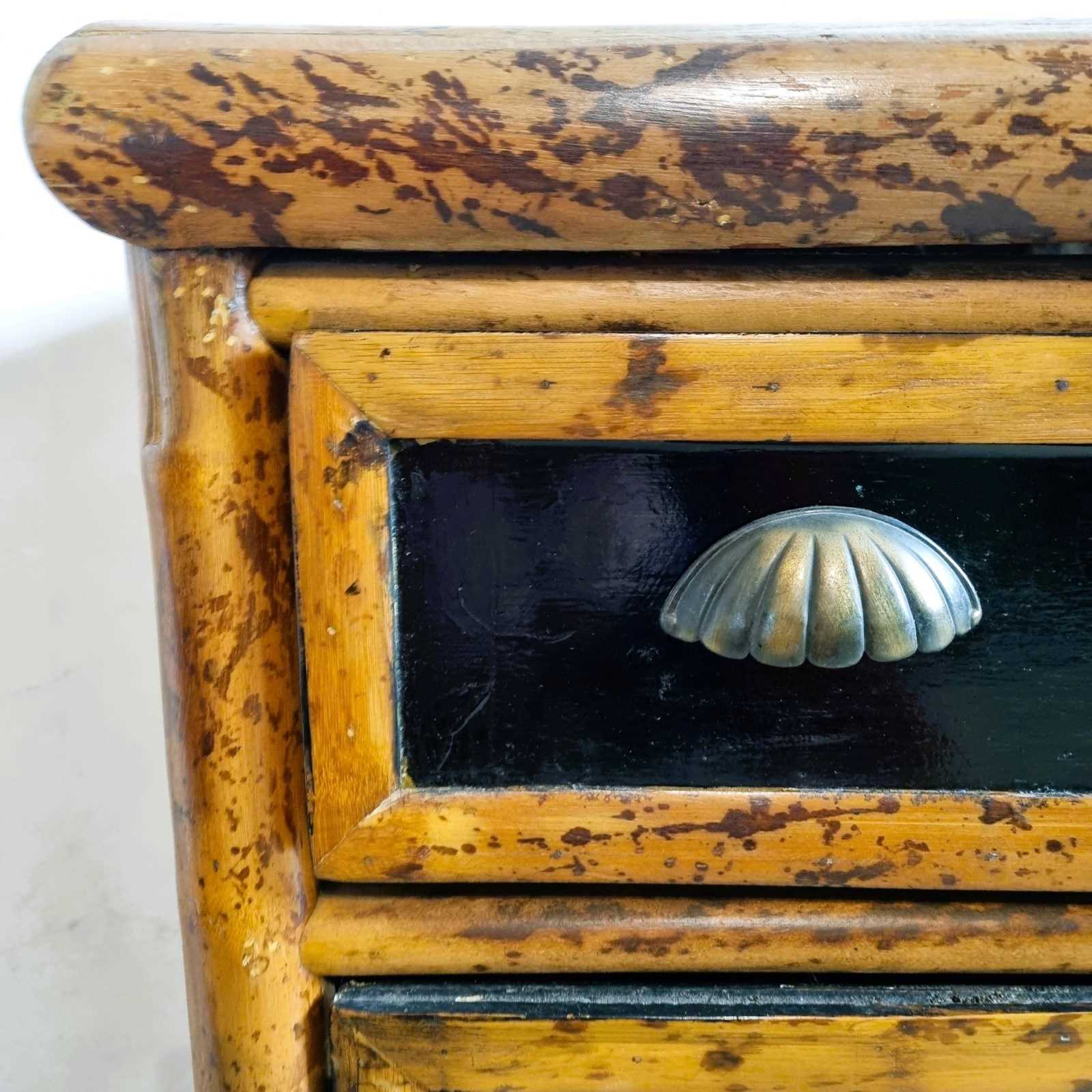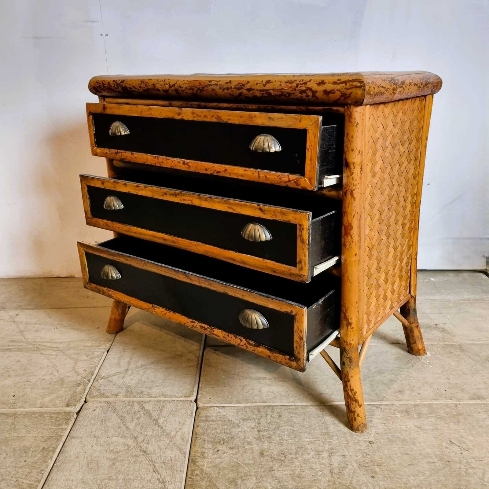 Style: Fabulous, 1970s bamboo chest of drawers featuring three drawers, gracefully curved front legs, and rattan lattice sides. Crafted in natural bamboo, it has been later ebonised for a sleek, modern finish and fitted with updated hardware for enhanced style and functionality. There is a small circle of damage to the top, commensurate with age.