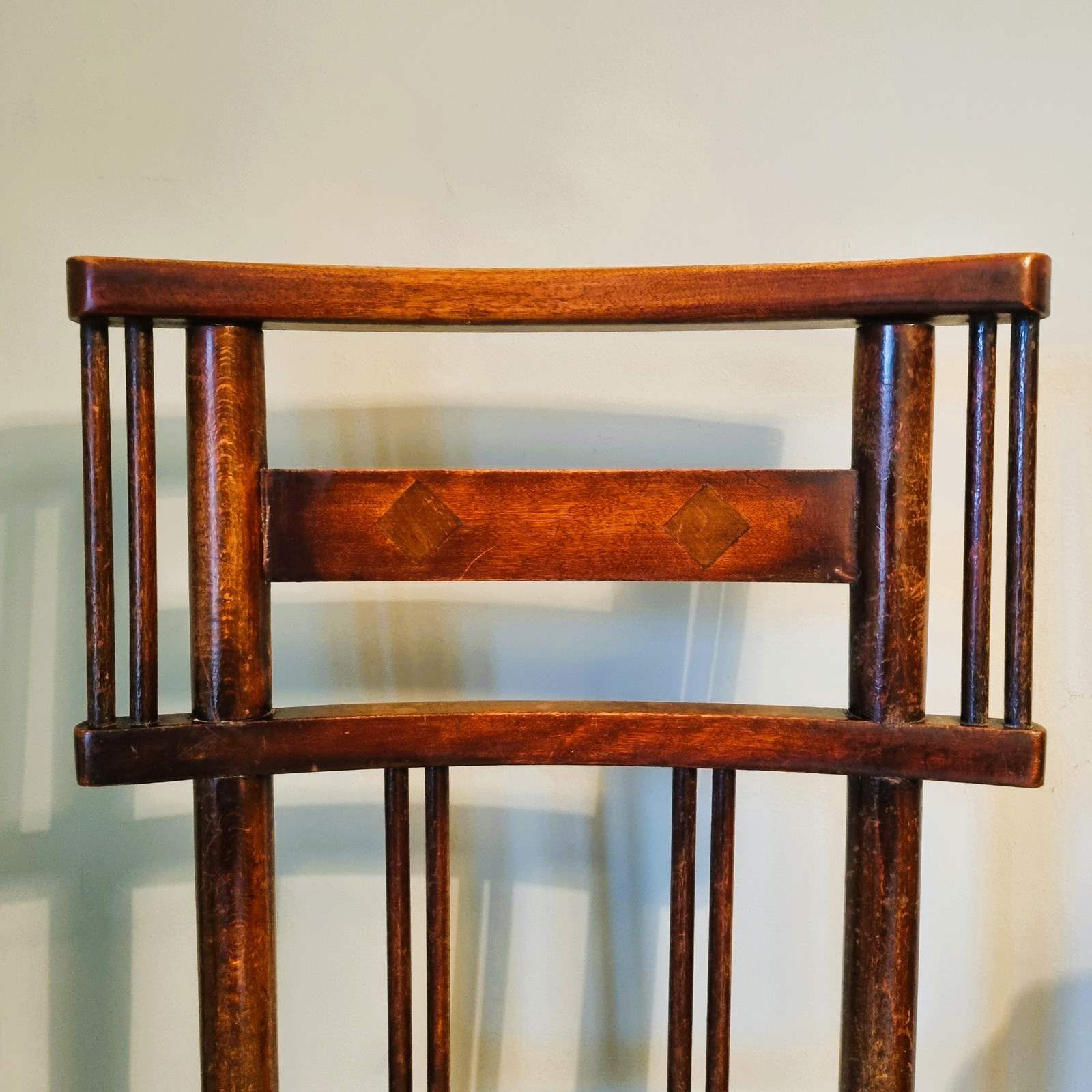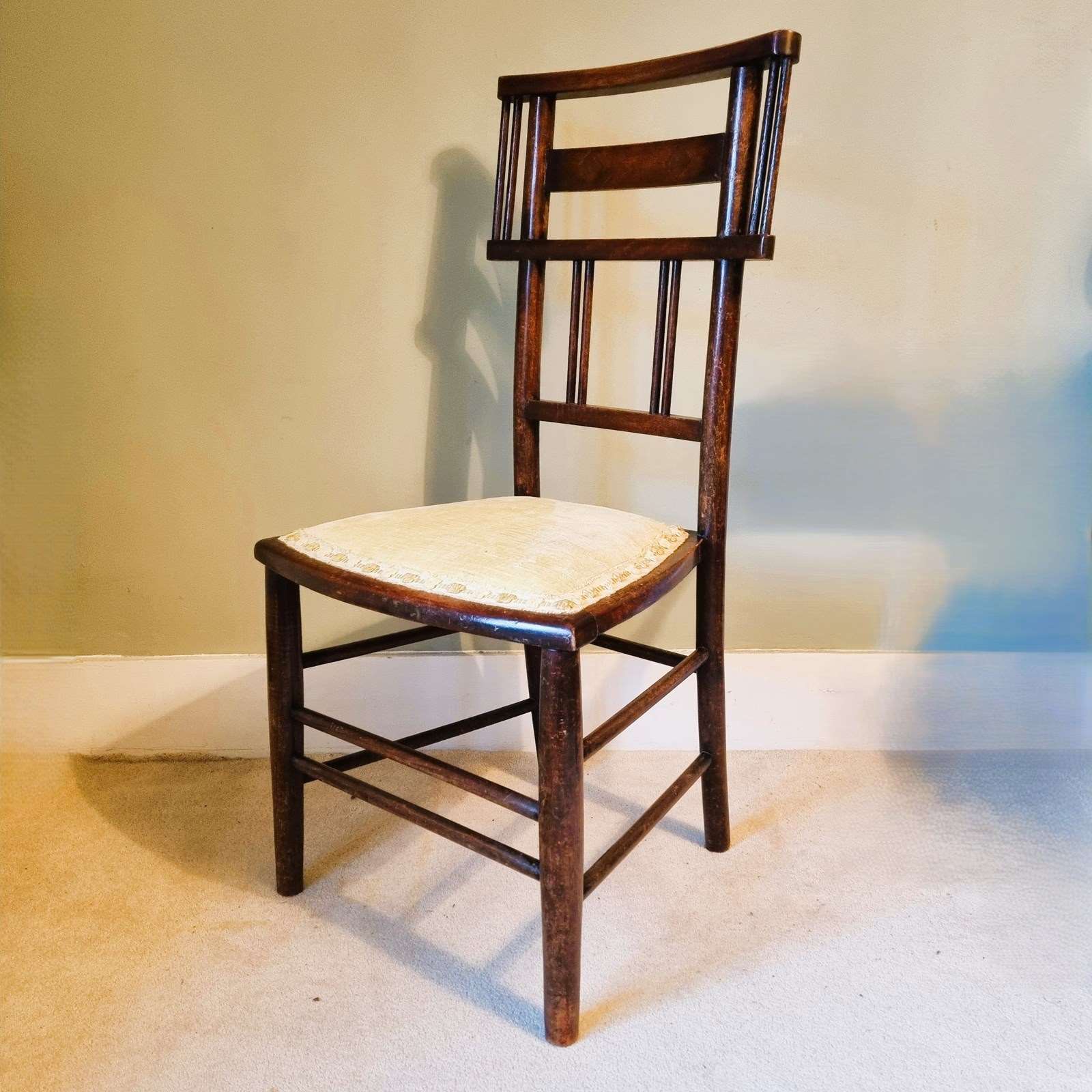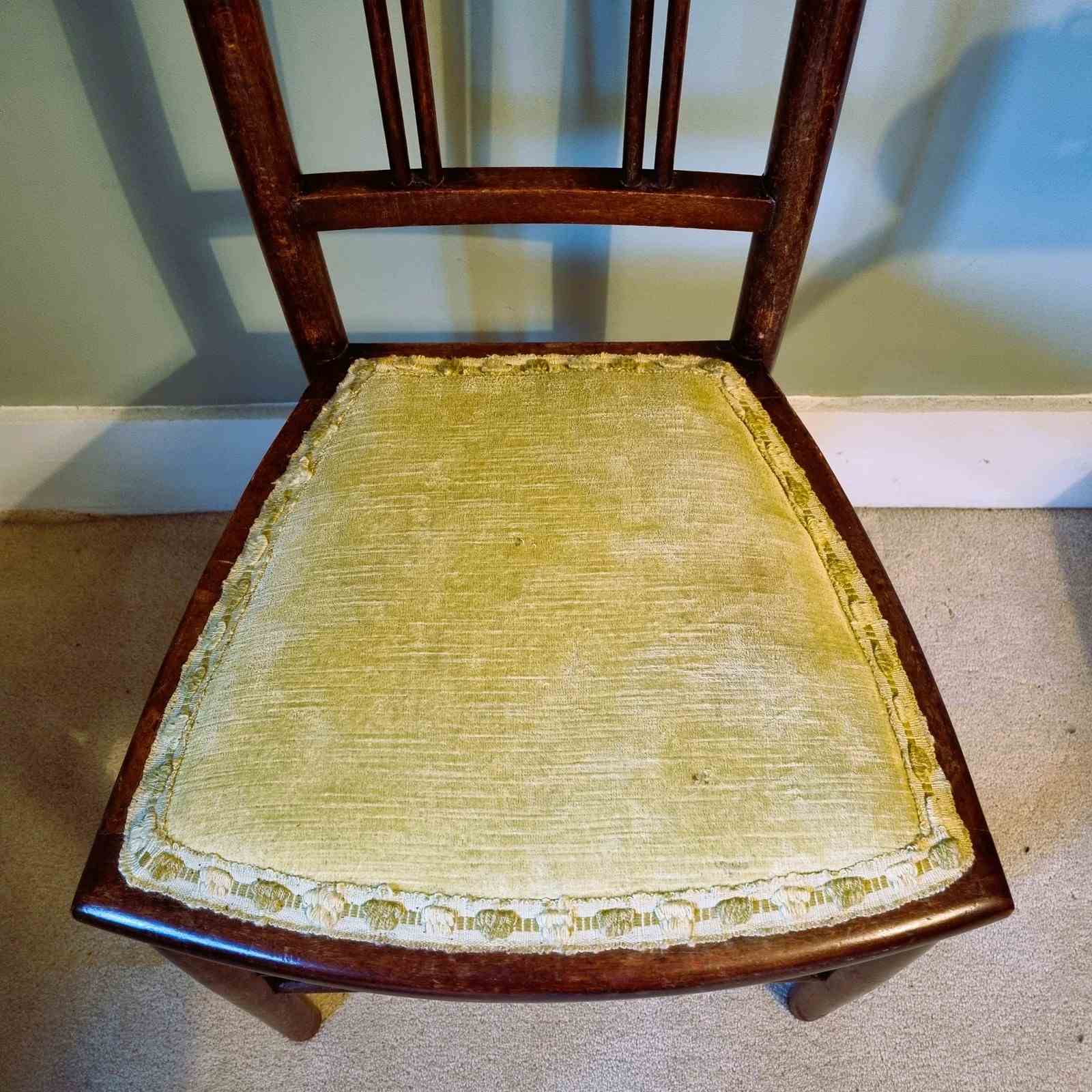 Style: Crafted from rich mahogany, this one‑of‑a‑kind Arts & Crafts side chair showcases a striking geometric, spindle back design with a decorative diamond shape inlays that offers a subtle nod to the later Art Deco style. A lemon‑yellow velvet seat, finished with a pale gold trim, offers understated comfort.