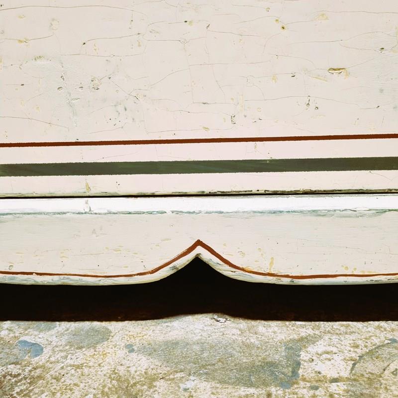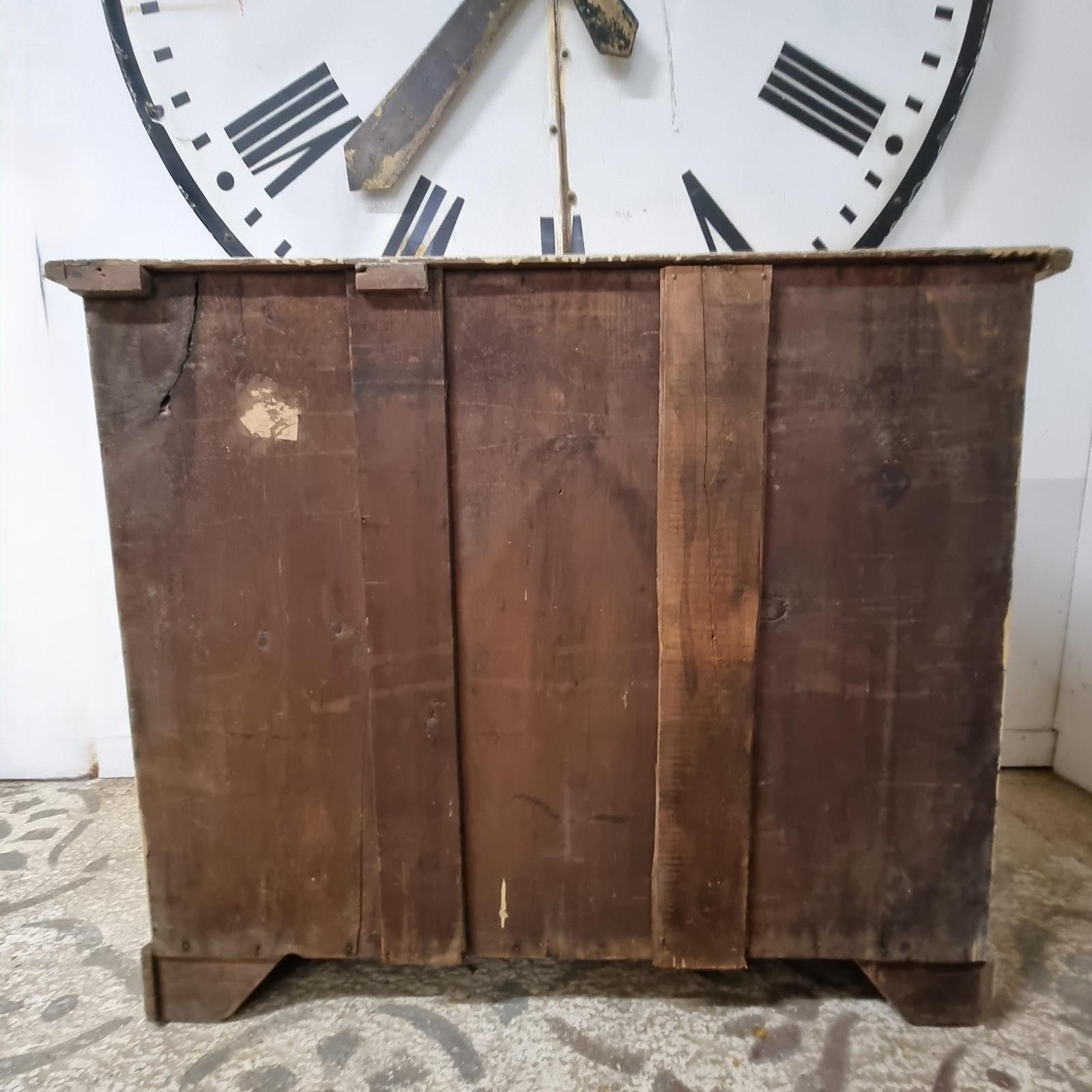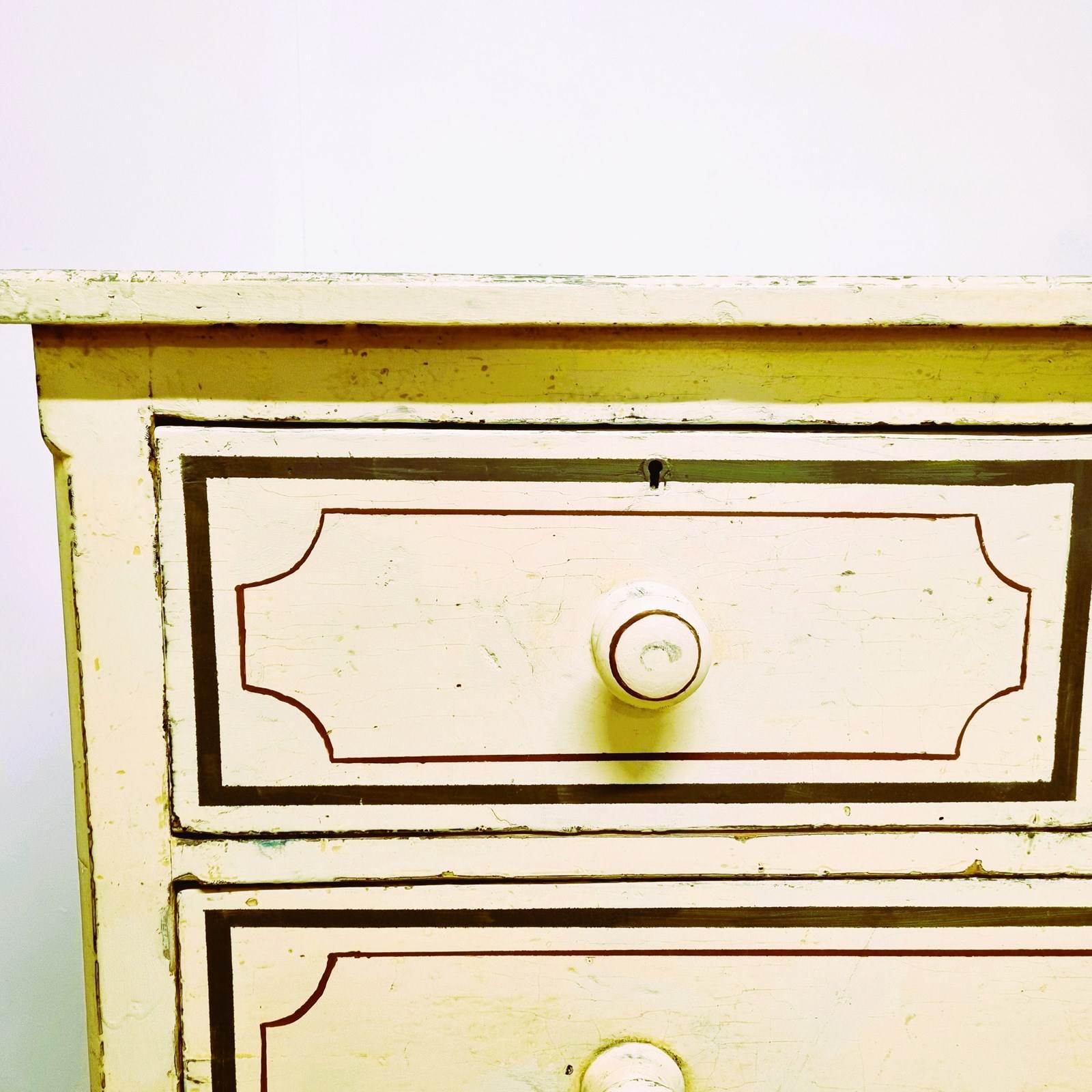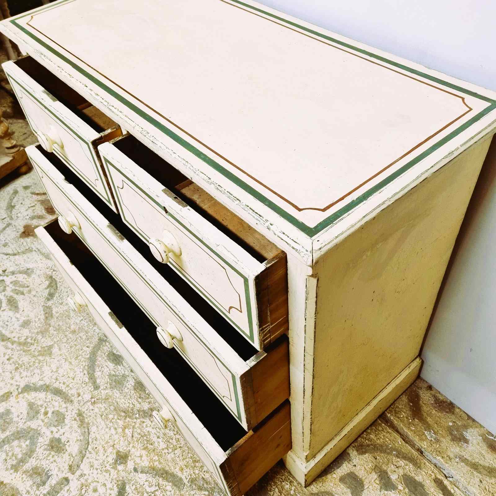 Style: A generously sized two over three chest of drawers, finished in original soft cream paint with later added dark green and burgundy accents, retaining its charming aged, worn patina. This sturdy piece adds a touch of style to any bedroom while providing ample space for clothing, blankets, or other essentials.