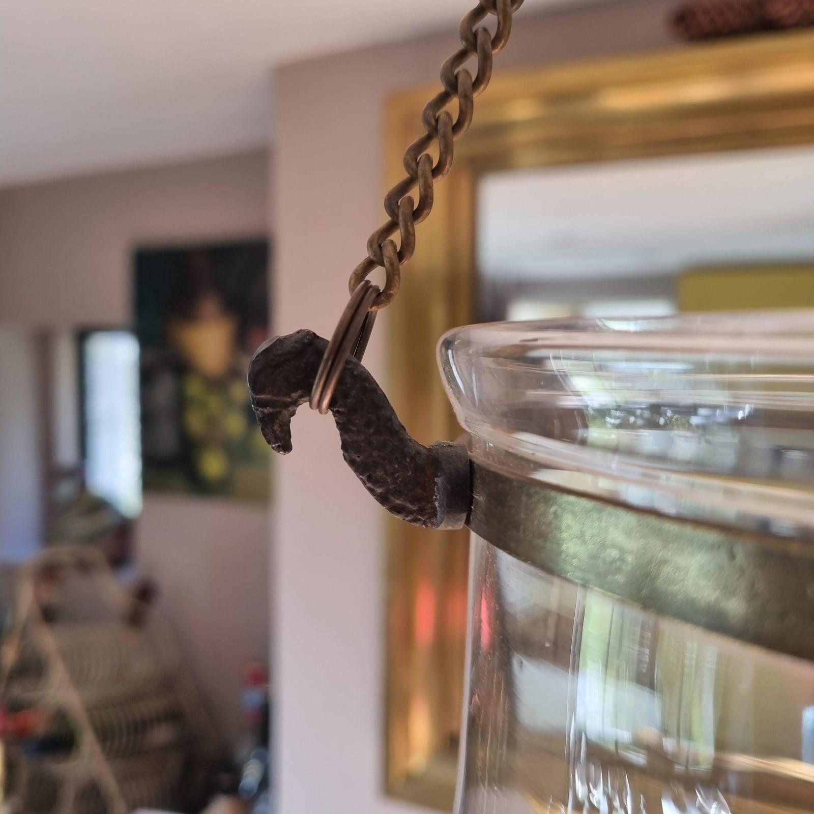 Style: A glass hand blown hundi lantern featuring a smooth, rounded shade held by a simple brass gallery and suspended by brass chains hooked over three small birds’ heads. This minimalist piece blends traditional colonial design with modern transparency, offering a refined, versatile lighting solution. Can be used with an electrical fitting or a candle (not supplied). H 50cm (hanging as seen) Top diam 21cm Base diam 15cm