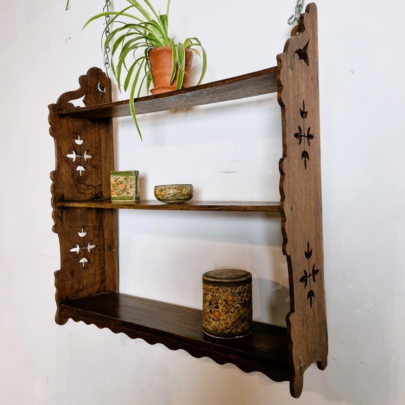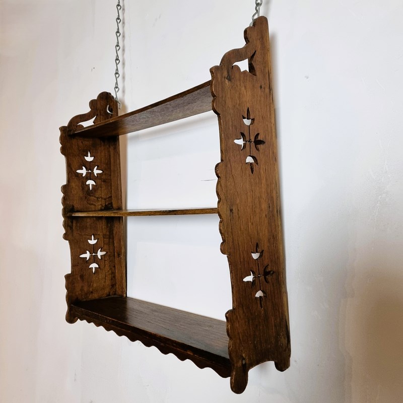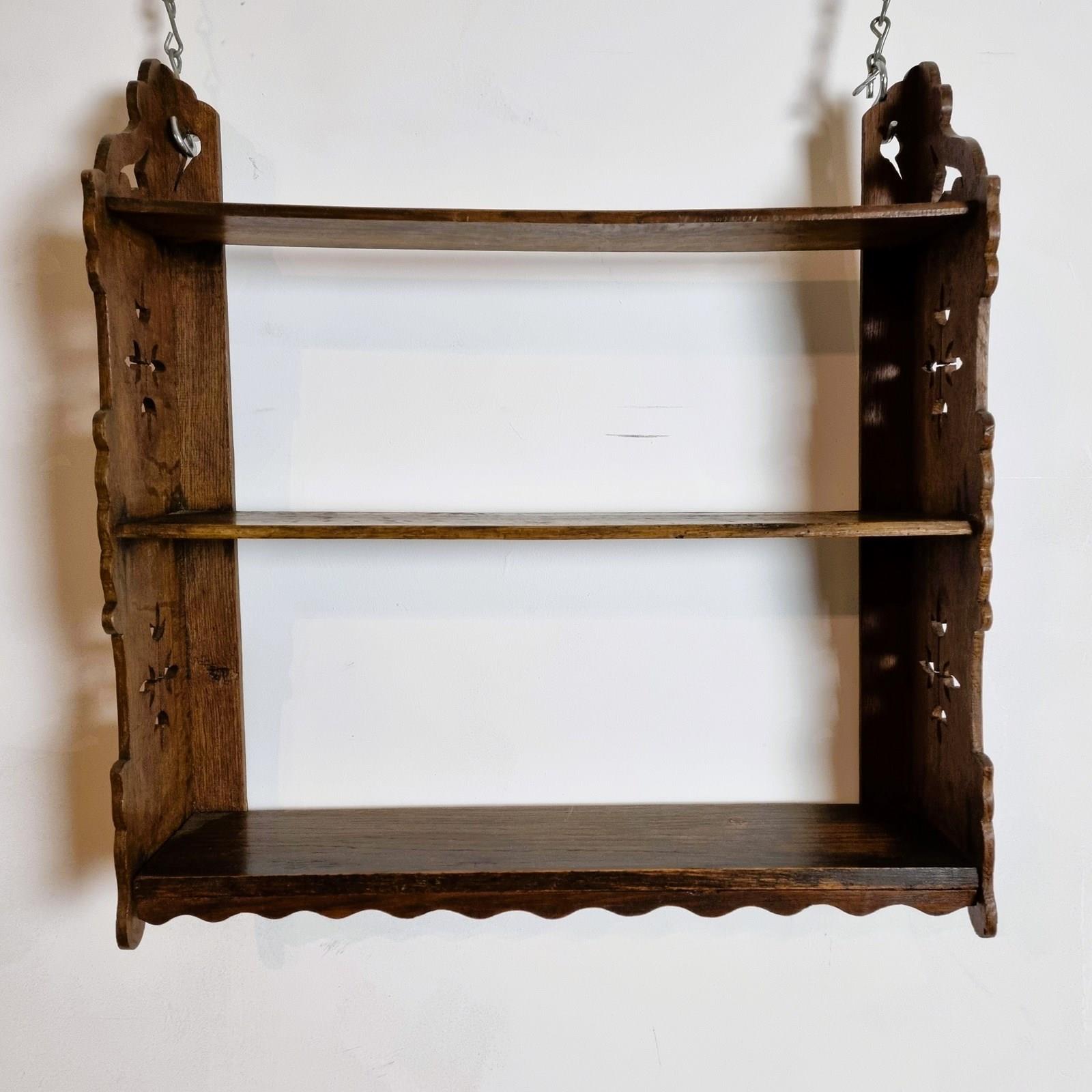Style: A delightful and perfectly formed small Arts and Crafts wall shelf, expertly crafted in oak with leaf design fretwork. This three-tiered piece features desirable carved scalloped shaped edging and displays a beautiful, rich golden patina. Can be hung on the wall or placed on top of a piece of furniture. Circa 1920's.