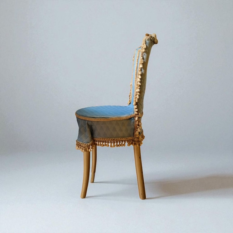 Style: This little chair has personality! A frivolous, utterly distinctive piece plucked straight from the fanciful dreams of a bohemian Parisian boudoir. An original dark bentwood bistro chair, the legs have been painted in a gold leaf paint to match the gold trim and tassels.