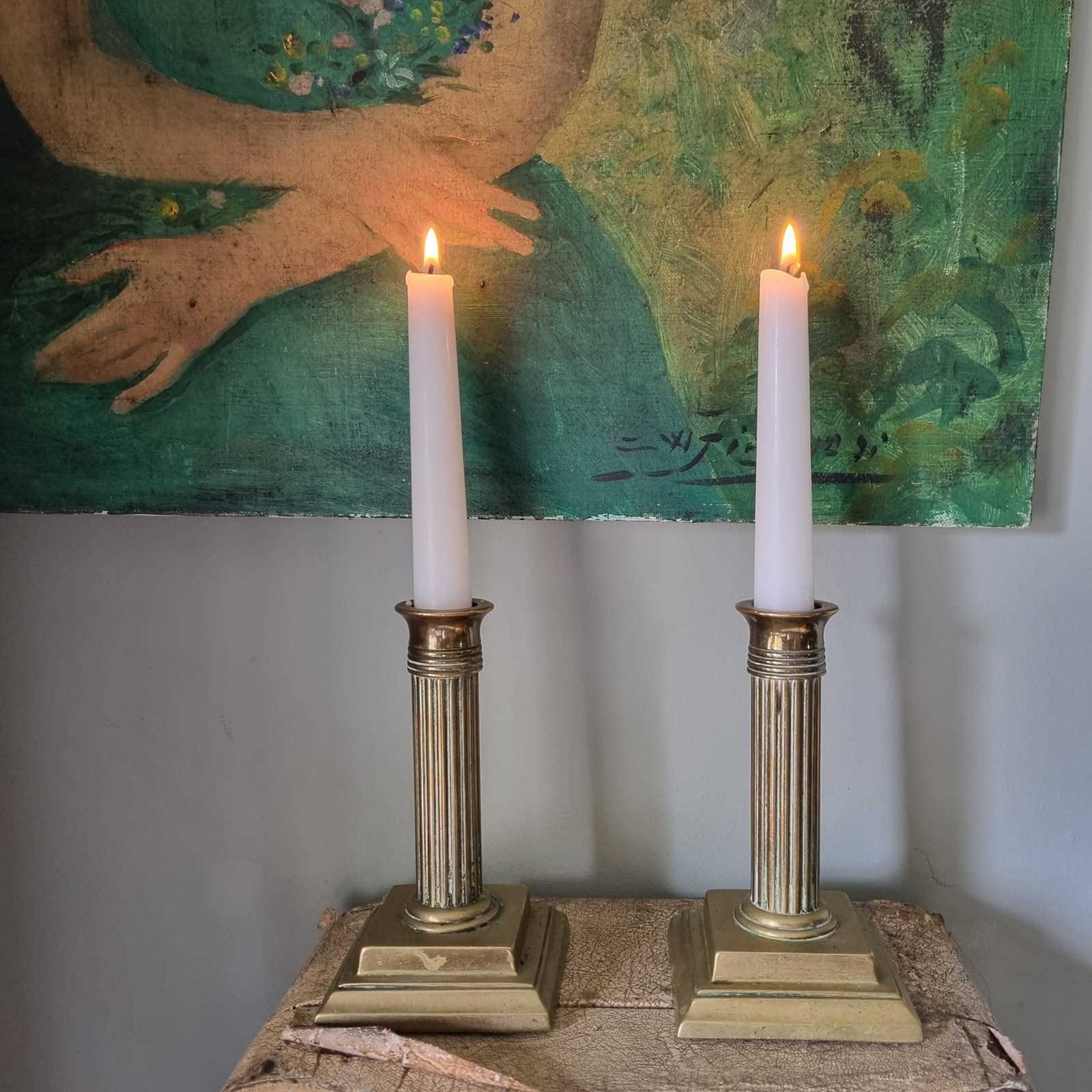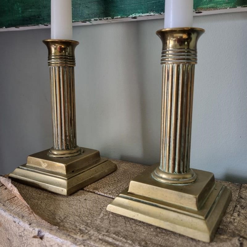Style: Charming, small Victorian brass candle holders in the Corinthian column style. The rich, unpolished patina adds character and warmth, making them ideal for creating a romantic ambiance on a mantlepiece or intimate dining table for two.