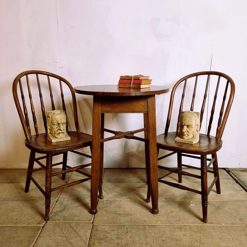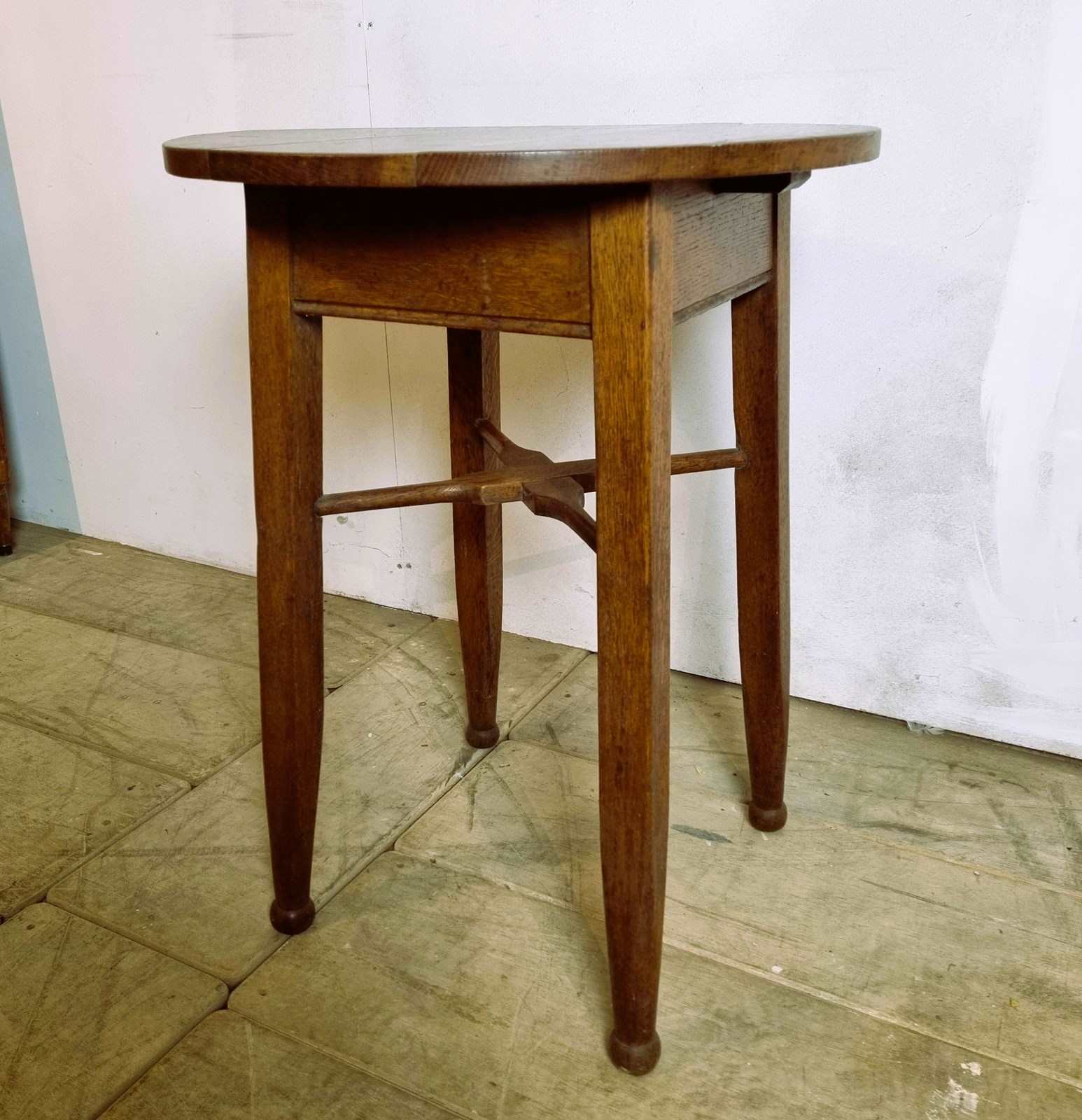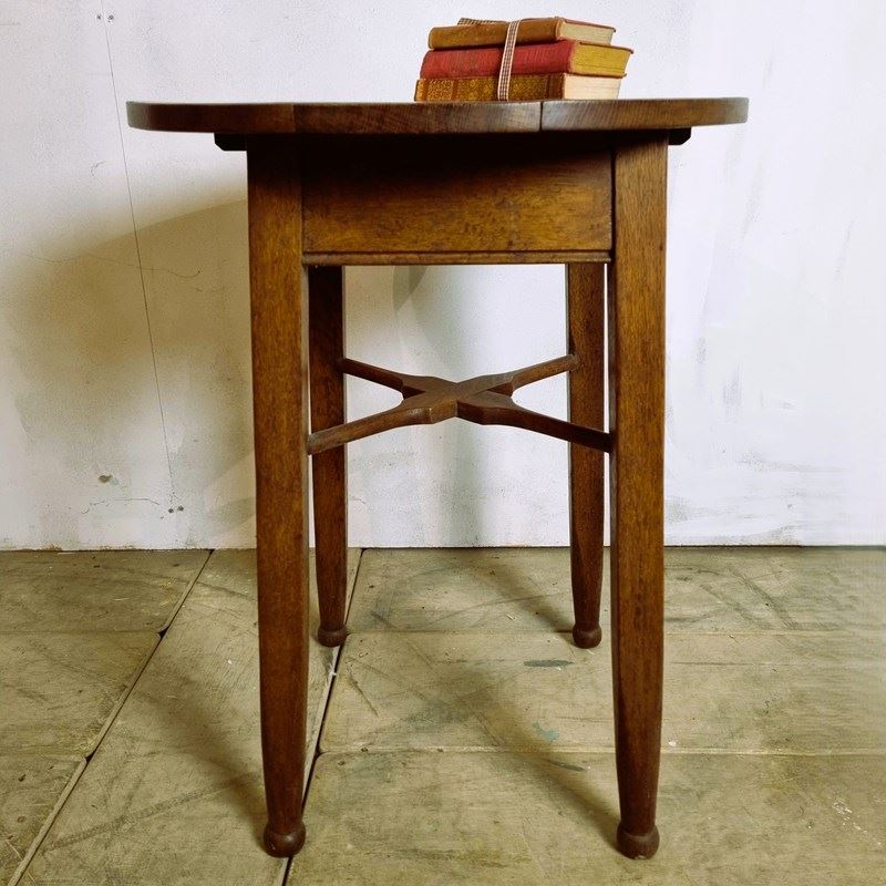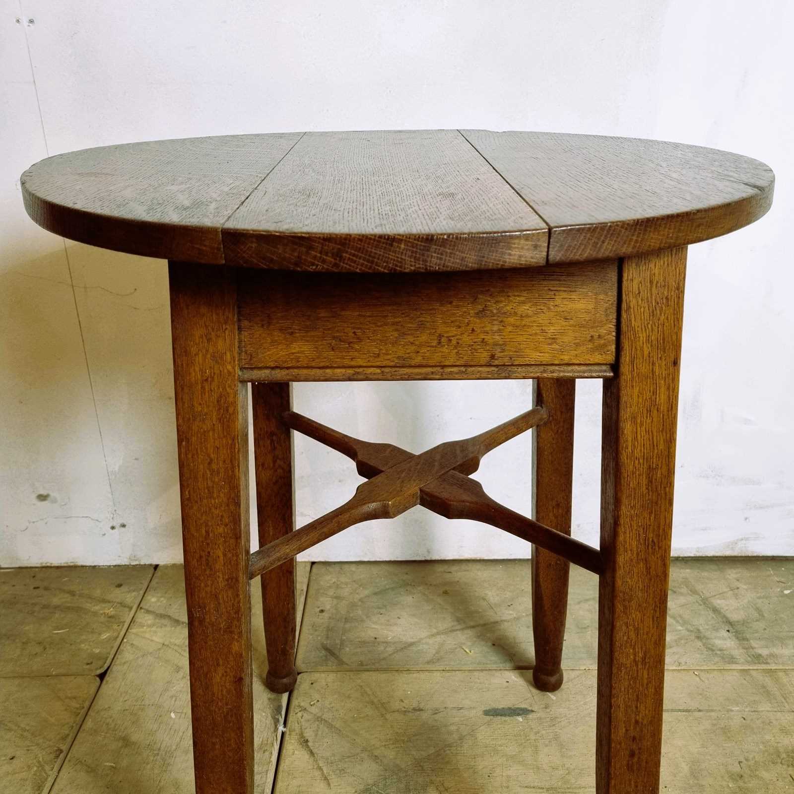 Style: Attributed to Gaskell and Chambers of Birmingham, this robustly constructed oak table epitomises the classic 'tavern table' style. It exhibits clear Arts and Crafts influences, visible in its unusual stylised cross stretcher and strong, tapering 'matchstick' legs. Finished in a warm golden oak patina, its versatile design makes it an attractive addition to any room, functioning perfectly as a bedside or lamp table, or even as a compact dining spot for one. Circa 1910.