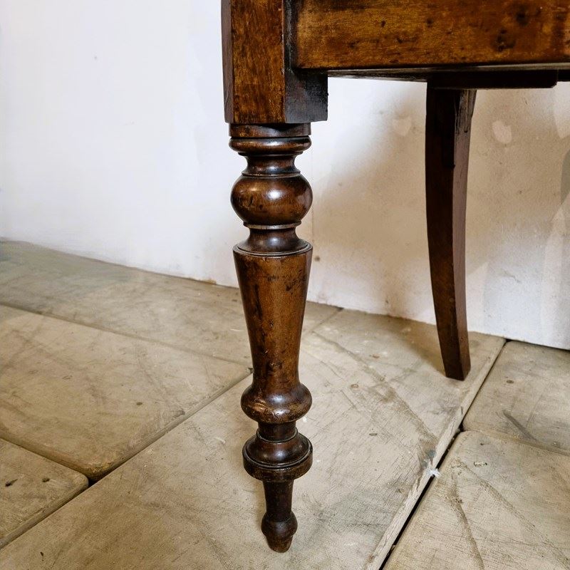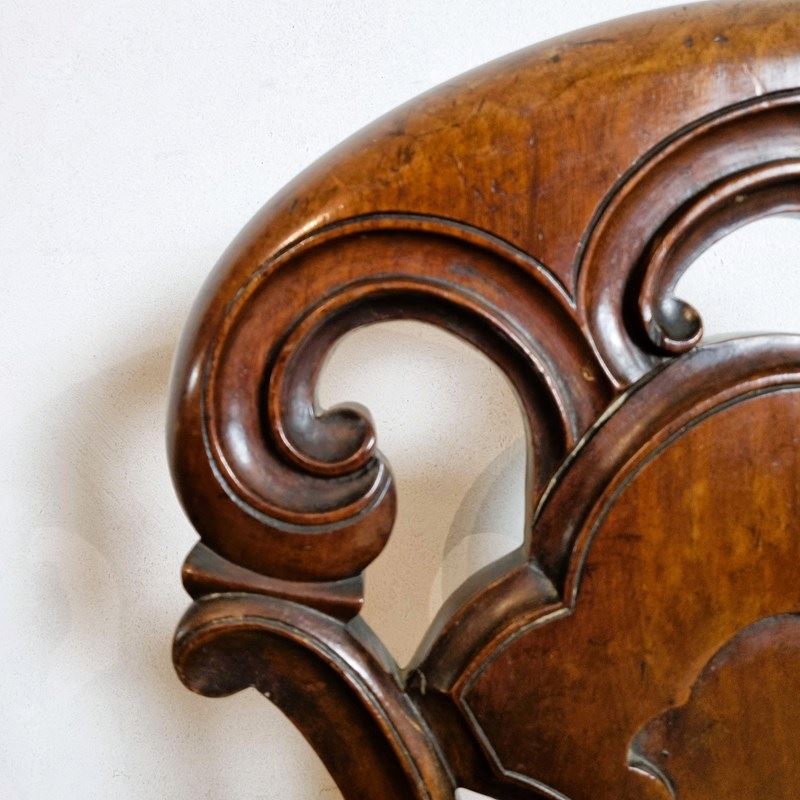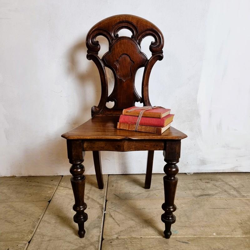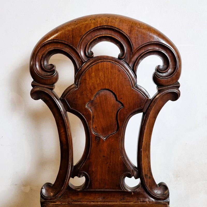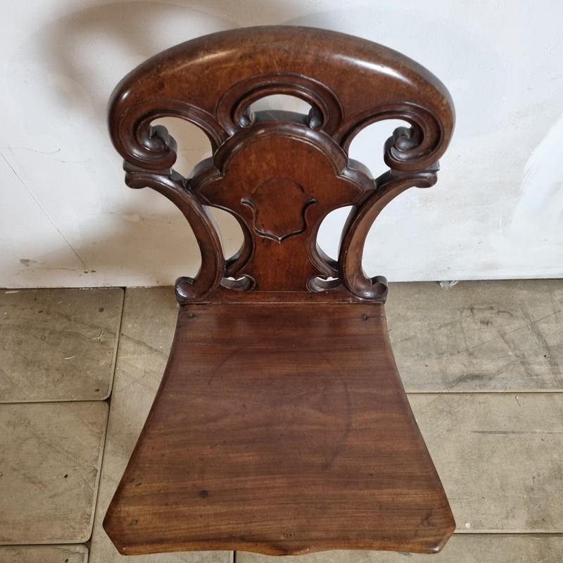 Style: Victorian‑era handsome hall chair, in deep mahogany. Its compact form is enlivened by a pierced backrest stamped with deep scrolling relief and a central recess shield shaped cartouche, giving a sculptural presence. The seat features a curved front edge, turned front legs and splayed rear supports. Solidly built with a warm, aged patina. There is a faint circular stain on the seat, which is reflected in the price. Height seat 43cm.
