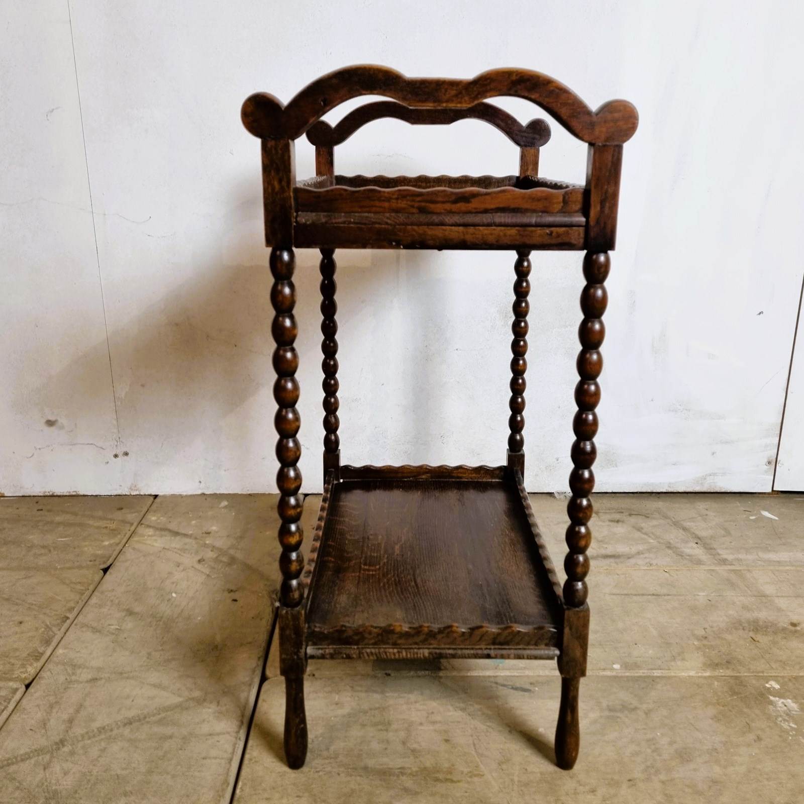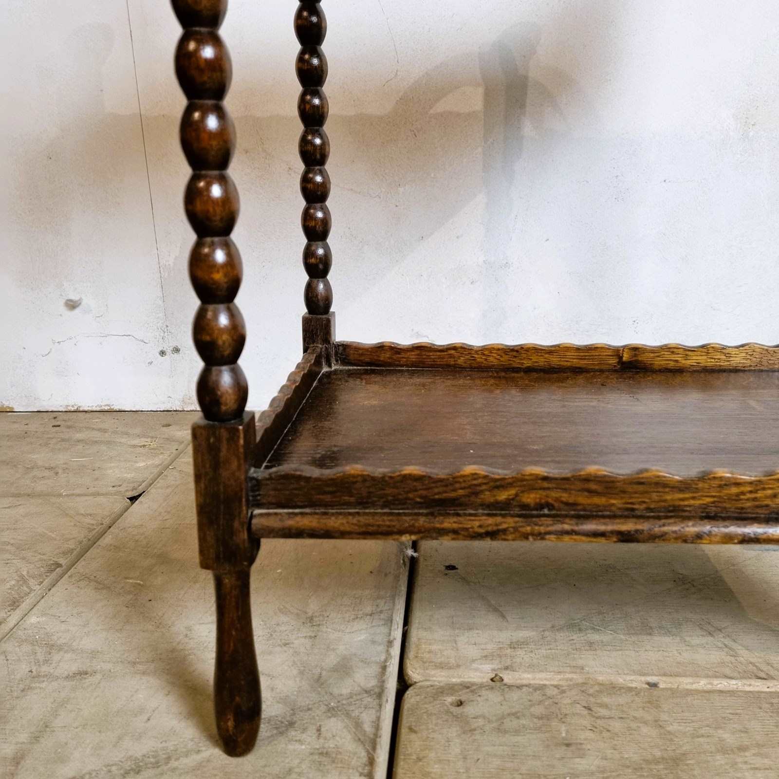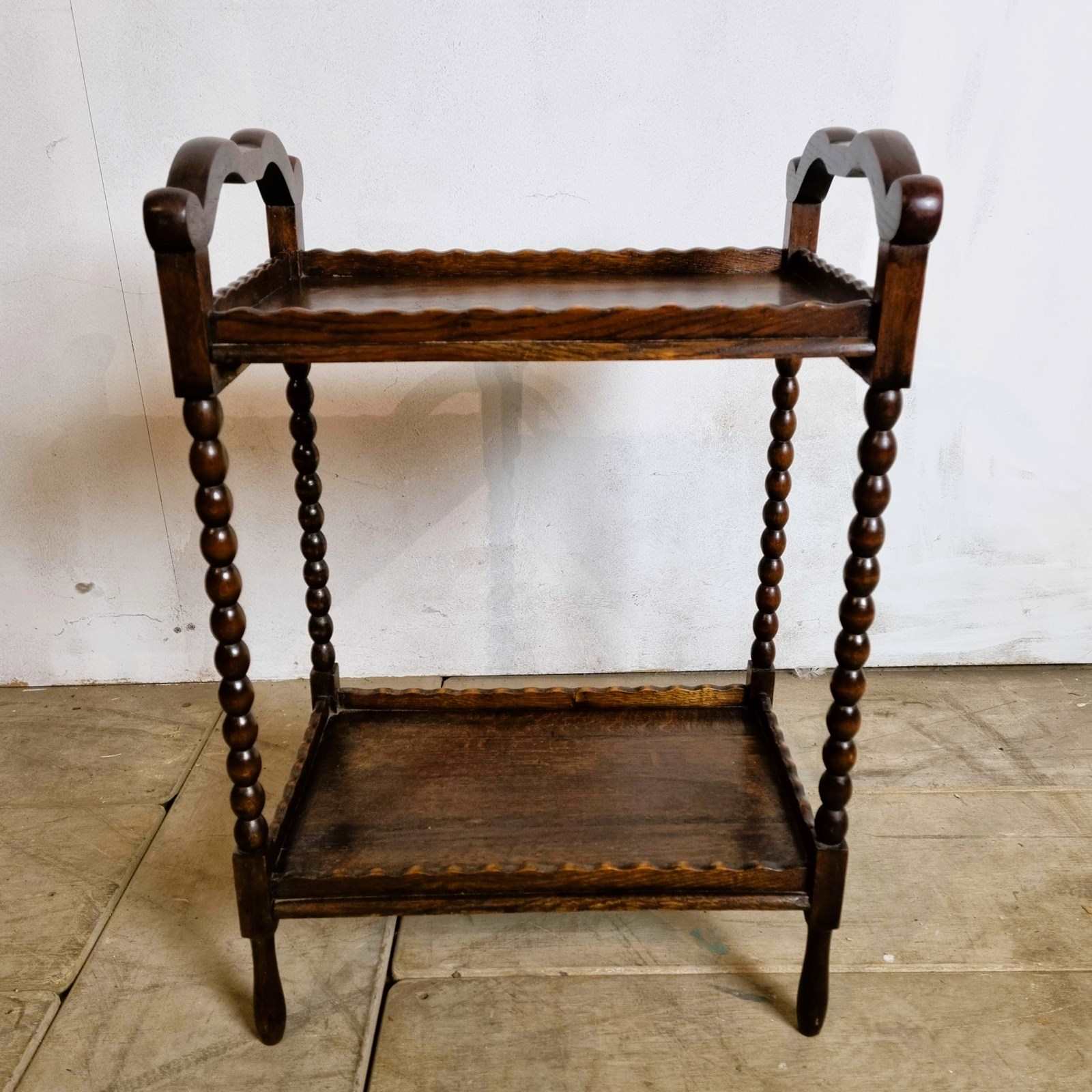 Style: English oak bobbin buffet two tier tea/cake table with beautiful curved top tier handles and wavy edging. A splendid patina, aged to a deep dark caramel with bobbin legs with slender turned feet. Circa 1930's.