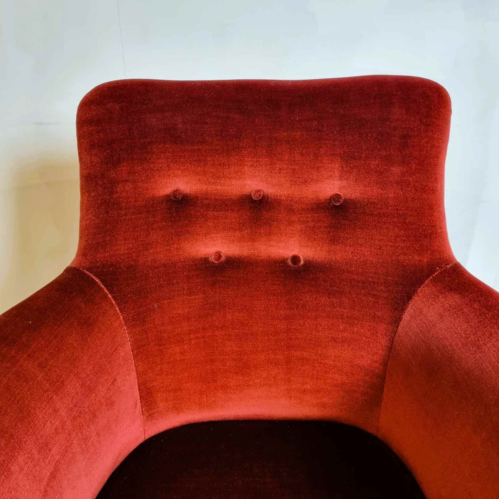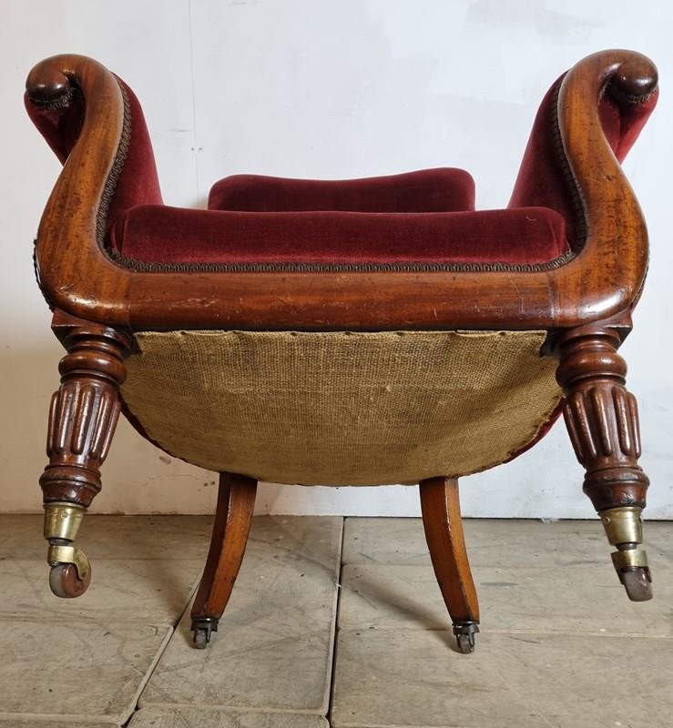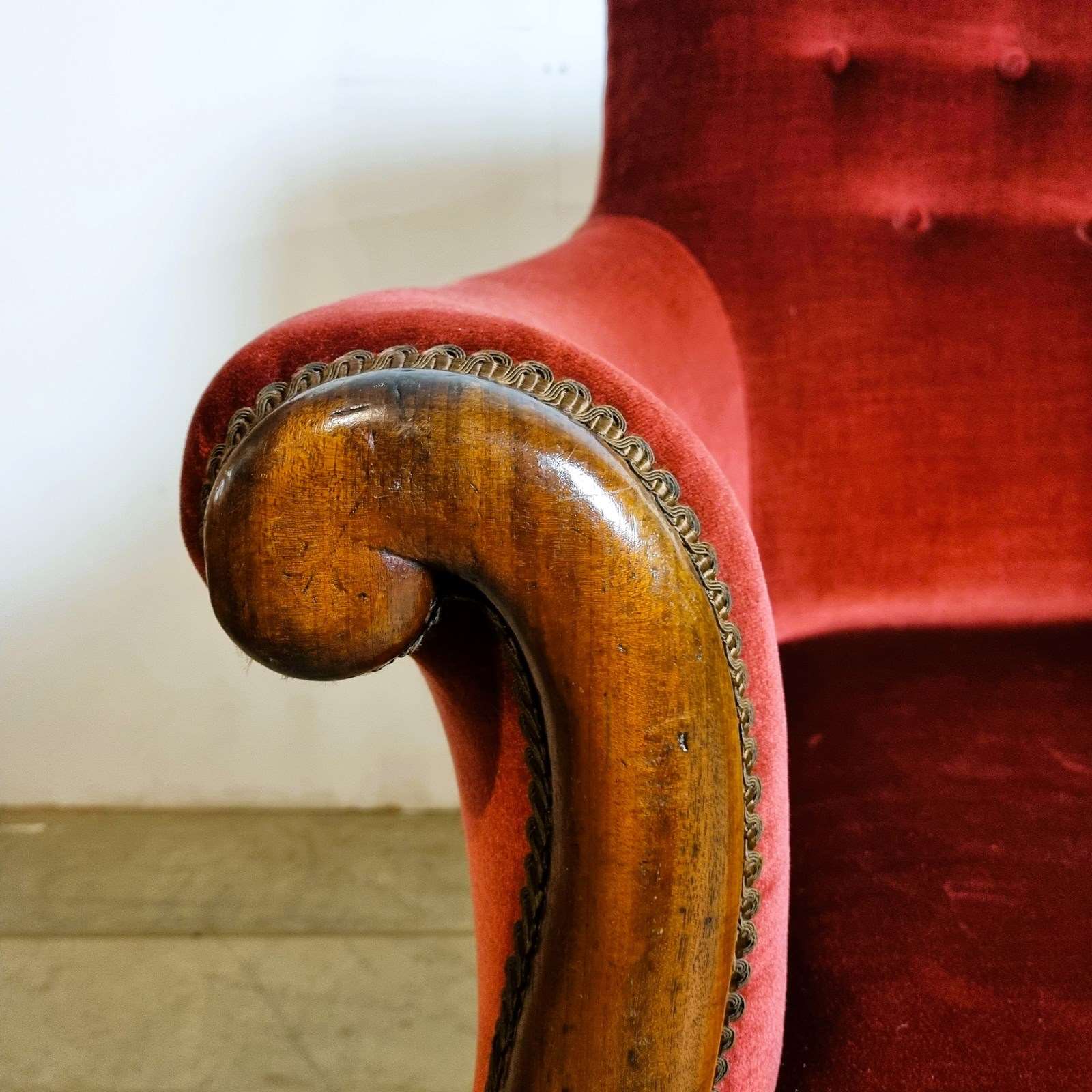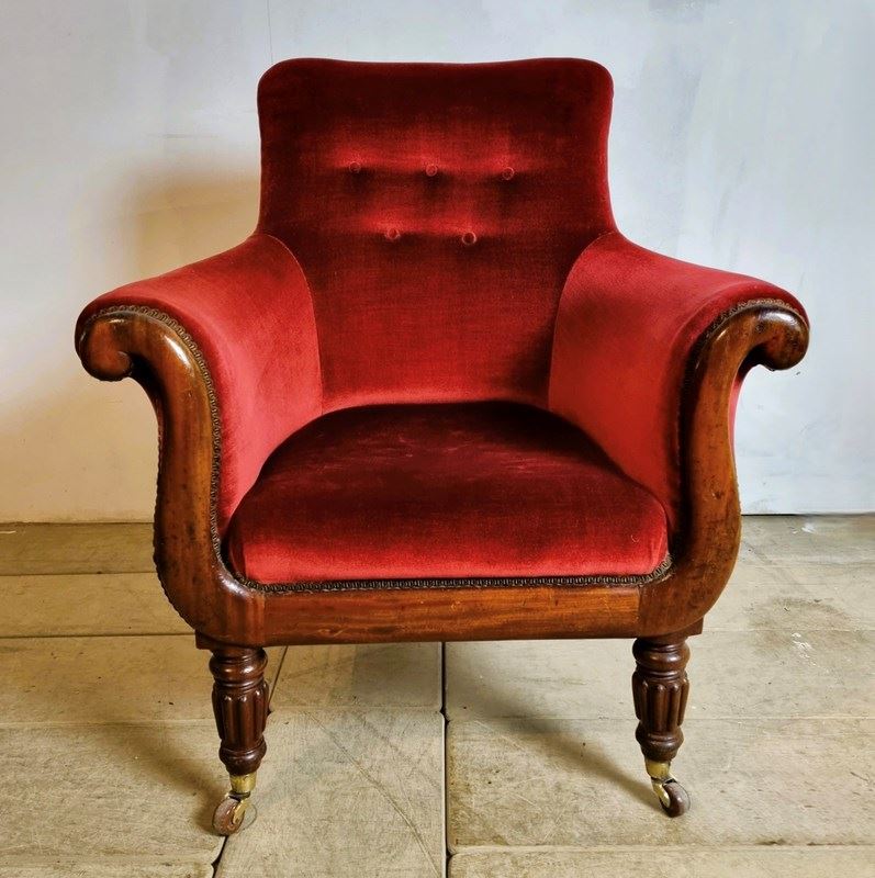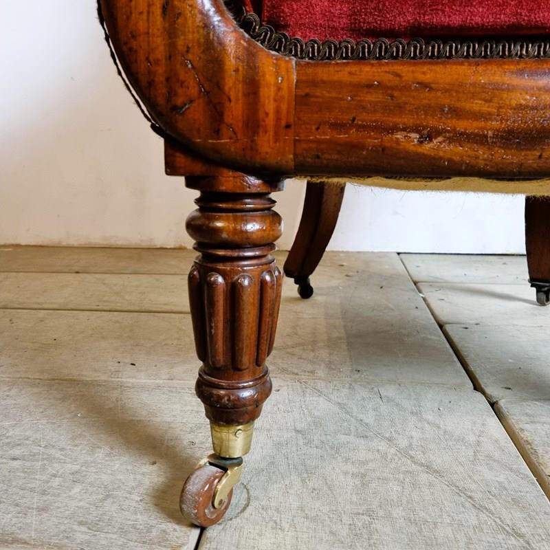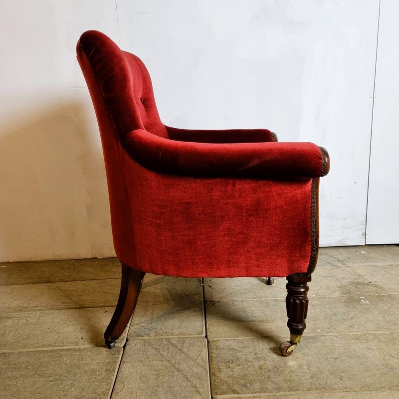 Style: This exquisite early 19th-century English Regency library armchair is a masterwork of craftsmanship, Handcrafted from rich mahogany and distinguished by its elegantly lyre-inspired frame. Resting on tall bulbous reed carved legs and fitted with sleek brass casters, its silhouette exudes refined symmetry. Later reupholstered in a rich crimson red velvet with button tufting back seat. In addition to the main measurements, the seat height is 41cm and depth seat 62cm.