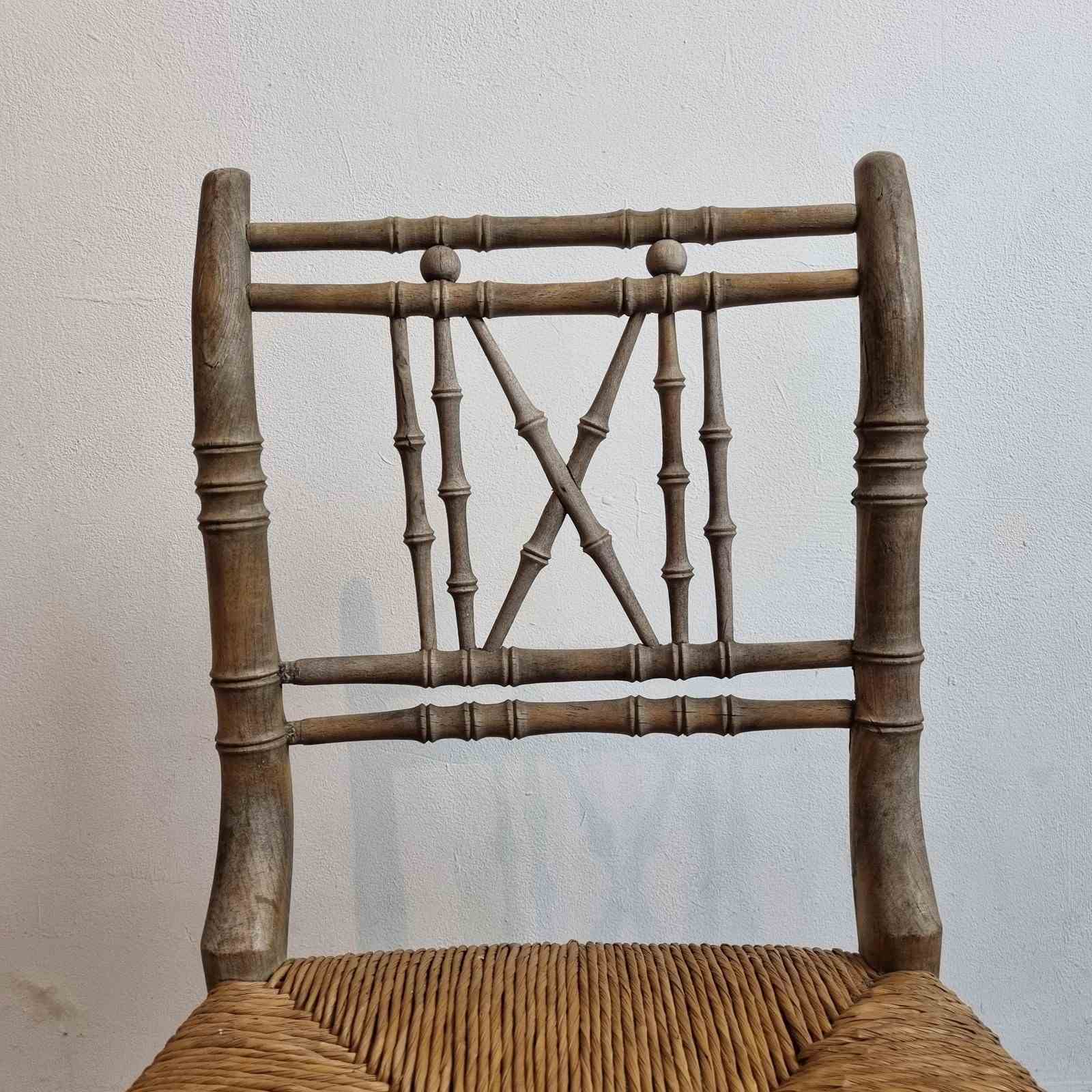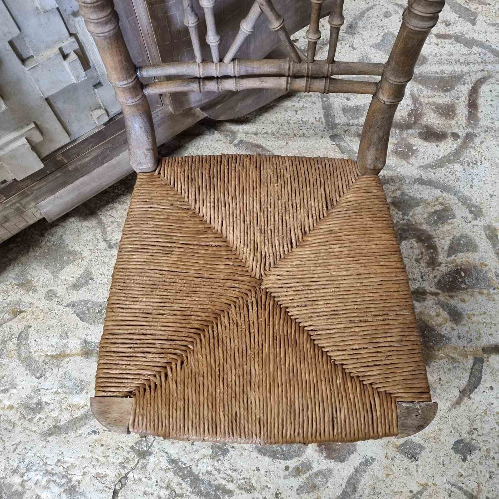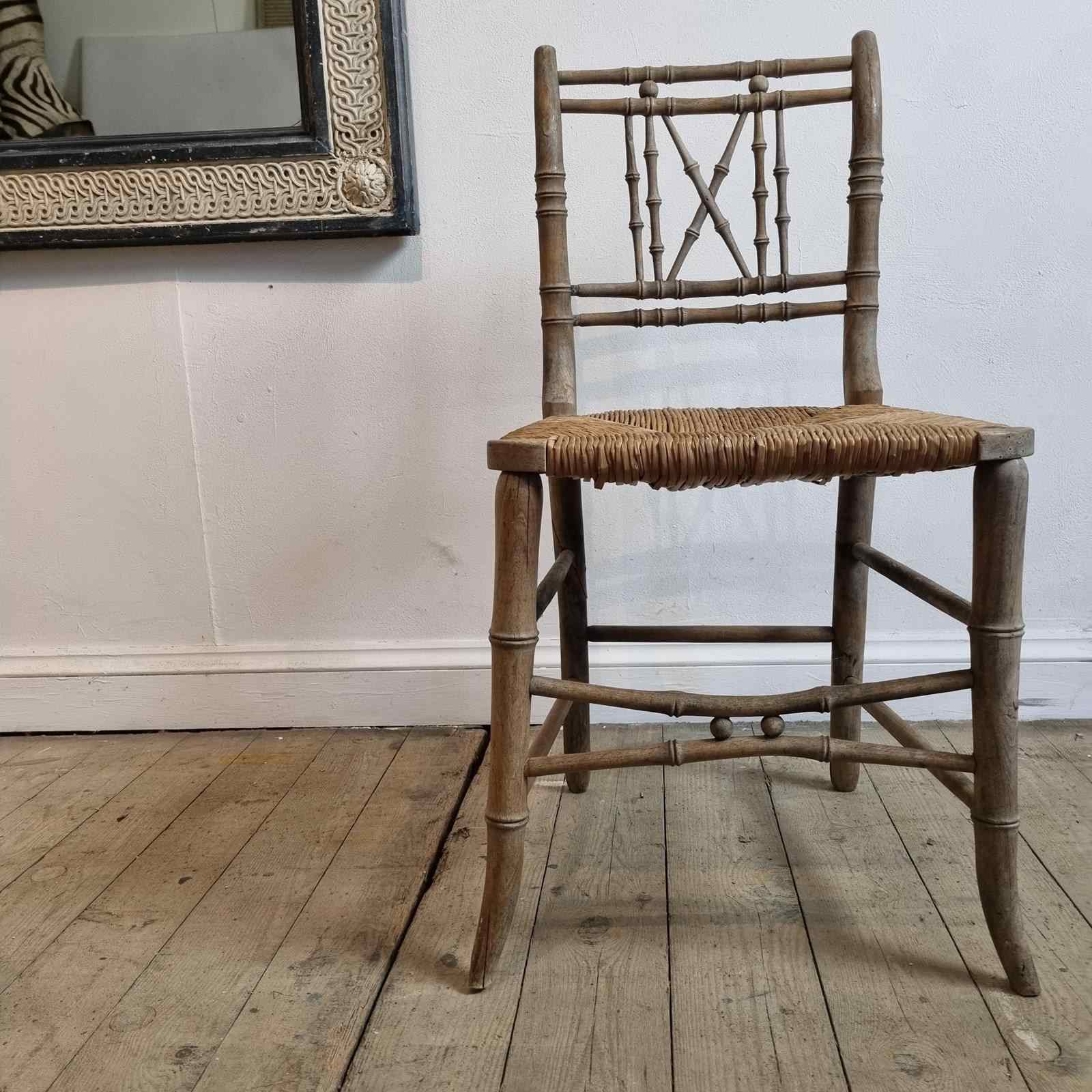 Style: A 19th-century occasional chair, distinguished by its faux bamboo finish and woven rush seat. The intricate, delicate spindle-turned work throughout the back, legs, and connecting stretchers creates a truly unique and graceful profile. Perfect for adding a touch of period charm to a hallway, bedroom, or kitchen.