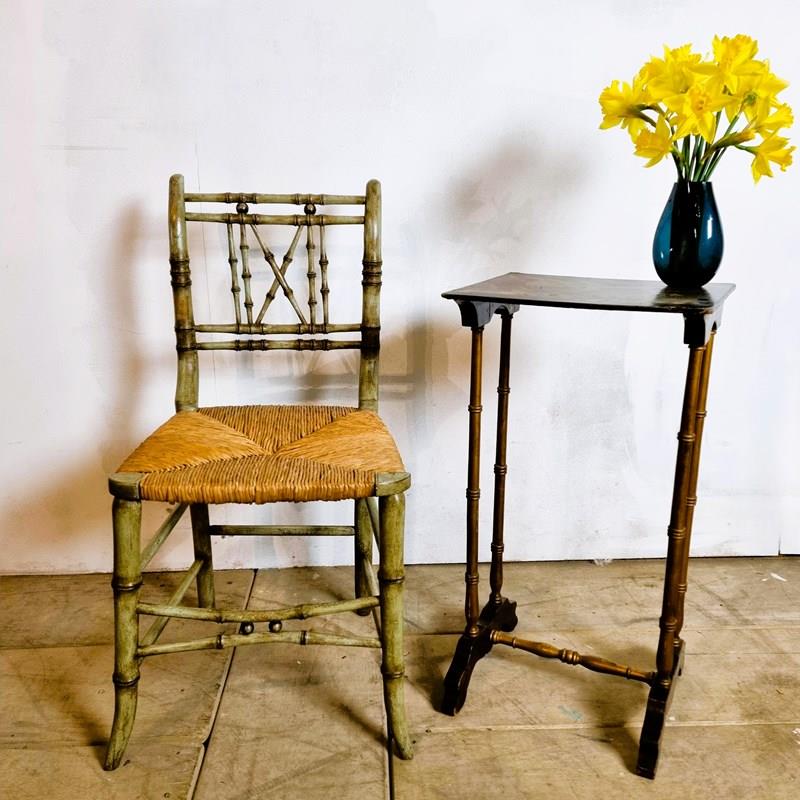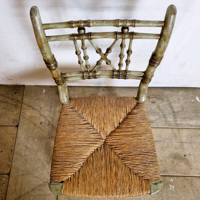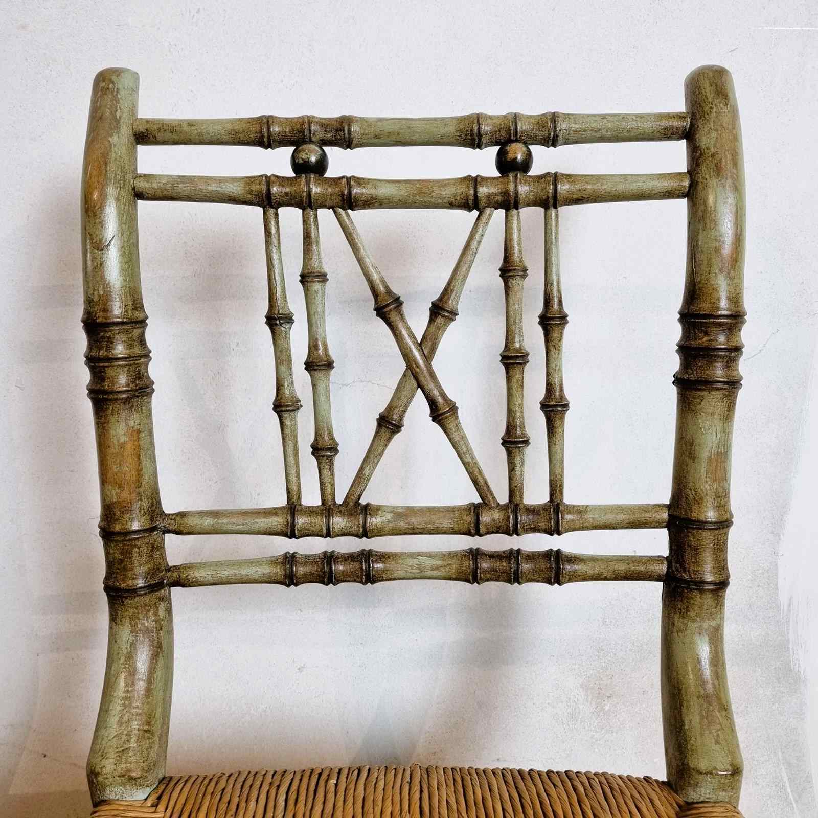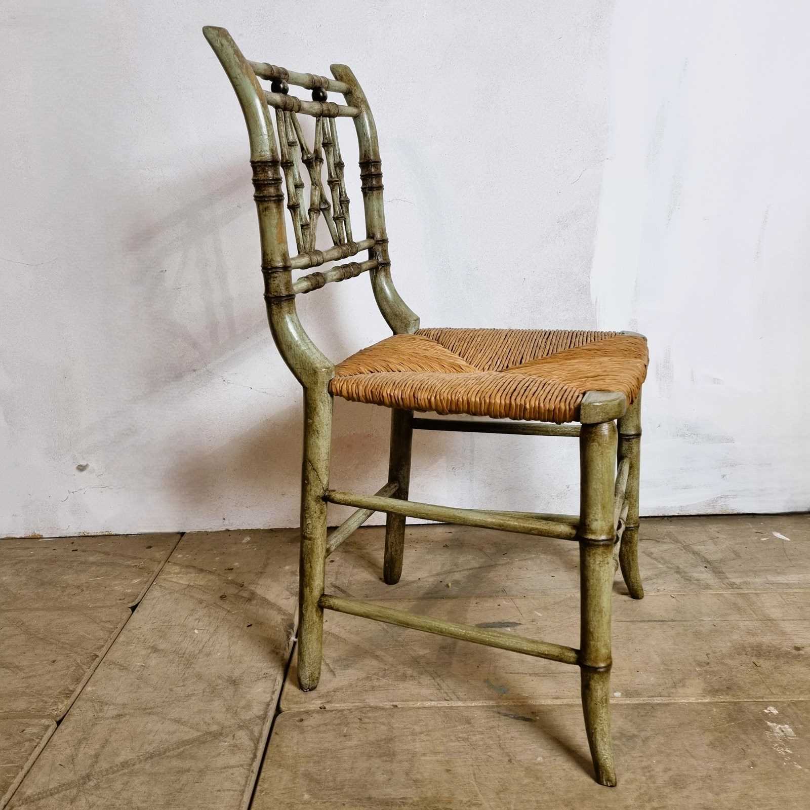 Style: A 19th-century painted sturdy occasional chair, distinguished by its wonderful faux bamboo finish in an unusual olive green with woven rush seat. The intricate, delicate spindle-turned work throughout the back, legs, and connecting stretchers creates a truly unique and graceful profile. Perfect for adding a touch of period charm to a hallway, bedroom, or kitchen. Height seat 44cm