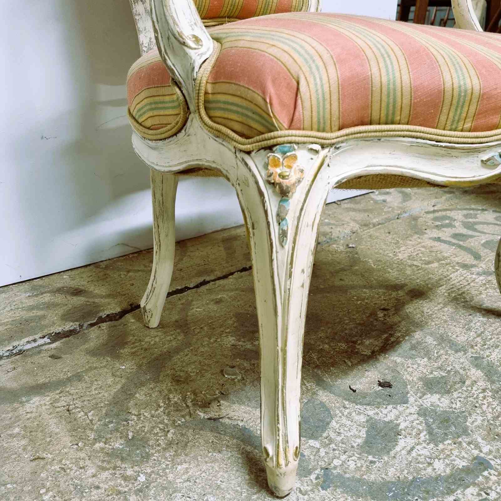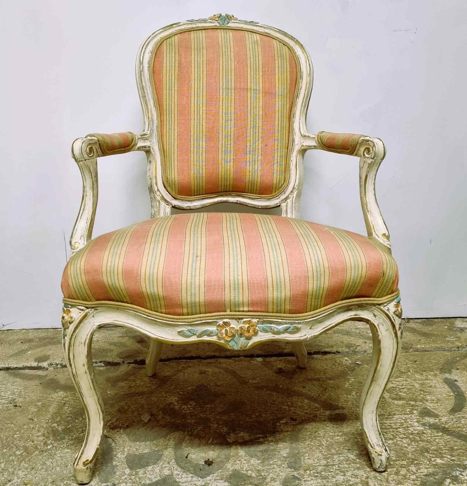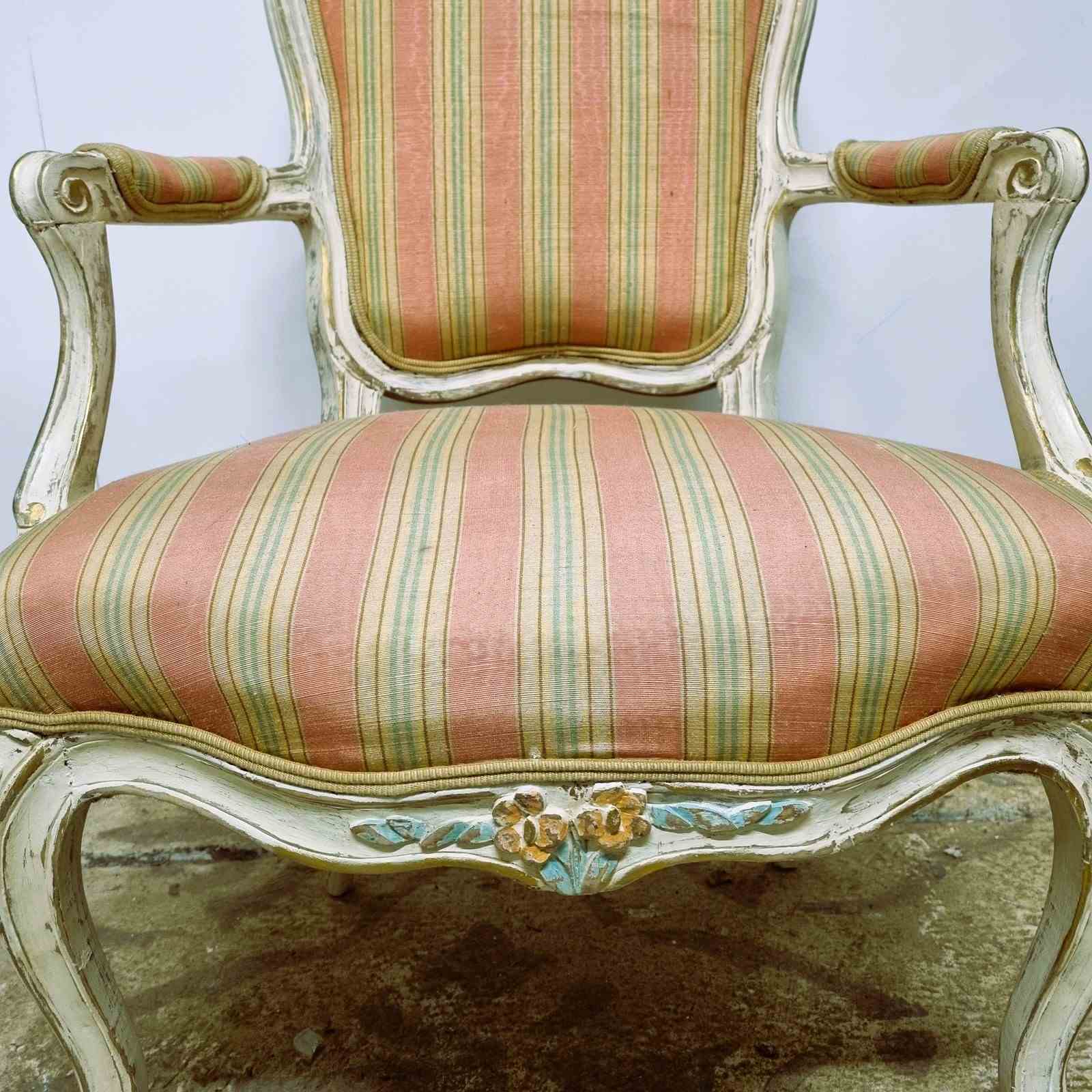 Style: Elegant French open armchair, crafted from beechwood and finished in an off‑white paint that highlights delicately carved and painted floral motifs with subtle gilt accents. The backrest is sculpted and upholstered, crowned by a carved floral centre piece. Open arms frame plush striped upholstery and terminate in graceful scroll‑carved details. The generous, supportive seat is raised upon classic cabriole legs. Upholstery combines pale coral and teal stripes, finished with a refined pale gold trim. Height of seat is 40cm.