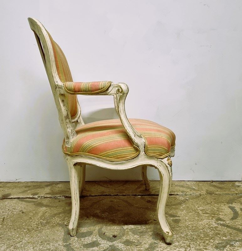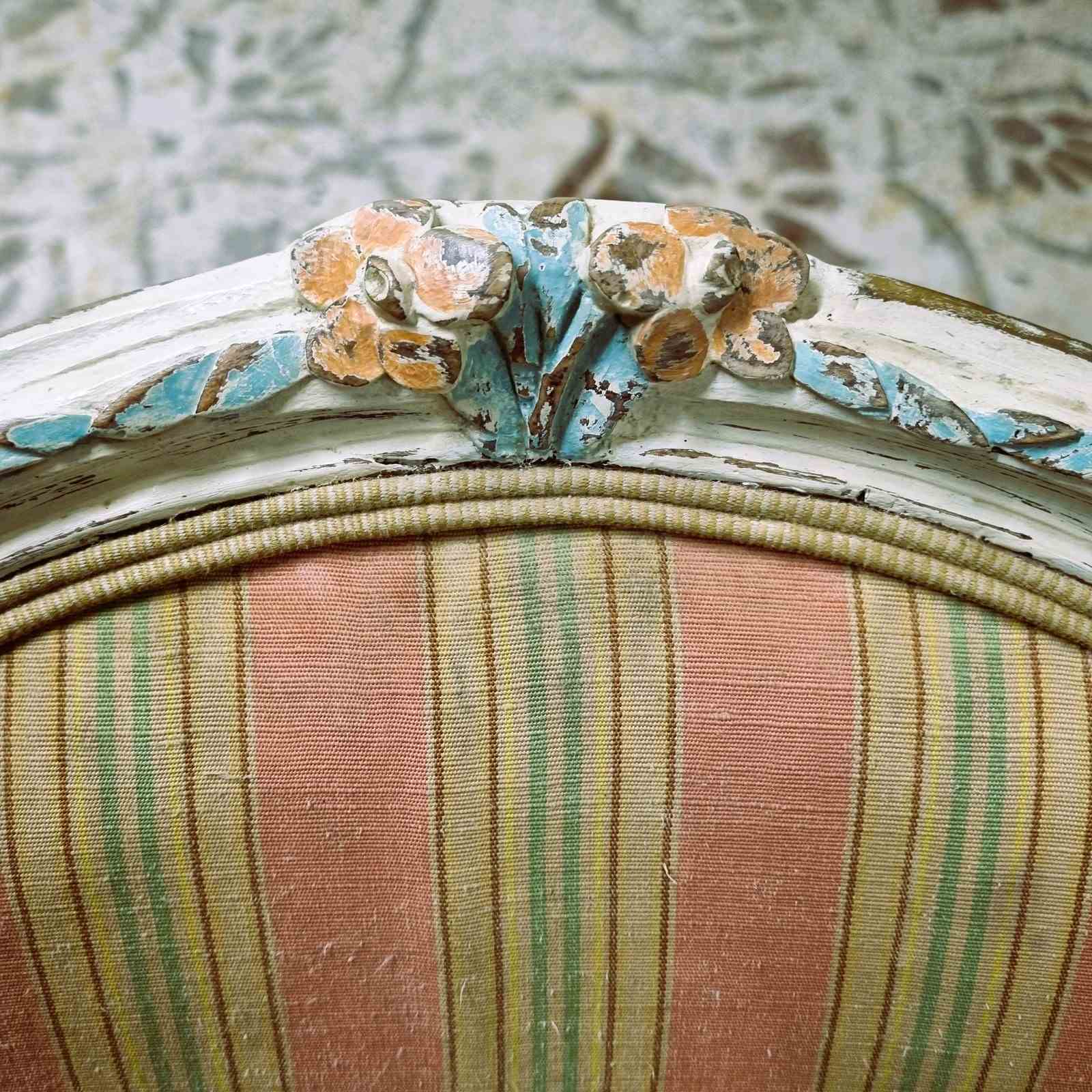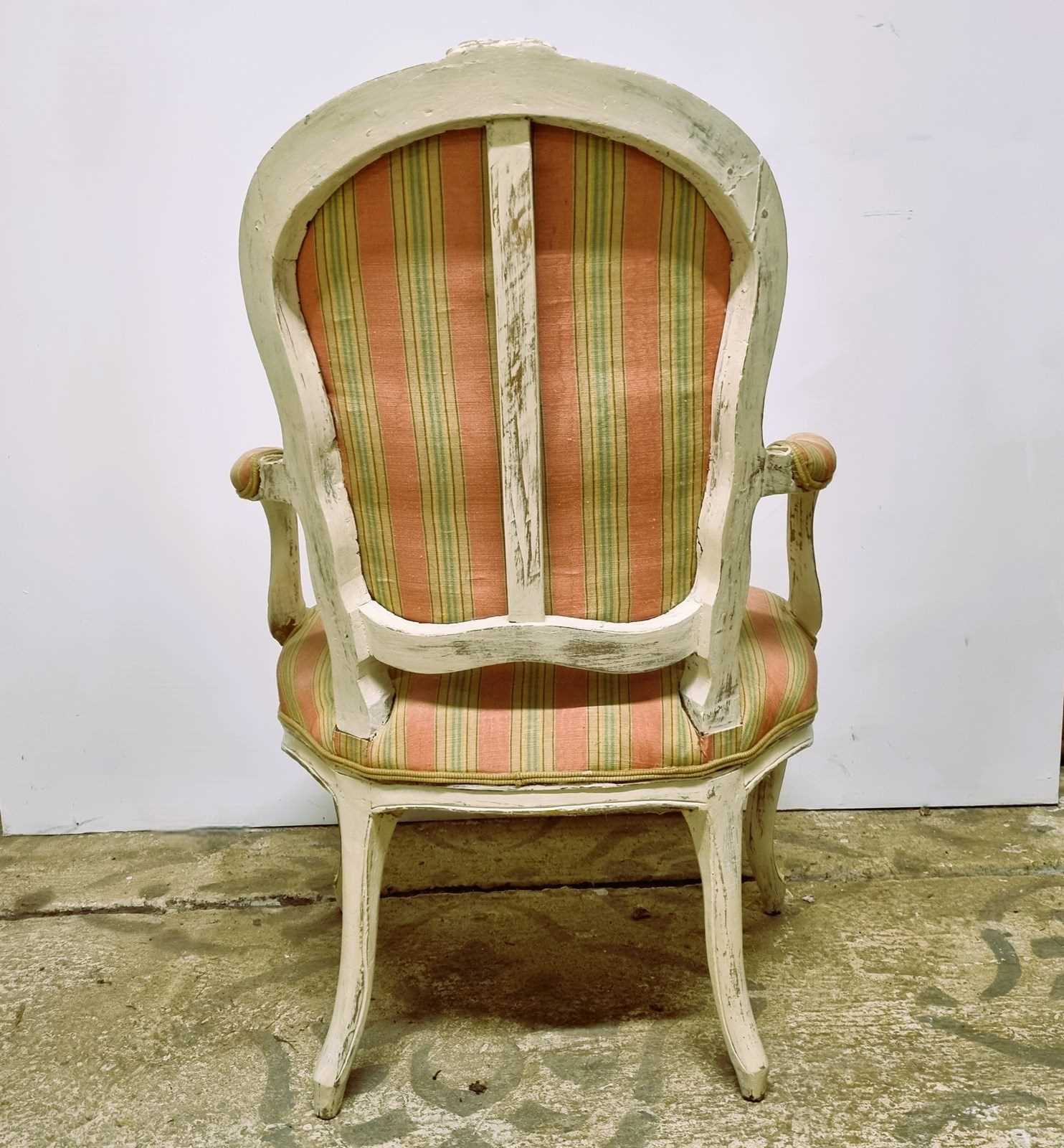 Style: Elegant French open armchair, crafted from beechwood and finished in an off‑white paint that highlights delicately carved and painted floral motifs with subtle gilt accents. The backrest is sculpted and upholstered, crowned by a carved floral centre piece. Open arms frame plush striped upholstery and terminate in graceful scroll‑carved details. The generous, supportive seat is raised upon classic cabriole legs. Upholstery combines pale coral and teal stripes, finished with a refined pale gold trim. Height of seat is 40cm.