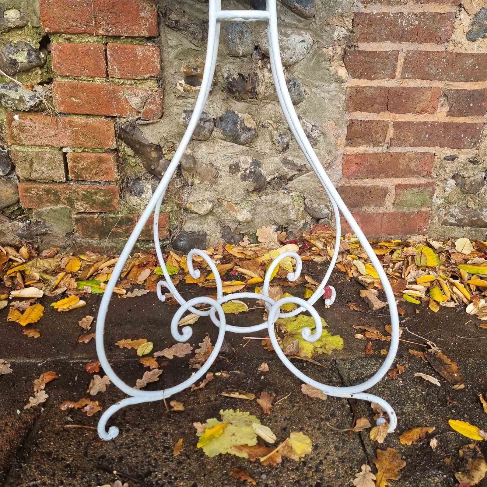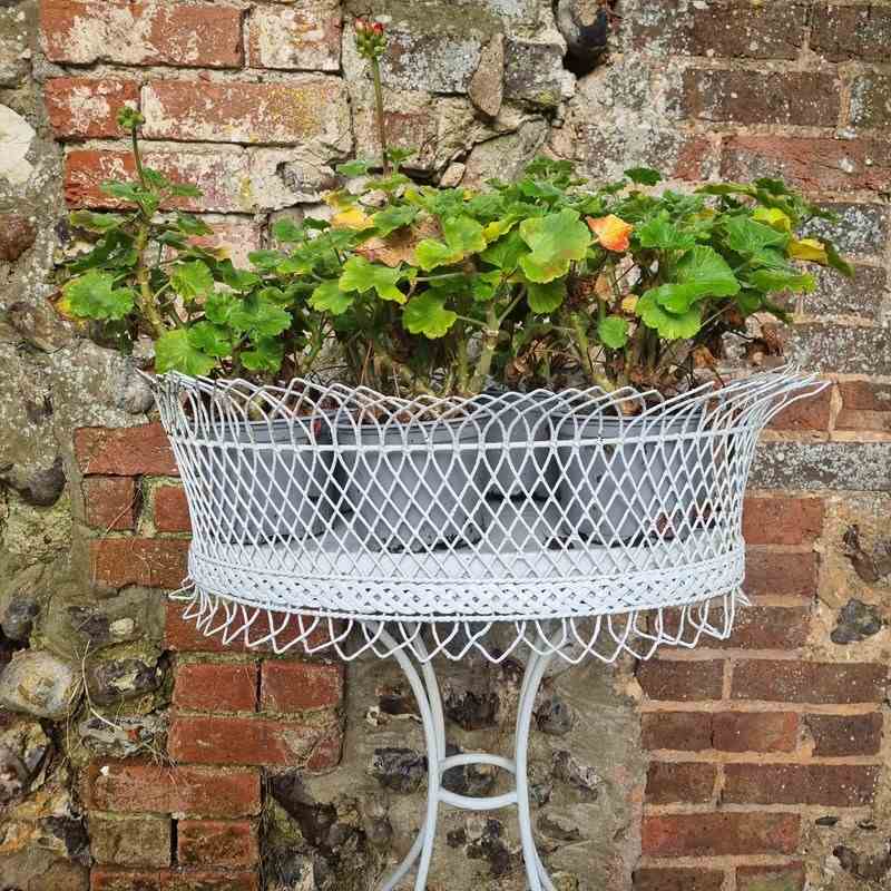 Style: This beautiful elegant jardiniere features fine wirework construction, with a later added interior wooden support for plant pots, upheld by a classic wrought iron tri-form base. Finished in white, the piece shows characteristic wear indicative of age and outdoor exposure, including some expected damage to the delicate wire detailing.
