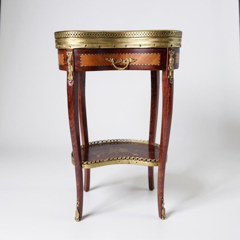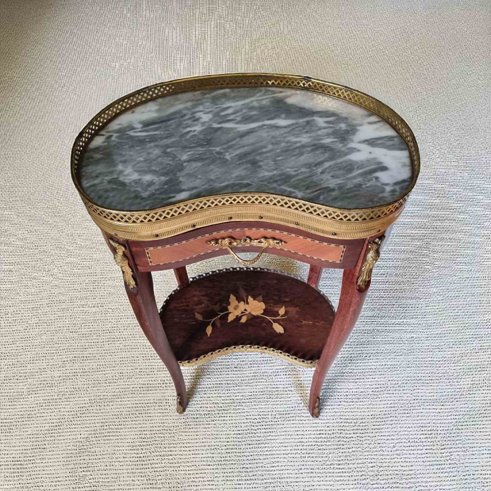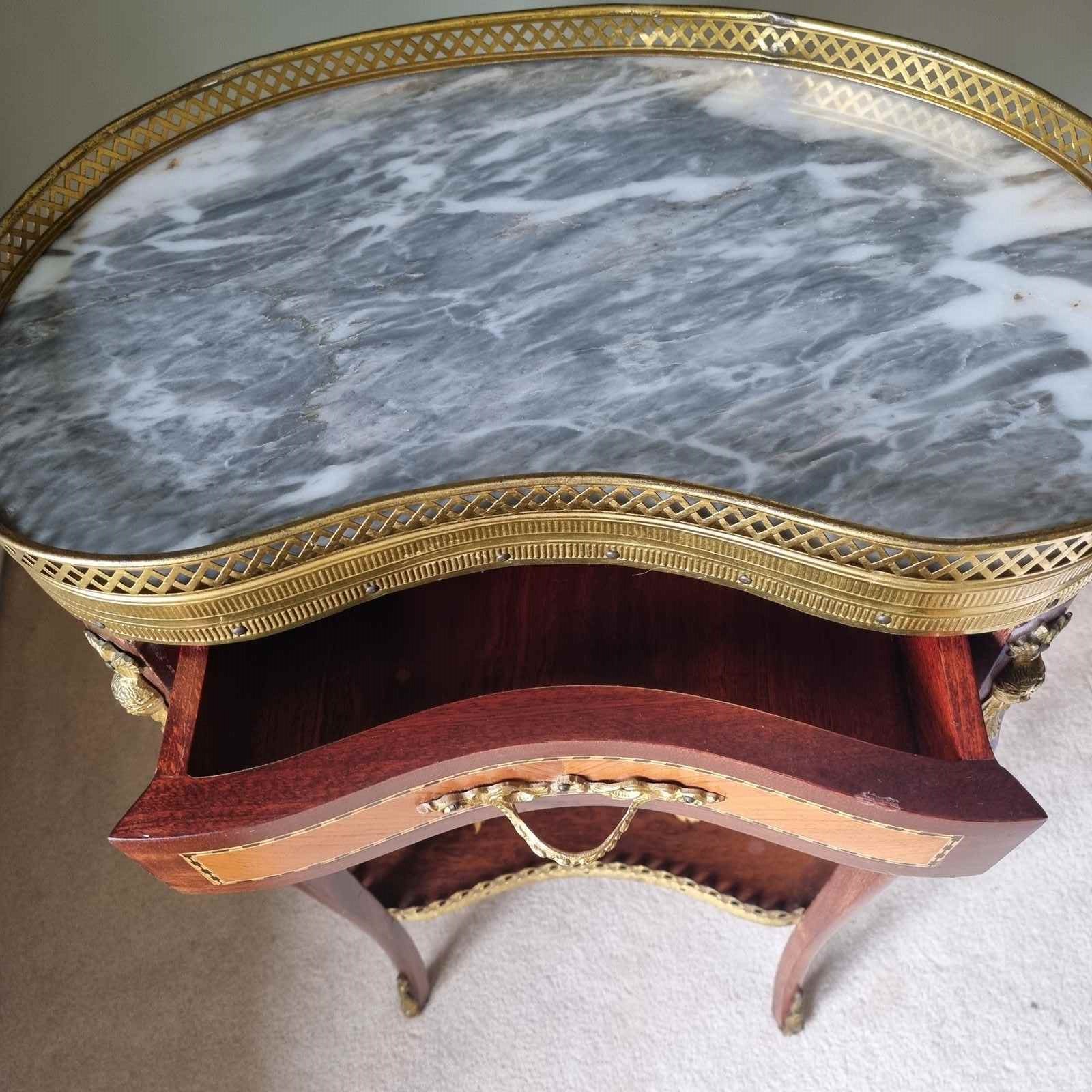 Style: An elegant 1930s kidney-shaped side table crafted from charming mahogany with satinwood inlay. Features a luxurious marble top, pretty pierced gilt galleries, and decorative ormolu mounts. The lower tray showcases exquisite floral marquetry, complemented by graceful curved legs with ormolu toe mounts. Includes one drawer. Gilt tarnishing consistent with age.