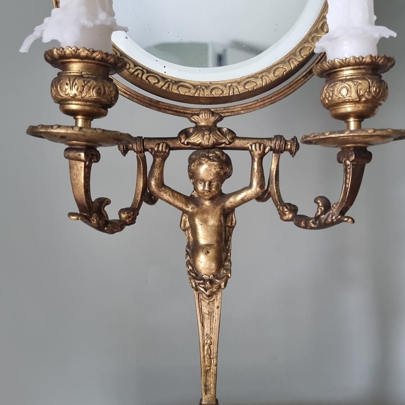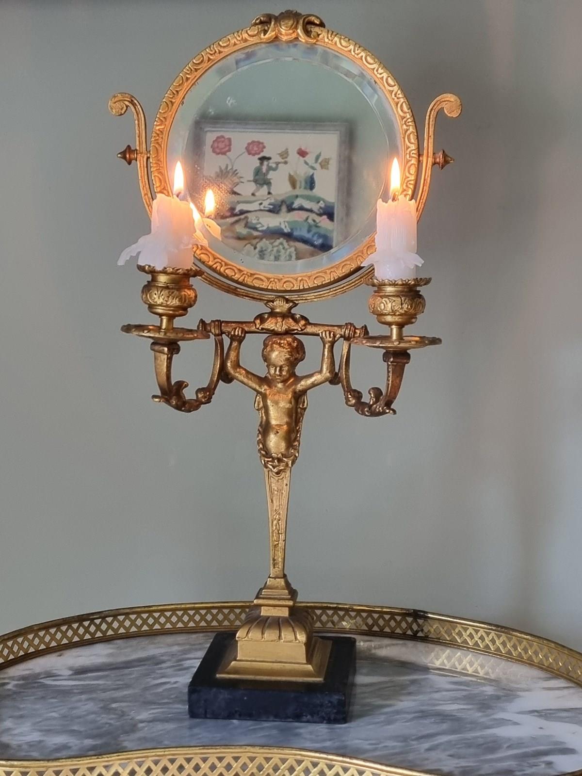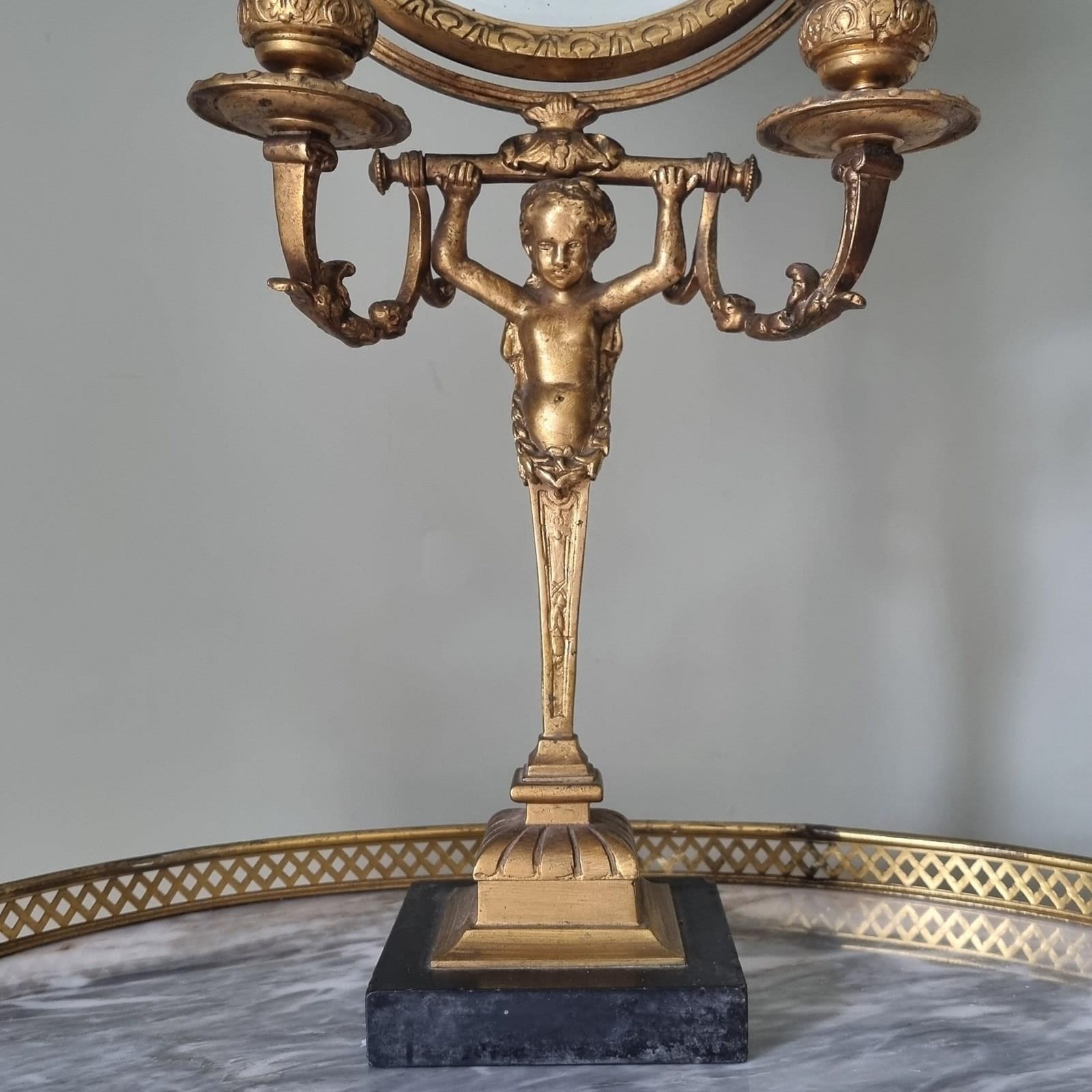 Style: Elegant French 19th century Vanity Mirror. This exquisite piece features a beautifully sculpted putto supporting the mirror frame from a classical plinth, flanked symmetrically by integrated candle sconces. It rests upon a distinguished black marble base.