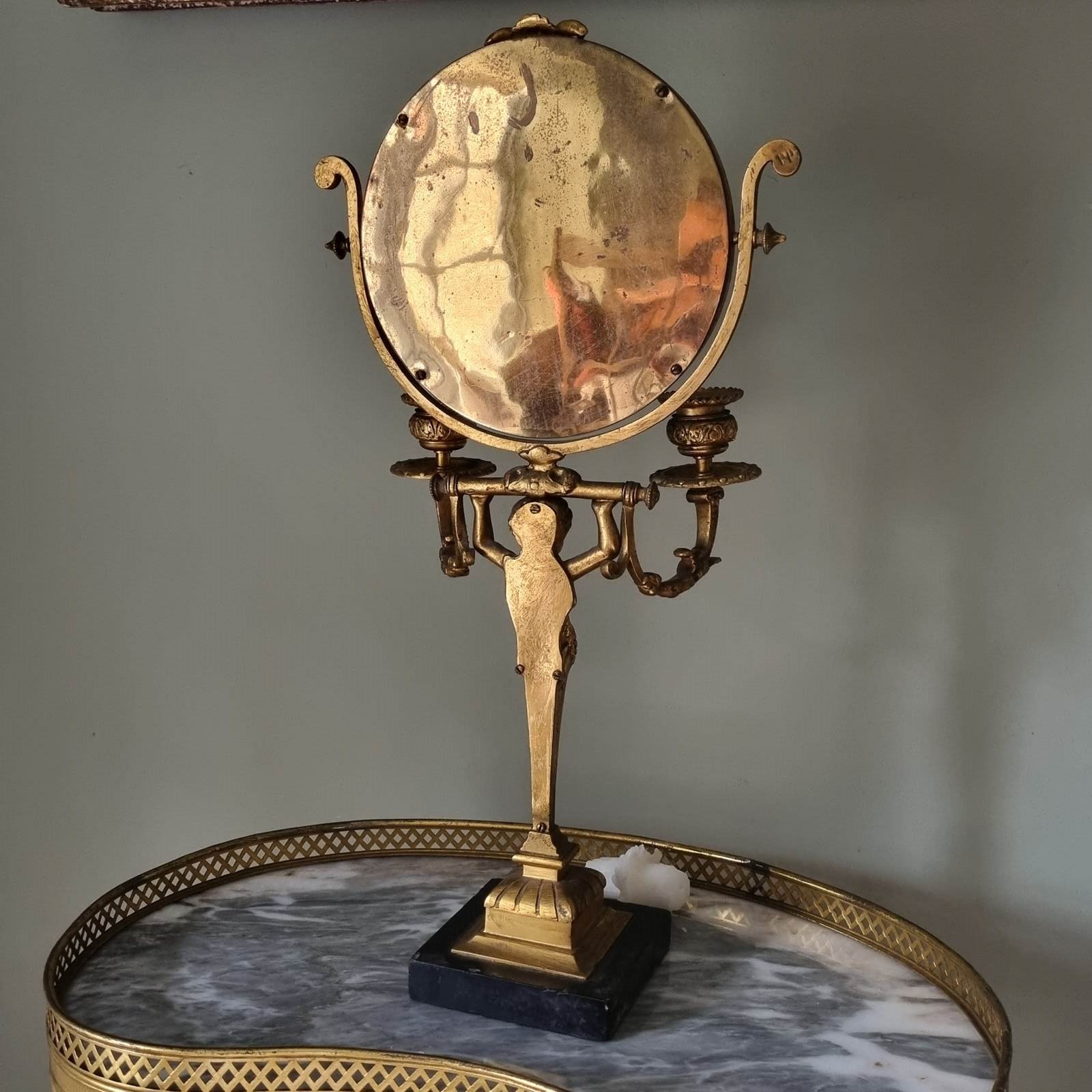 Story: Gracing dressing tables throughout the 18th and 19th centuries, French gilt bronze table swivel mirrors were exquisite examples of decorative artistry. These ornate pieces were lavishly carved and gilded, showcasing bronze's dual virtues: its enduring strength and its remarkable capacity for intricate detailing. Their signature adjustable swivel mechanism made them as practical as they were beautiful.