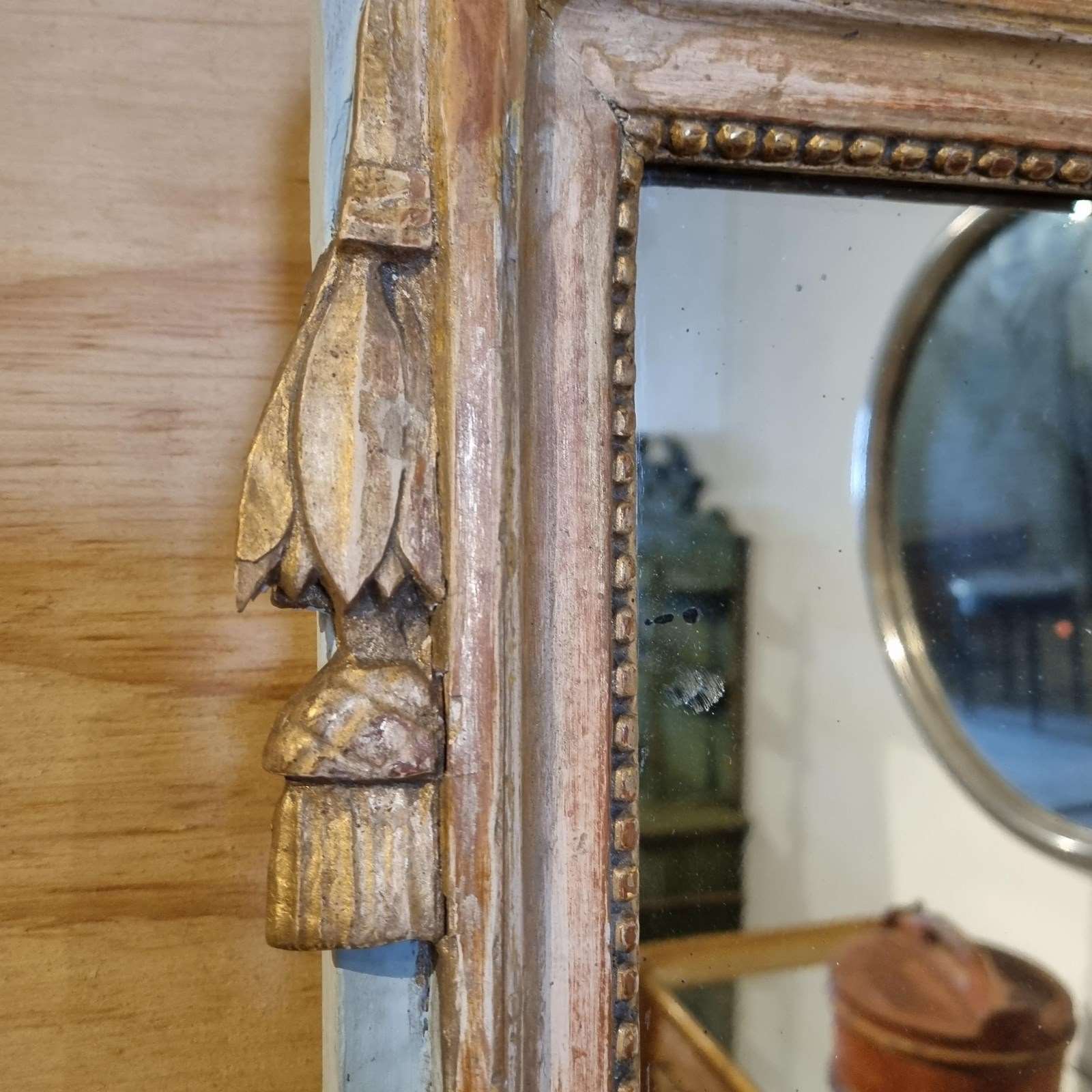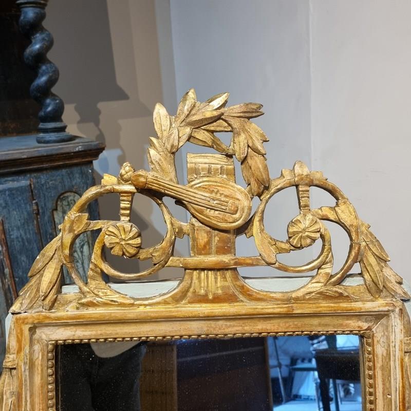 Style: Crowning the elegant rectangular frame is an intricately carved crest, with a focal melodic musical instrument motif, floral garlands, and laurel leaves—elements traditionally symbolising union, harmony and eternal love. Framed by a back border of later painted pale blue, the delicate beaded detailing along the inner border further enhances its refinement, embodying the timeless elegance characteristic of the Louis XVI style.