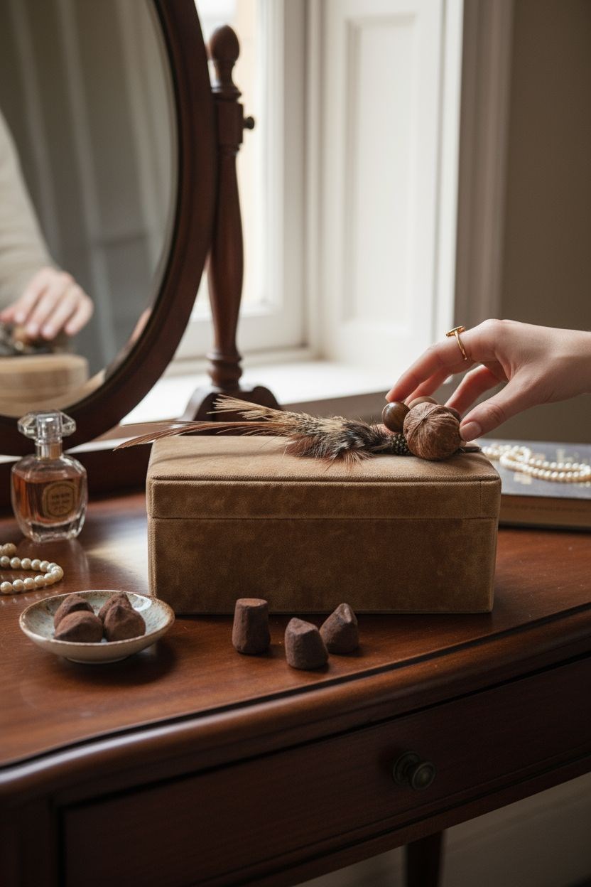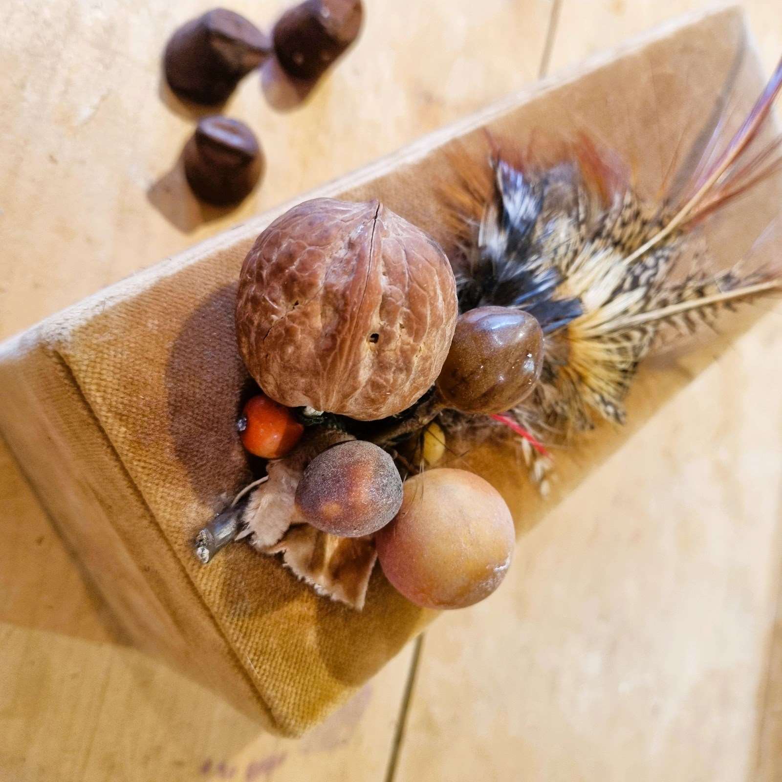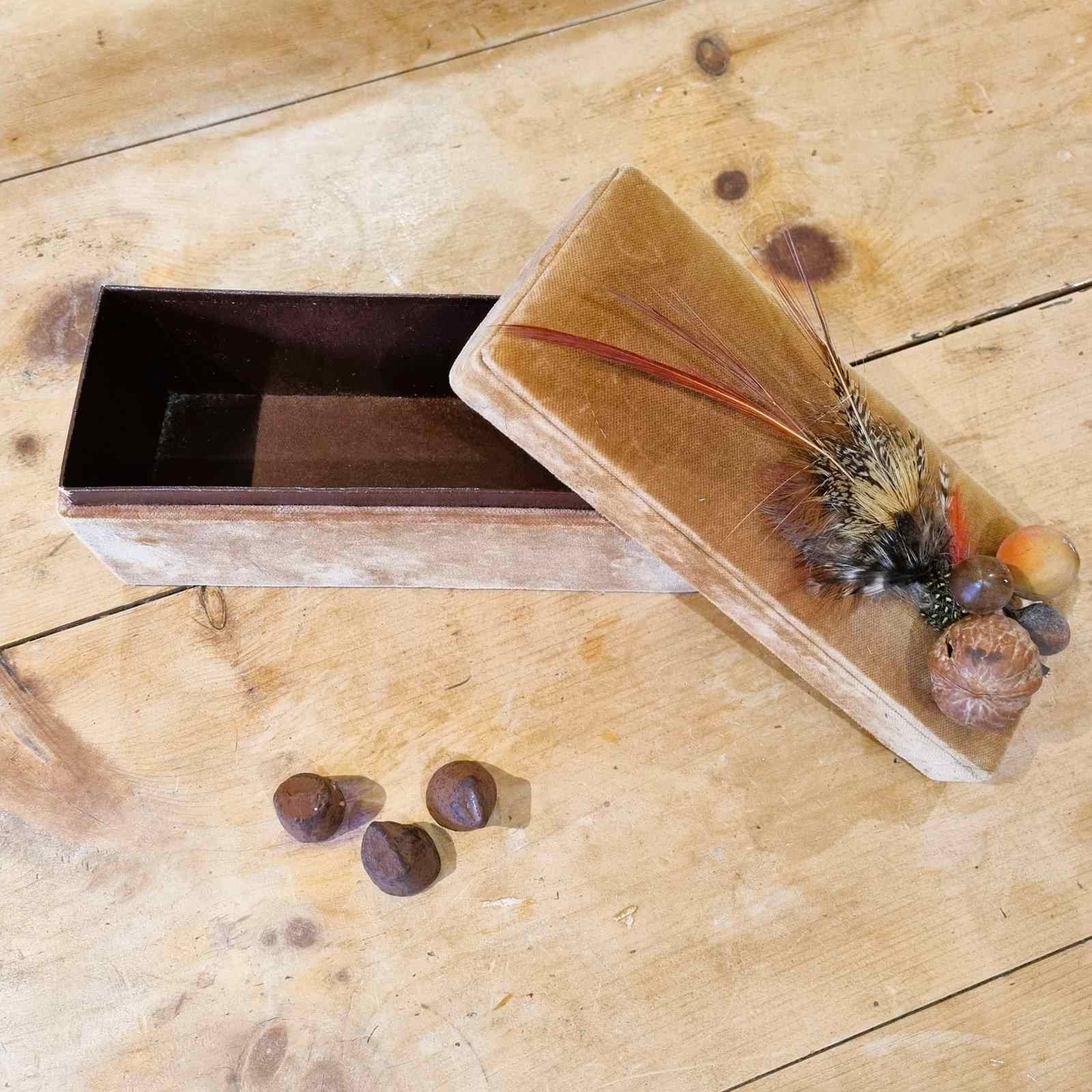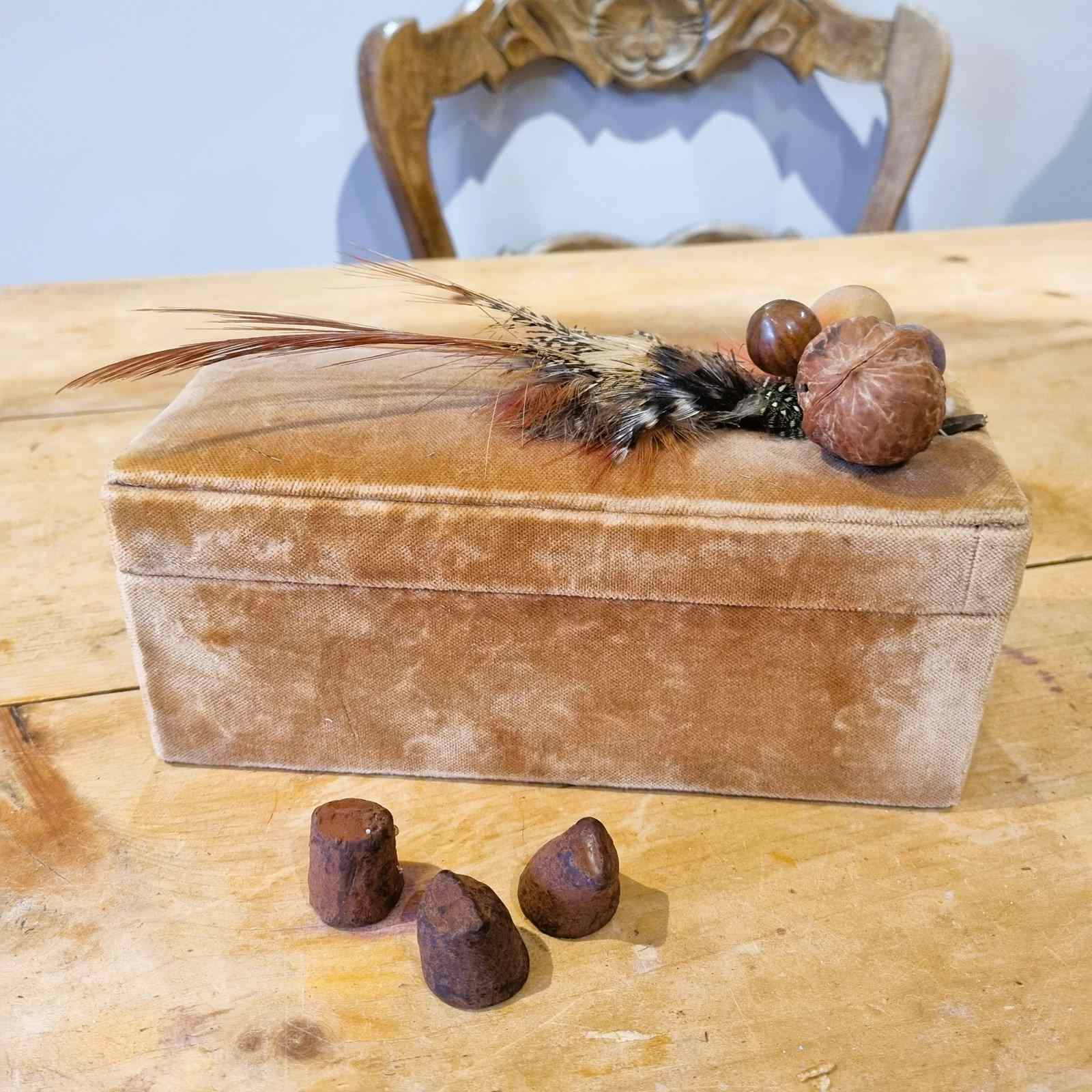 Style: A truly unique find, this quirky, French chocolate box boasts a luxurious exterior of amber velvet and interior of chocolate brown leather. Its charm is amplified by a delightful, almost eccentric, decoration of faux fruit, nuts, and a scattering of wild bird feathers. Imagine it gracing your vanity table, holding your gloves or treasures, or even better, brimming with exquisite chocolates as the ultimate Christmas surprise.