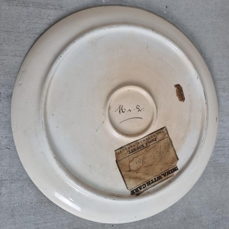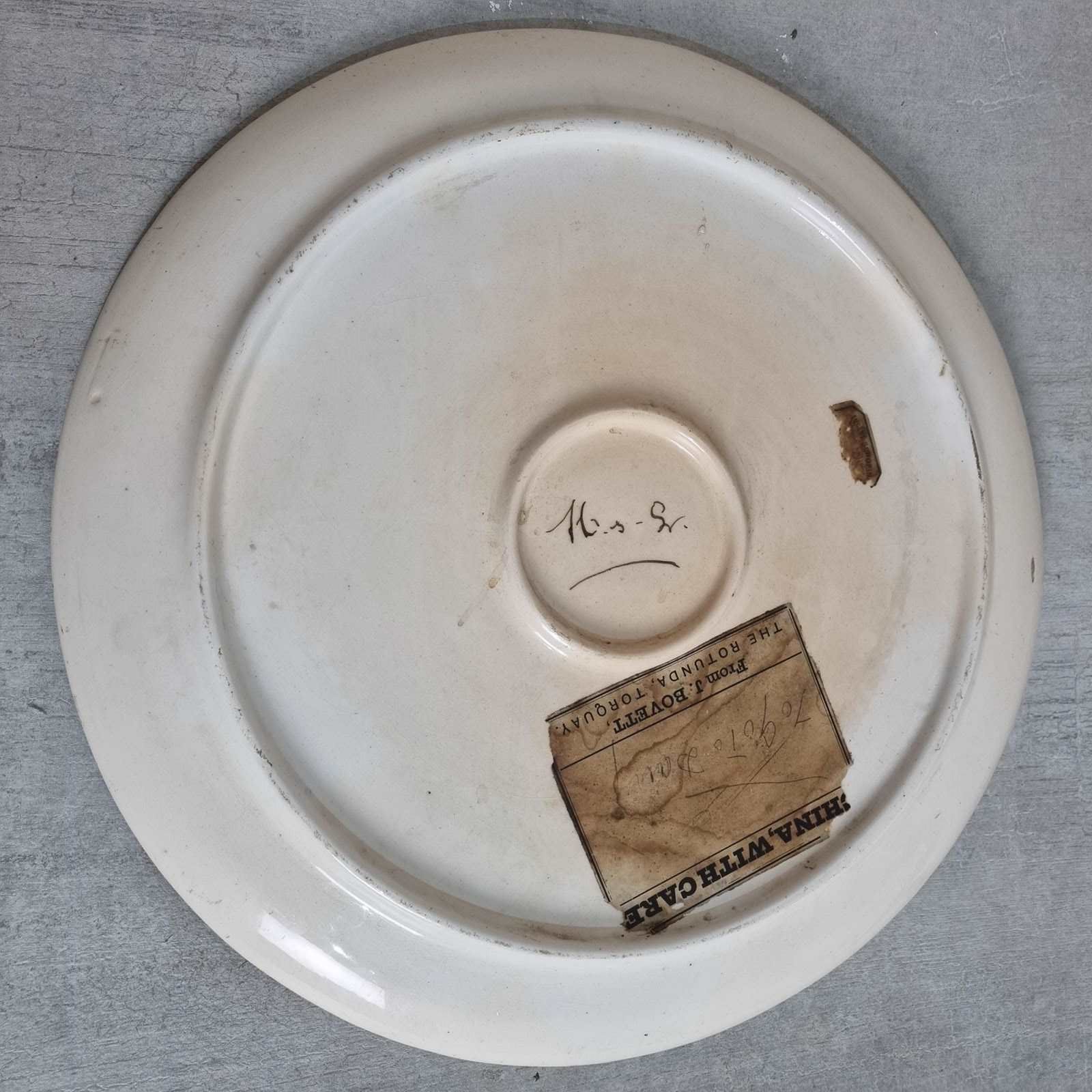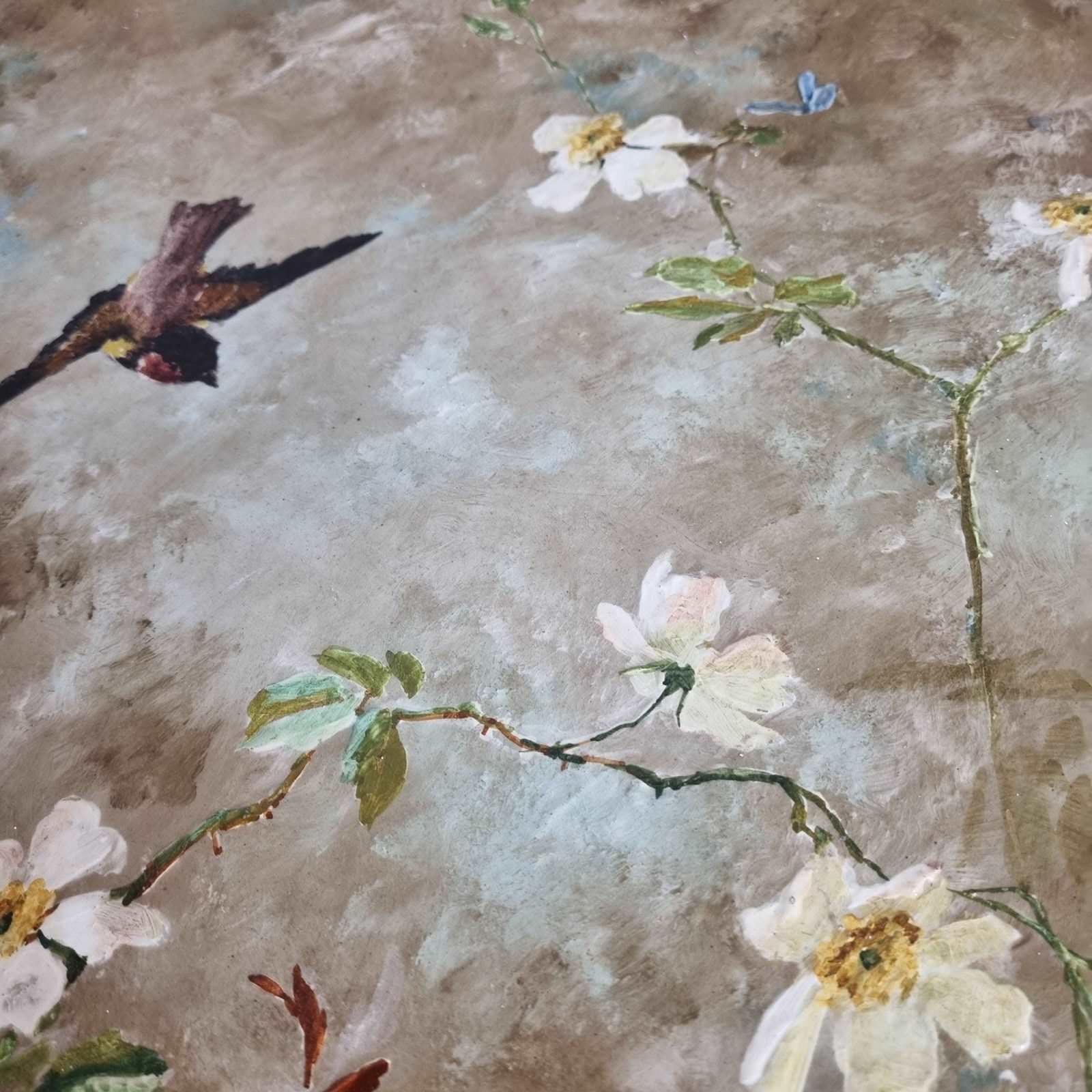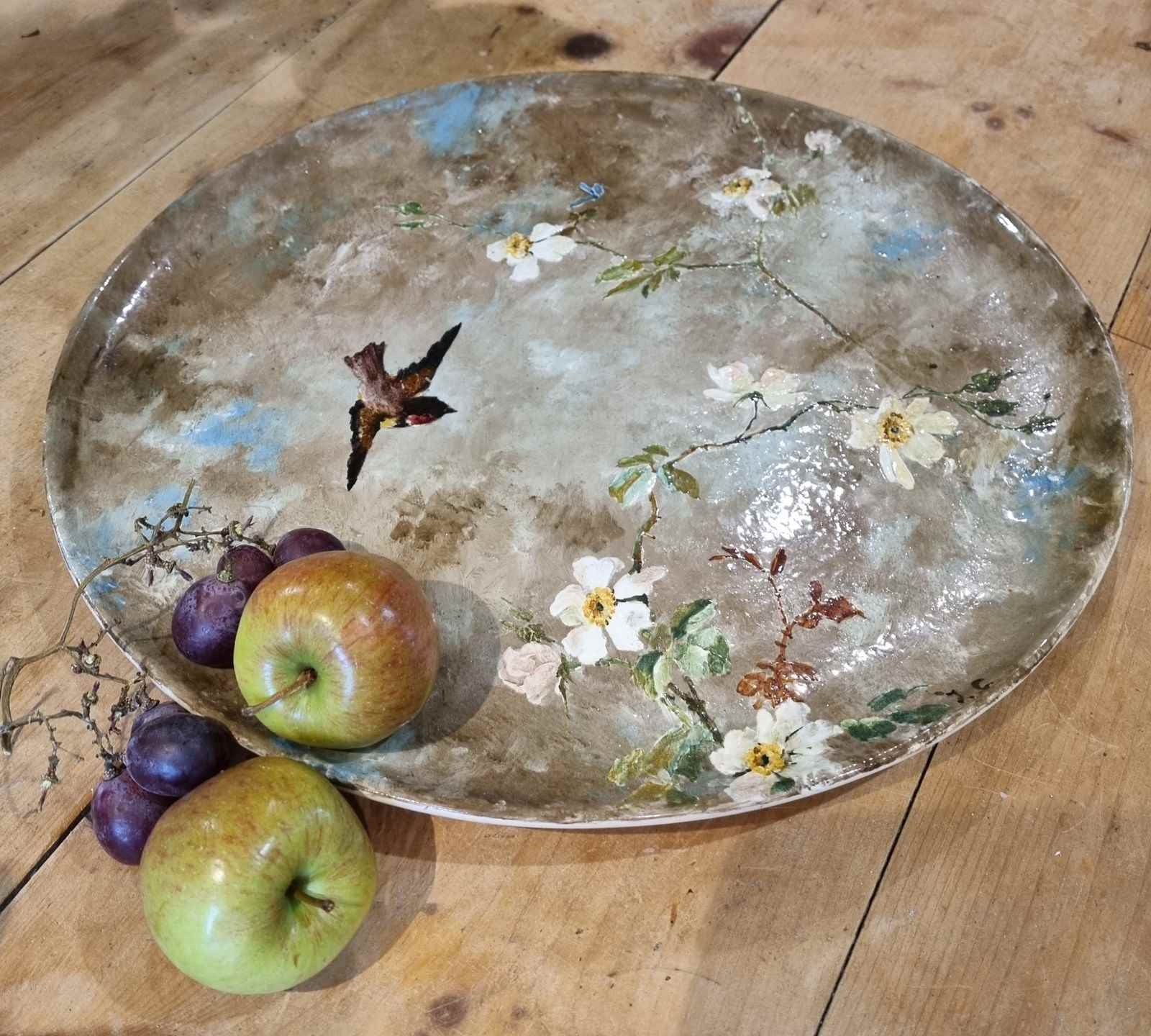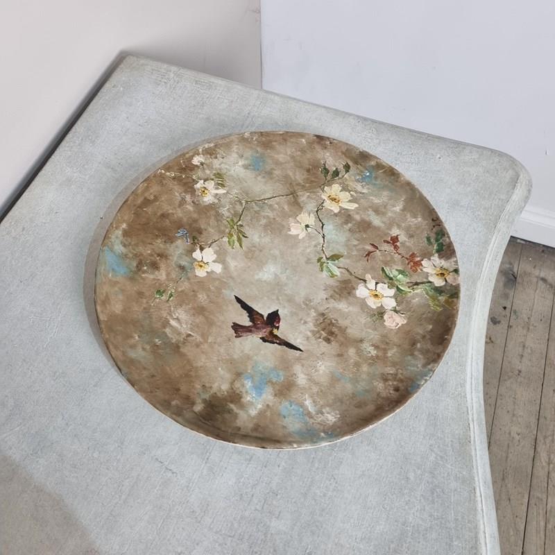 Style: This 19th century meticulously hand-painted French charger showcases the delicate beauty of rose hip blossoms, alongside a charming goldfinch gracefully soaring through a serene, cloudy blue sky. For display on a wall as a piece of art, or use as a fruit dish.
