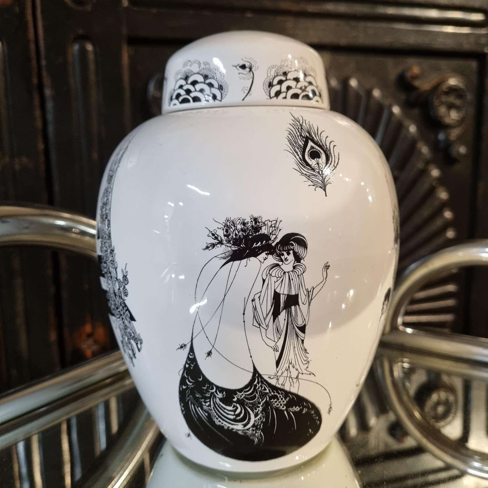 Exquisite and rare vintage Poole Pottery large ginger jar from the 'Beardsley Collection', featuring a striking black-on-white printed design complete with an intact lid with peacock design detail. It is in perfect condition, free from cracks or chips, and comes with the original collector's leaflet showcasing the entire collection.