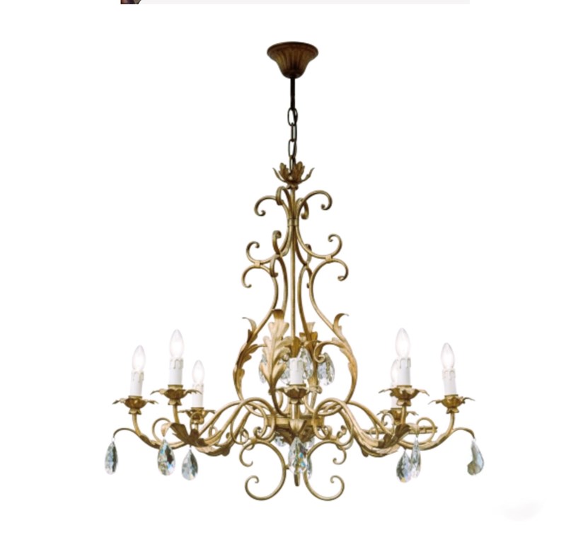 Style: Exuding quintessential Hollywood Regency style glamour, this vintage Italian eight-arm chandelier features an exquisite, simple scrolled gilded metal frame, detailed with elegant Acanthus leaves, and is richly adorned with eight generous sparkling crystal droplets, guaranteeing maximum visual glamour. In working order.