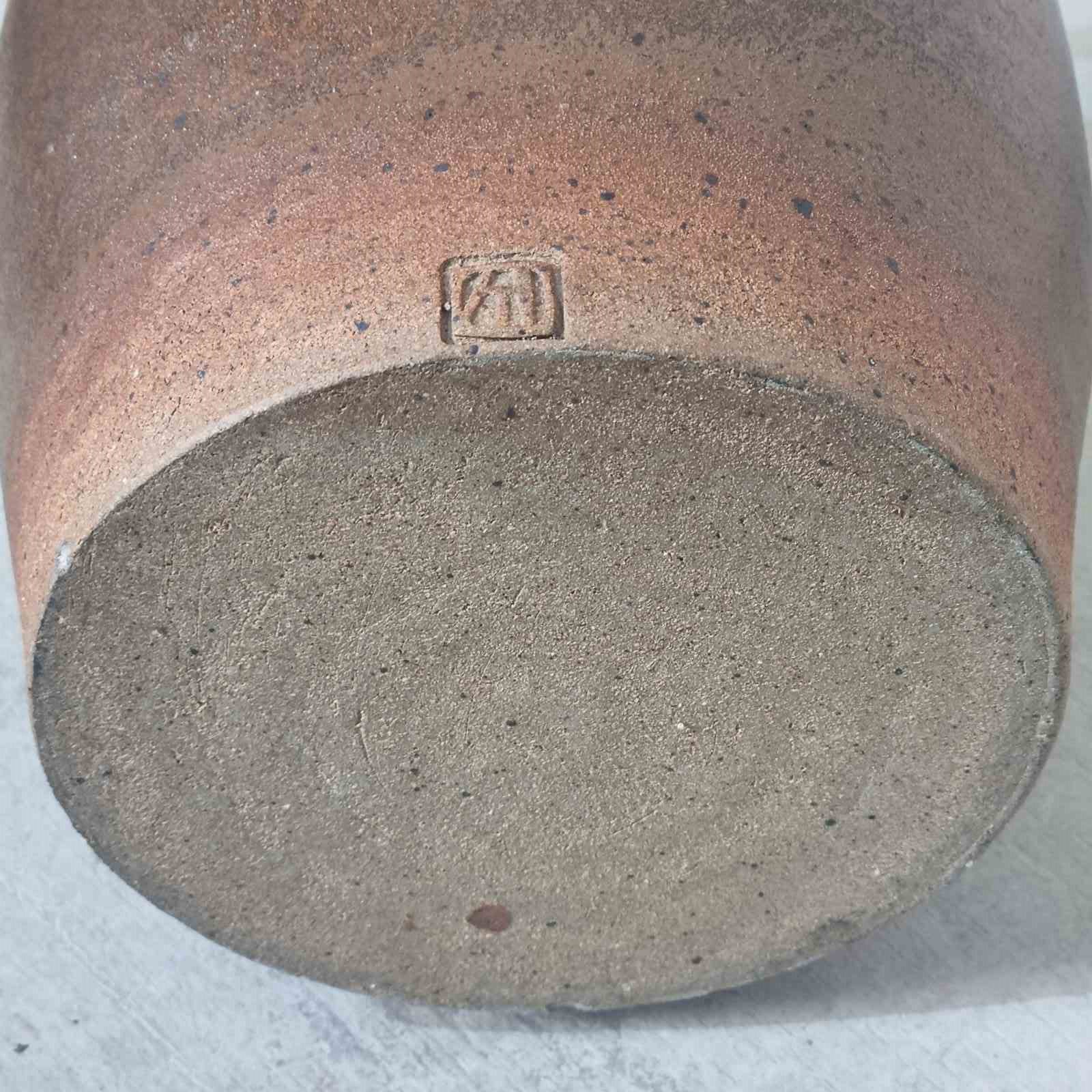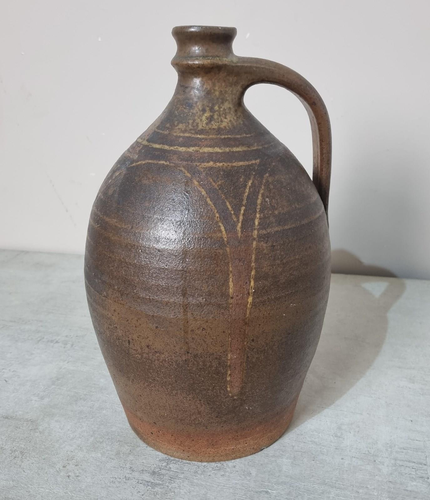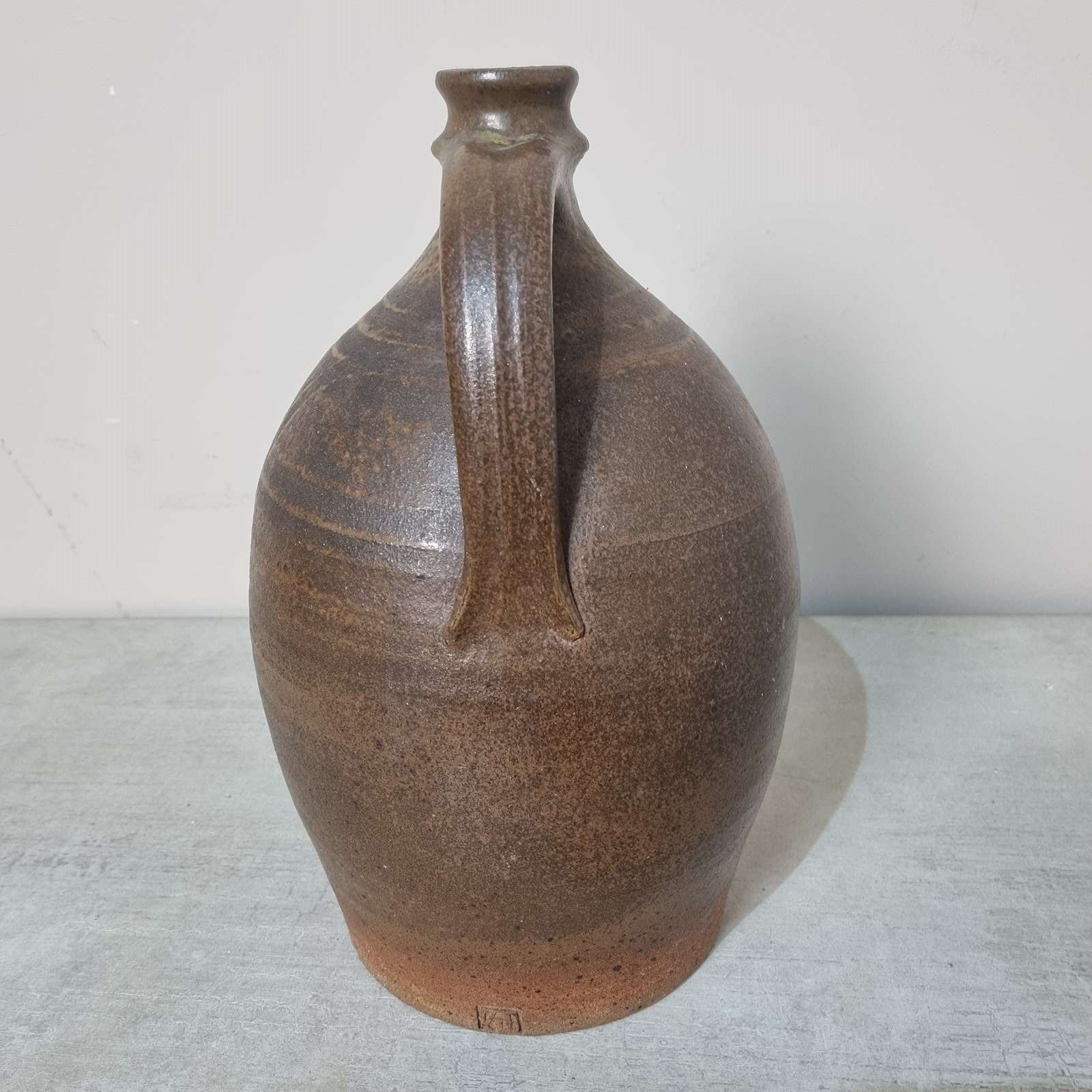 Style: A substantial, honest jug – a piece of 20th-century stoneware built to last, rooted firmly in the earth. In the style of John Leach (son of David Leach), the surface features a ridged texture, overlaid with a geometric pattern that flows down the form's curves, creating an almost dripped effect. The makers mark on the bottom side is listed as 'recognised but unknown' on the online database of 20-21st century British and Irish Studio Pottery.