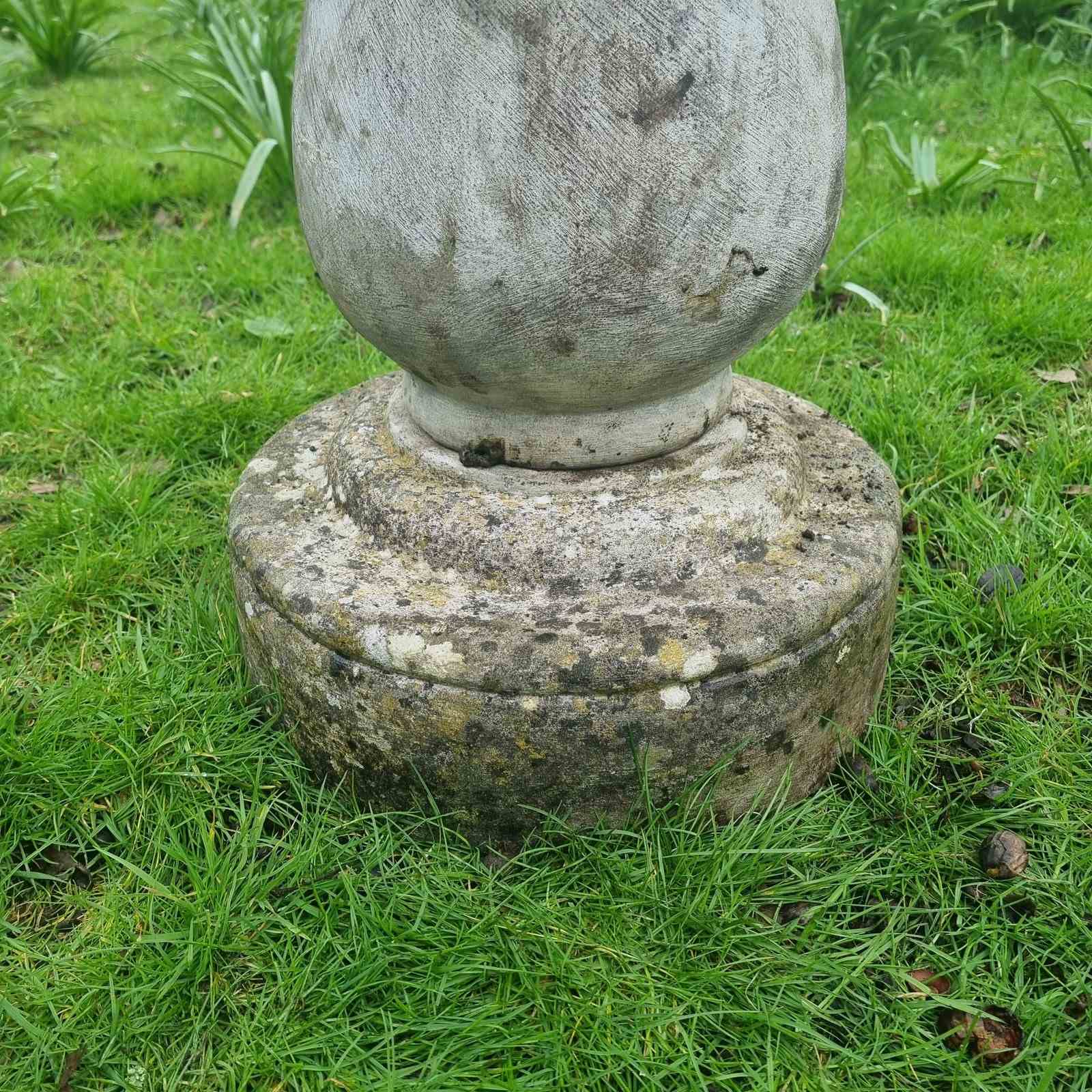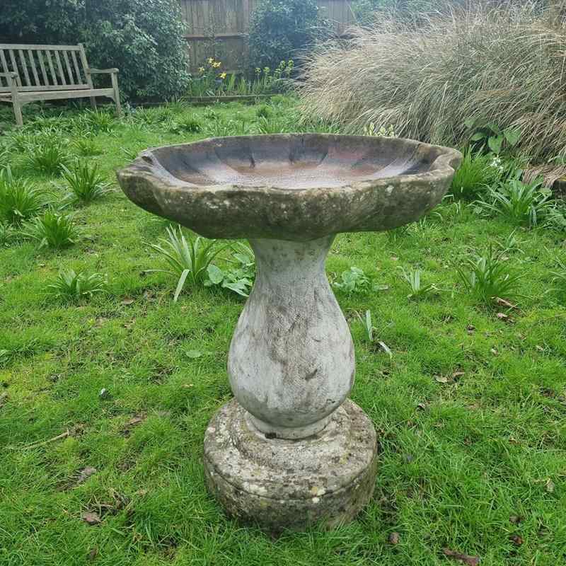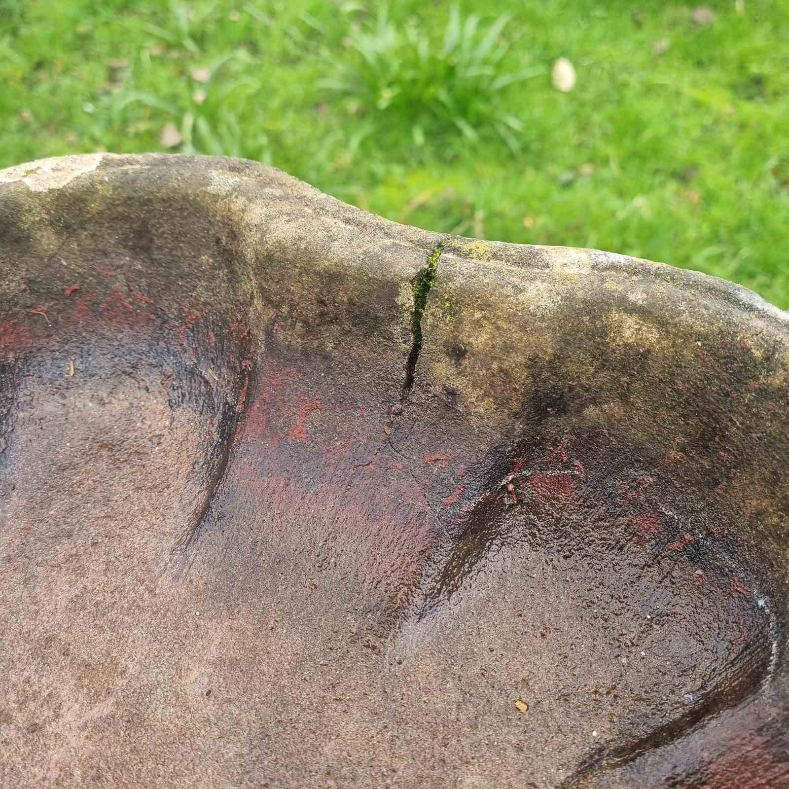Style: In three parts; The base a solid, circular foundation that’s been lovingly weathered by decades of sun and rain. A top of this, the pedestal, a baluster‑style column supports the bowl with a classic, architectural silhouette. Topped with a generously sized, shell‑shaped basin - its interior displays a warm, sun‑kissed discoloration accented by delicate lichen. Note: A small split on the upper edge of the bowl; purely cosmetic, it doesn't affect the basin’s ability to hold water. H 62cm W bowl 54cm W base 30cm
