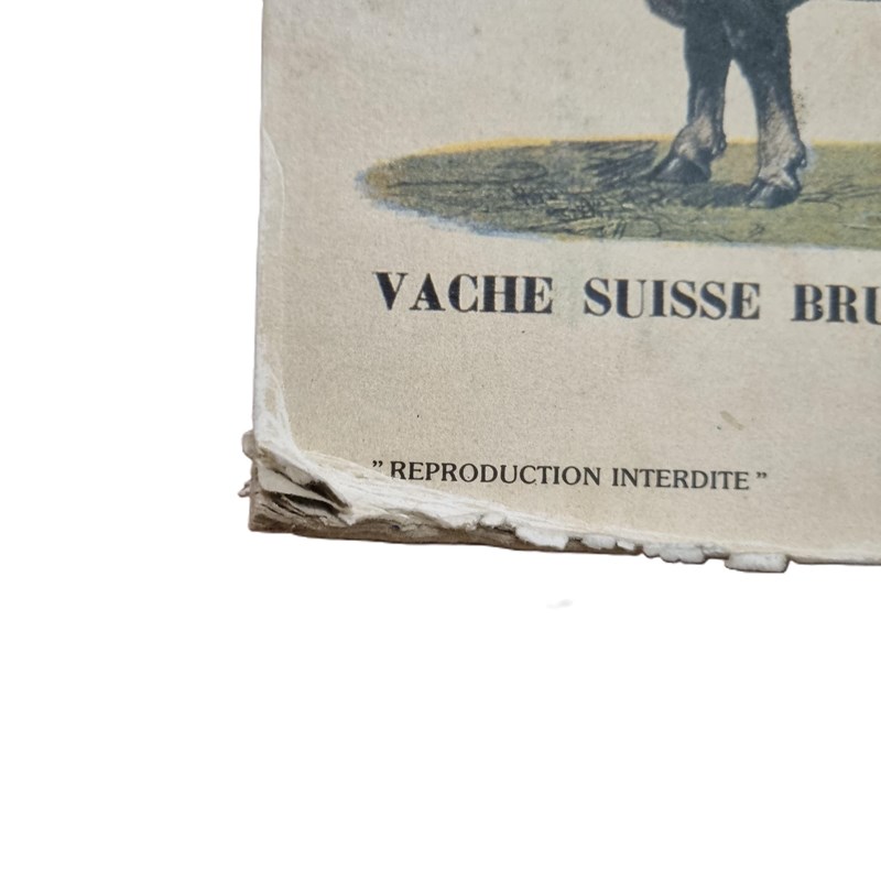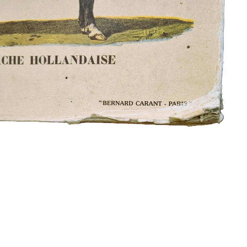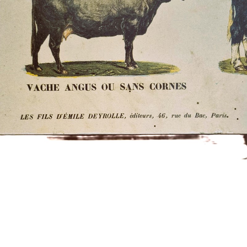 Style: Add a touch of rustic charm to your kitchen with this substantial, good condition for its age board-mounted educational Deyrolle poster featuring breeds of cows. Translated to "Farm Animals", this unique and rare reproduction is presented on its original board, complete with eyelet holes for convenient hanging. While there is some expected wear to the bottom corners, these imperfections would be concealed when framed. By French artist Barnard Carant, Paris. Circa 1950's.