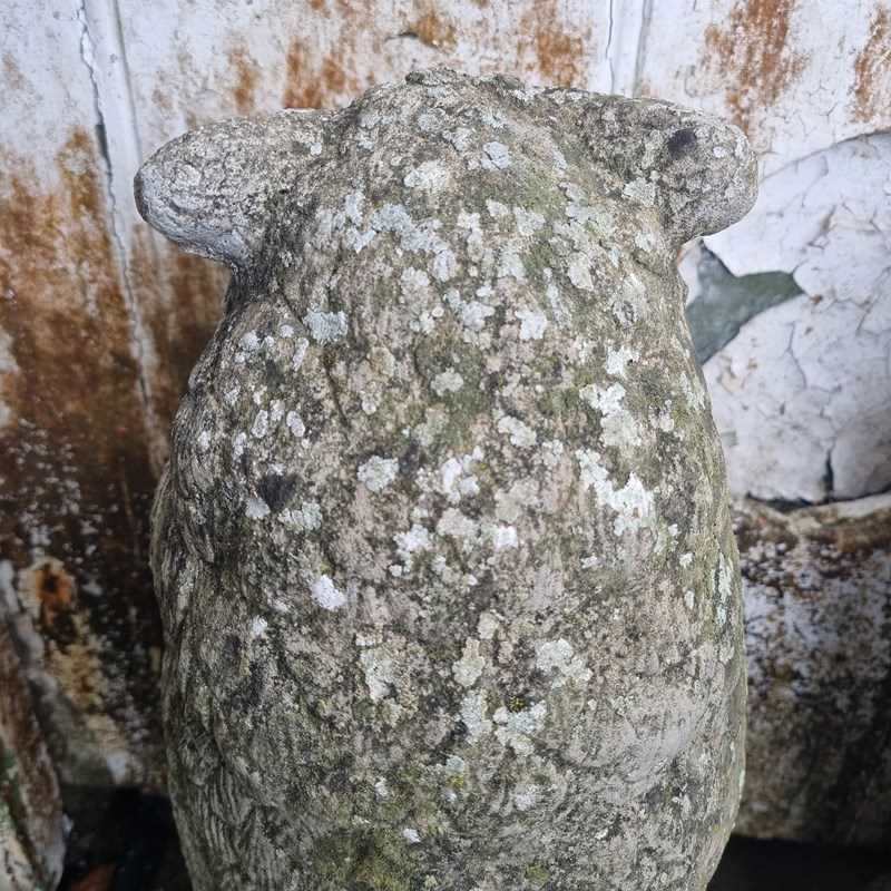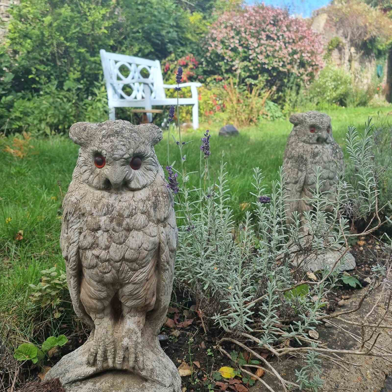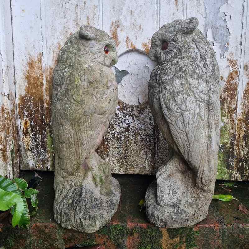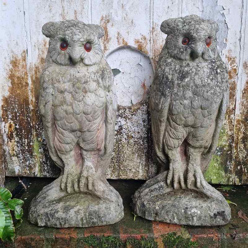 Style: Imposing, characterful owl composite stone statues for the garden. Heavy, with a beautiful weathered patina and original amber glass eyes. Circa 1950/60's. Three available.
