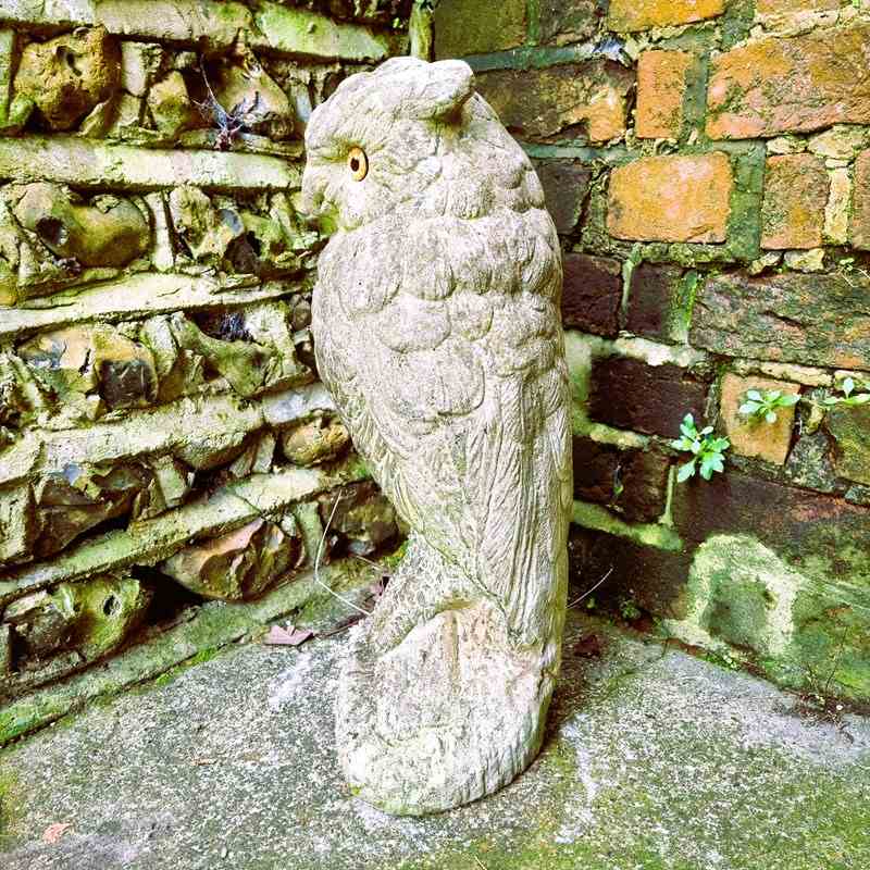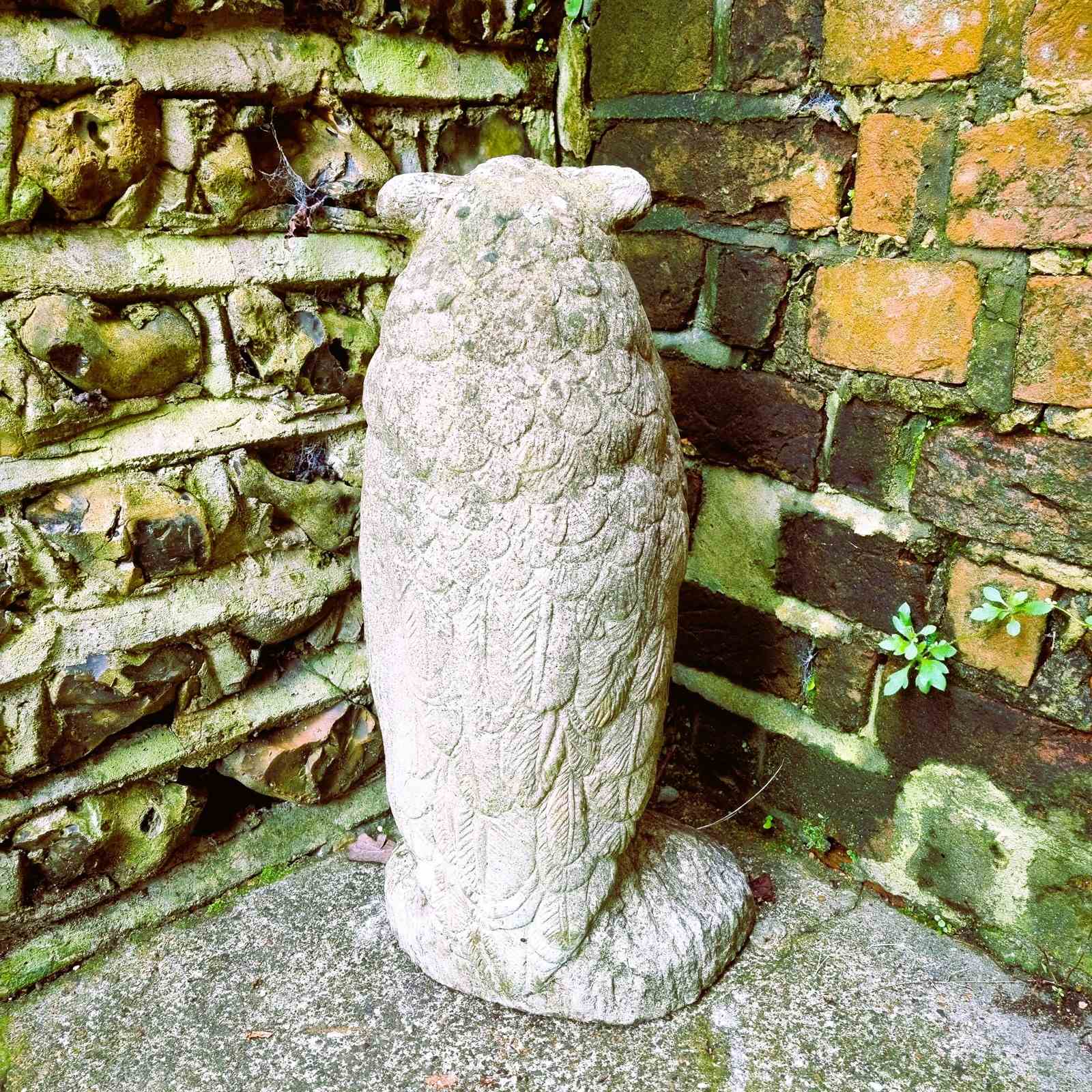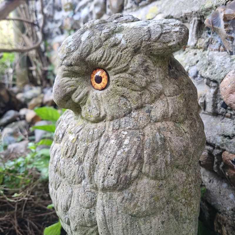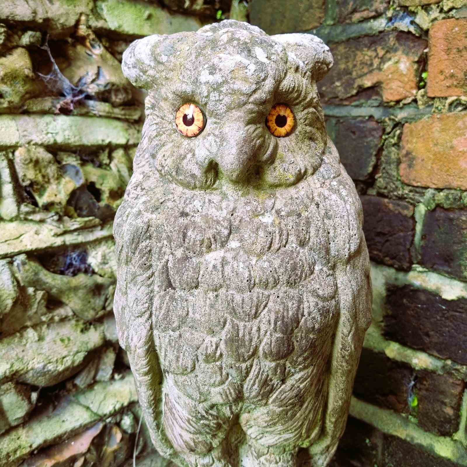 Style: Imposing, characterful owl composite stone statue for the garden or interior. Heavy, with a beautiful weathered patina and original amber glass eyes. Circa 1950/60's. NOW ONLY ONE AVAILABLE.