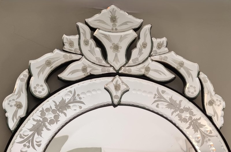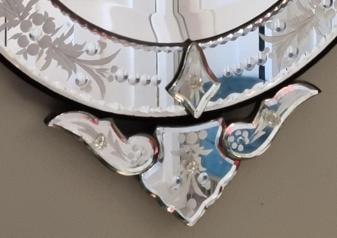 Style: A stylish circular vintage Venetian mirror with a bevelled main pane set within a glass frame that boasts intricate engraving. Topped and tailed with elaborate shaped engraved mirrors. Tiny, glass floral motifs nestled over the fixtures lend an extra touch of charm.