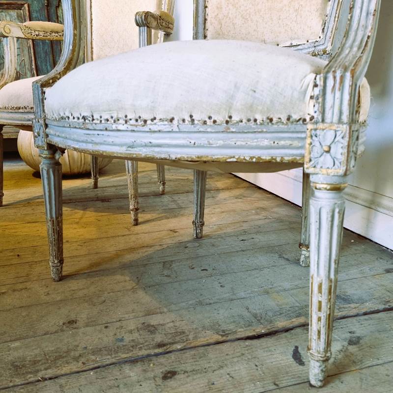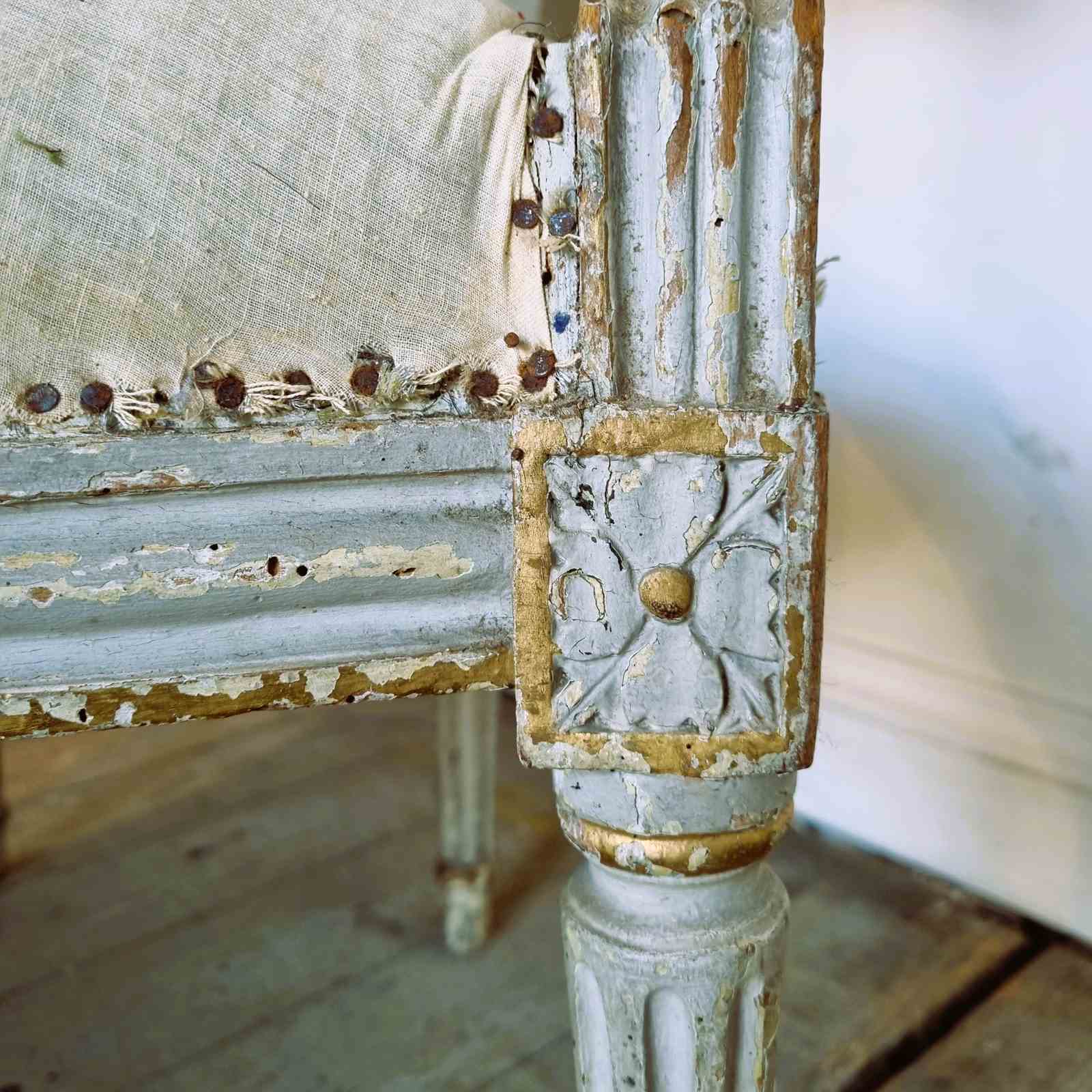 Style: Elegant pair of Louis XVI period armchairs, dating from the late 18th century. Each armchair boasts a distinctive "chapeau de gendarme" style back, meticulously carved from molded beechwood and finished with a charming distressed with age painted surface in pale blue grey and later added gilding. They feature gracefully sweeping armrest supports and rest upon classically inspired tapered and fluted legs, embodying the sophisticated Neoclassical aesthetic of the era. Ready for covering in your own choice of fabric.