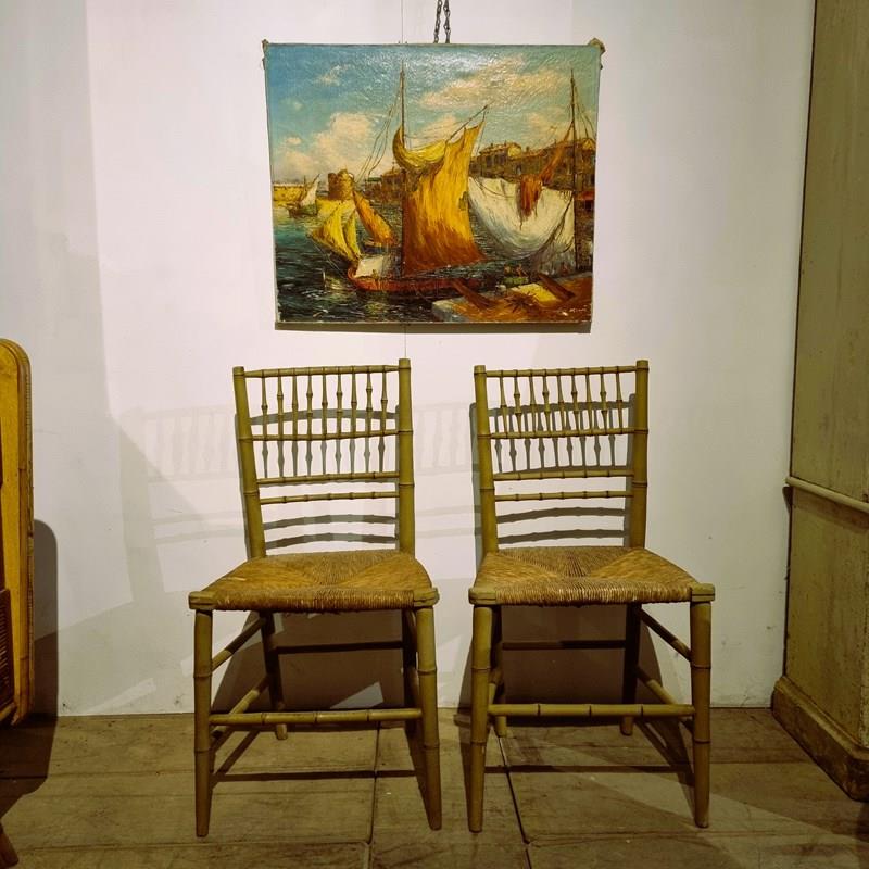 Pair Of Painted Regency Faux Bamboo And Rush Seat Chairs