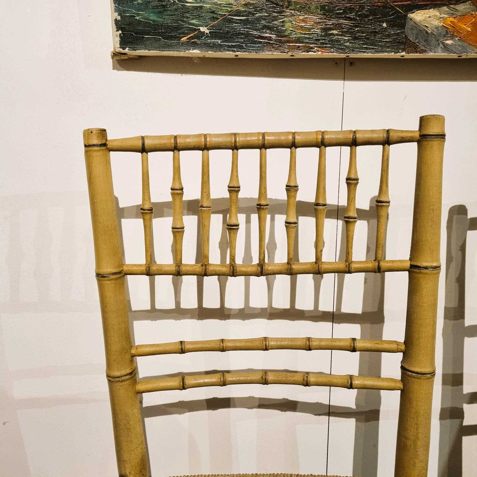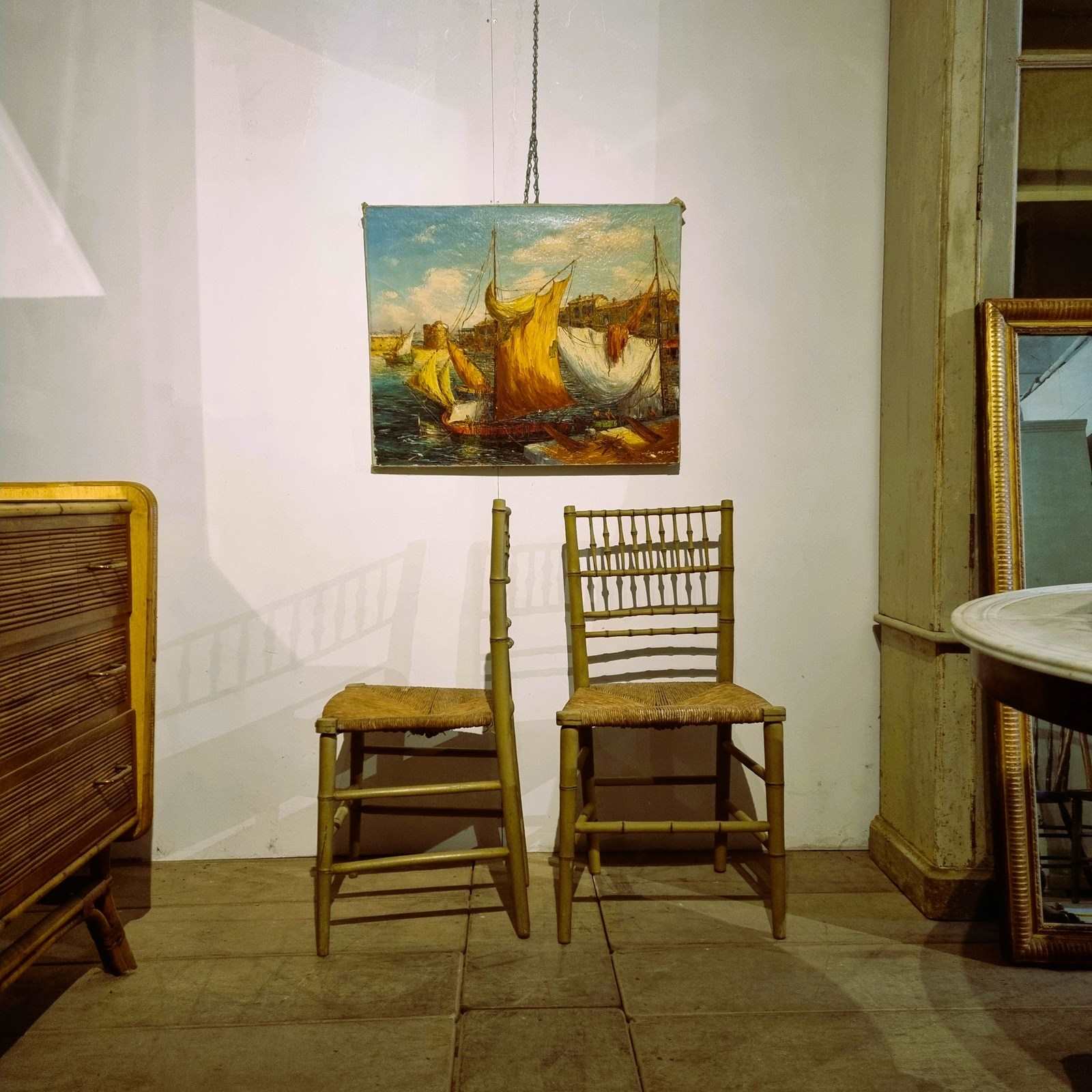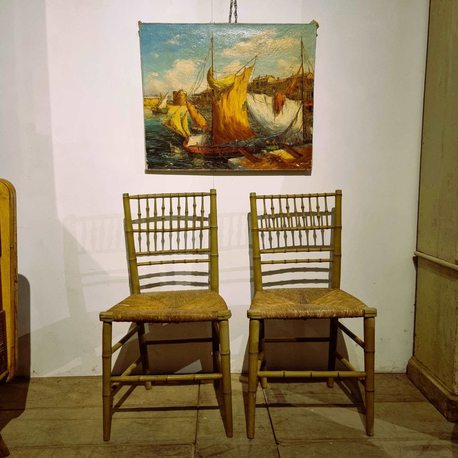 Style: Delightful 19th-century chairs with a painted faux bamboo finish. This charming pair showcases intricate and delicate spindle-turned backs, legs, and connecting stretchers, all supporting well-maintained rush seats. A stylish addition to any setting.