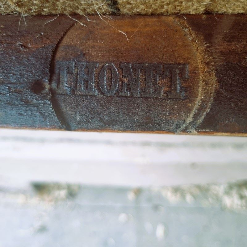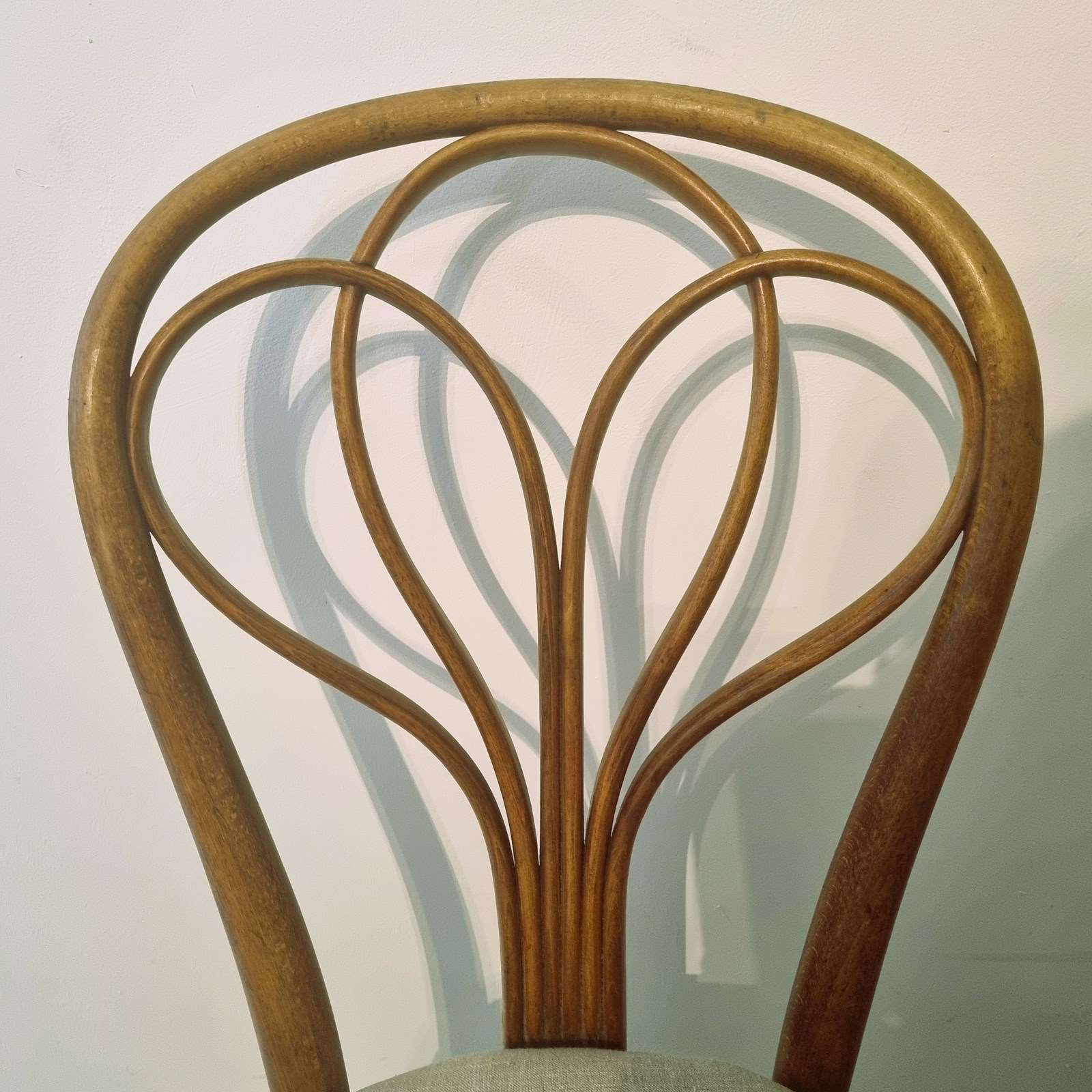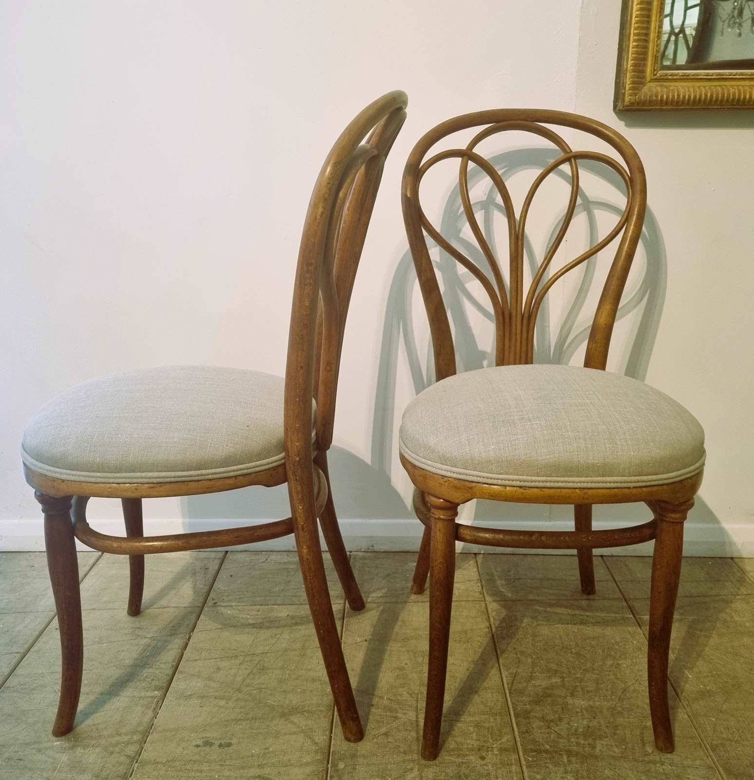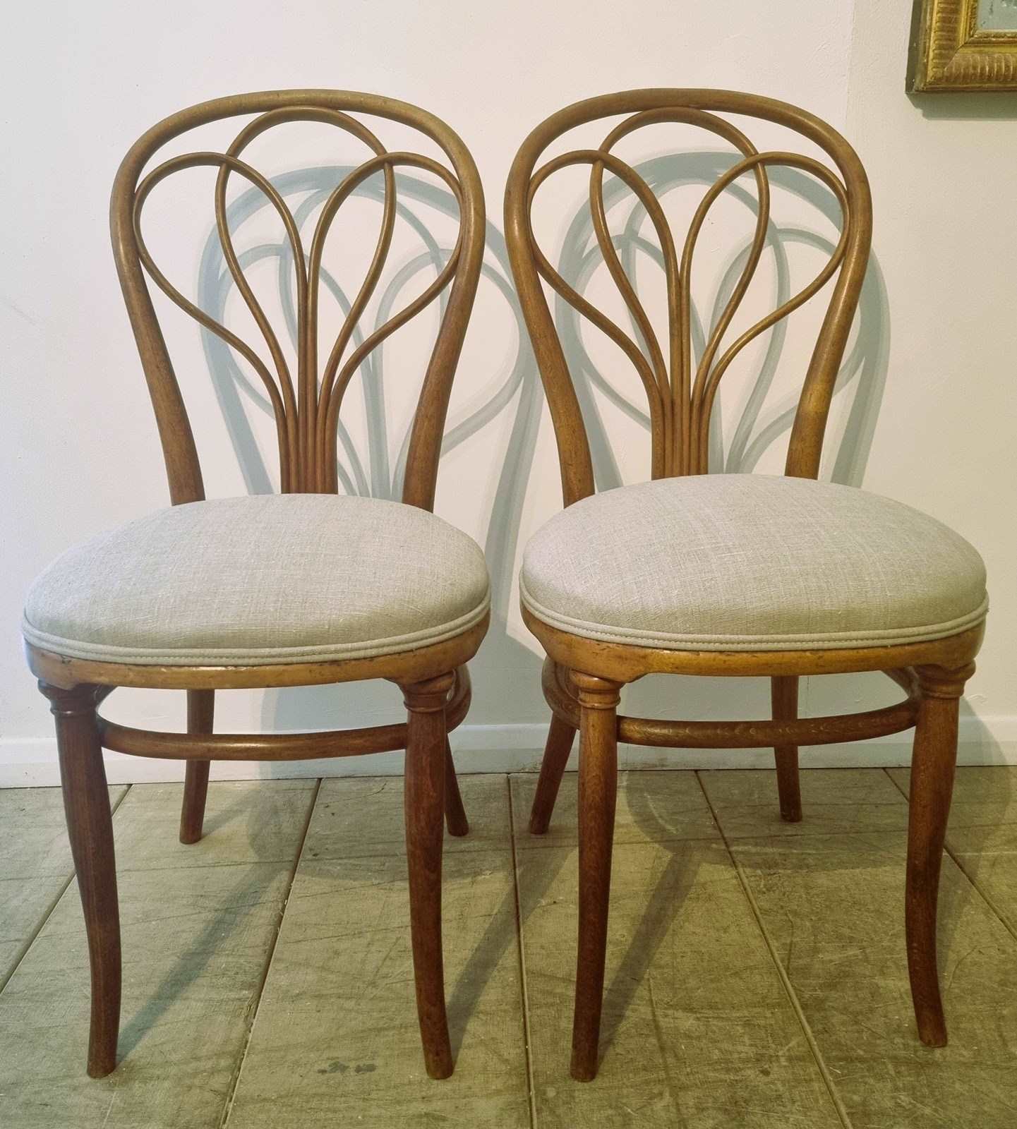 An exceptional find! These exquisite Art Nouveau bentwood beech swoon worthy dining chairs, famously known as 'Peacock' Thonet chairs - No. 25, were crafted in Austria circa 1900. Their authenticity is unequivocally guaranteed, having been officially authenticated by Thonet themselves. Each chair bears the distinctive Thonet stamp and an inscribed sun detail – a hallmark of their meticulous craftsmanship, reportedly used to precisely match original pairs or sets. Recently revitalised, they feature elegant new upholstery in a sophisticated grey linen.