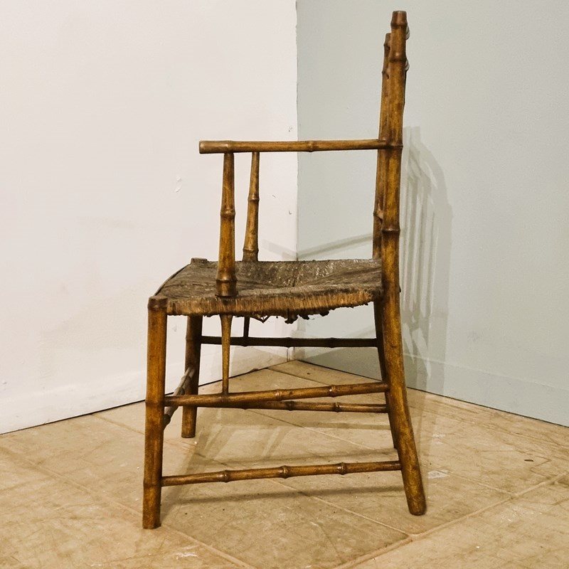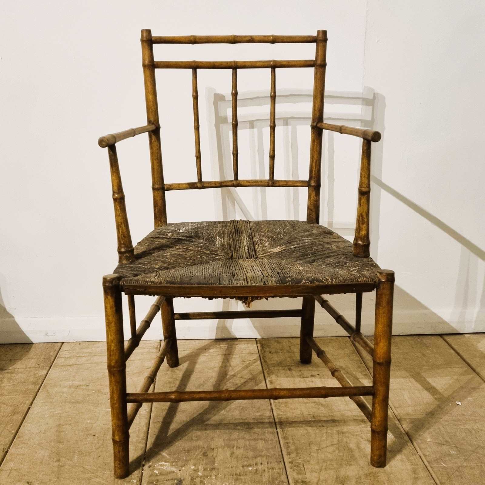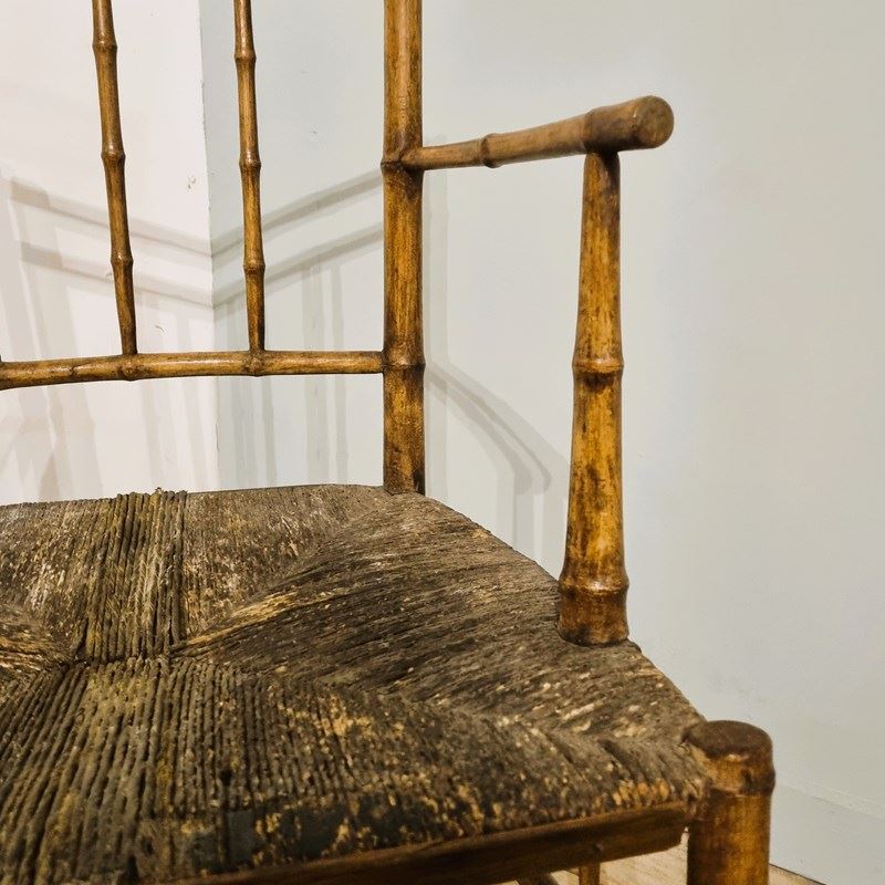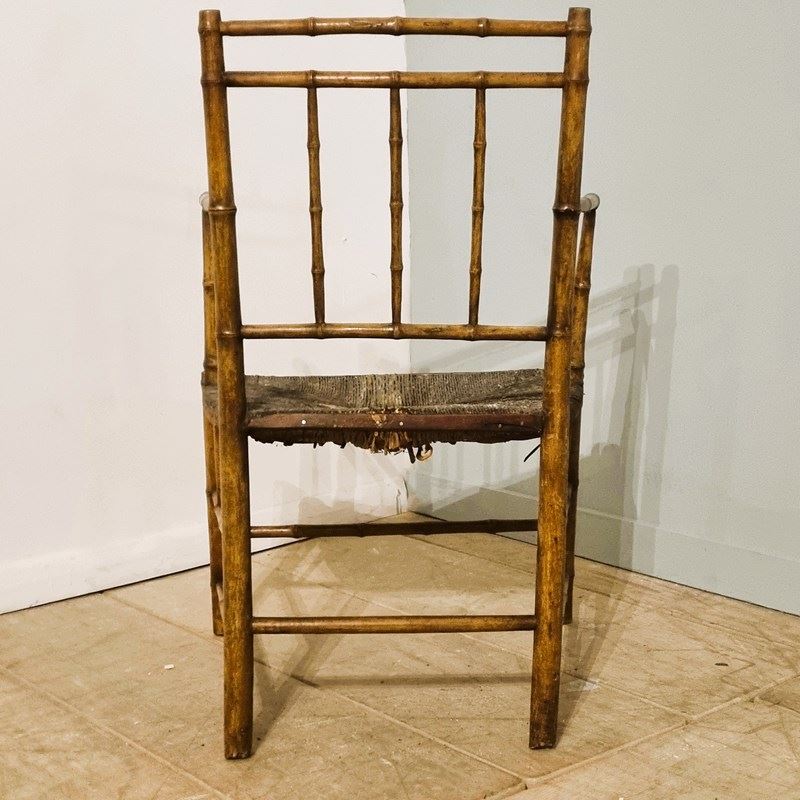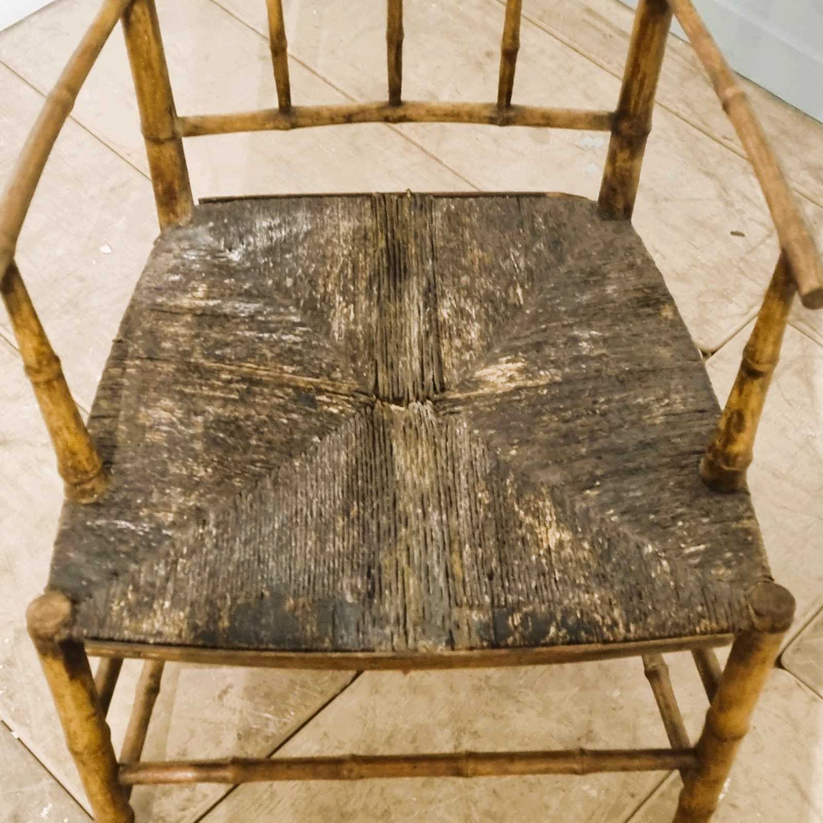 Style: A charming Regency faux bamboo chair with a lovely very aged patina, retaining its original decorative paint work. The frame boasts sturdy construction, though the wide seat displays expected signs of its considerable age and use, including visible wear, and some prior remedial repairs. Due to the rush seat's worn condition, this chair is best suited for occasional use or as a decorative accent piece in its current state, making it available at a generous, reflective price.