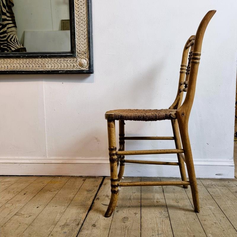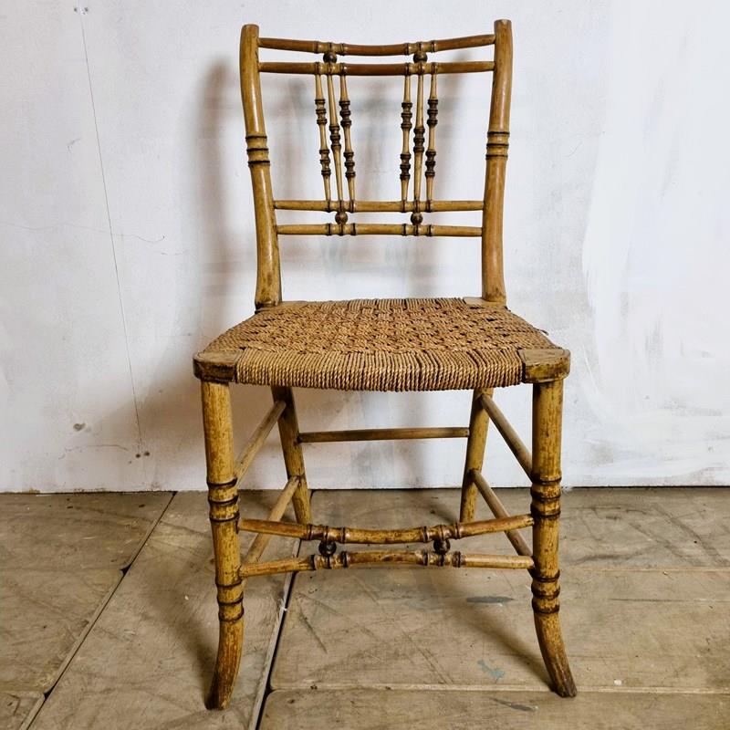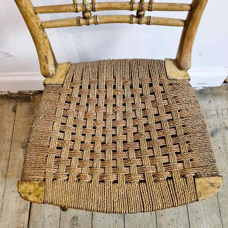 Style: Delightful 19th-century chair with a painted faux bamboo finish and remnants of the original dark ochre and black paint. This charming chair showcases intricate and delicate spindle-turned backs, legs, and connecting stretchers, all supporting a well-maintained unique later added braided sea grass seat. A stylish addition to any setting. In addition to the dimensions shown, the height of the seat is 44cm.