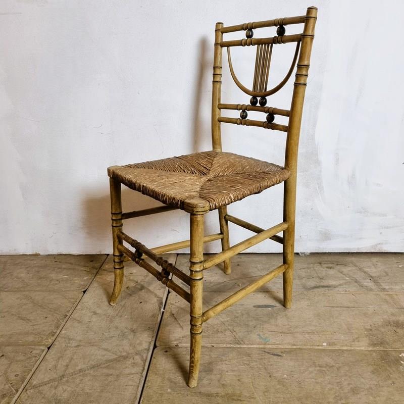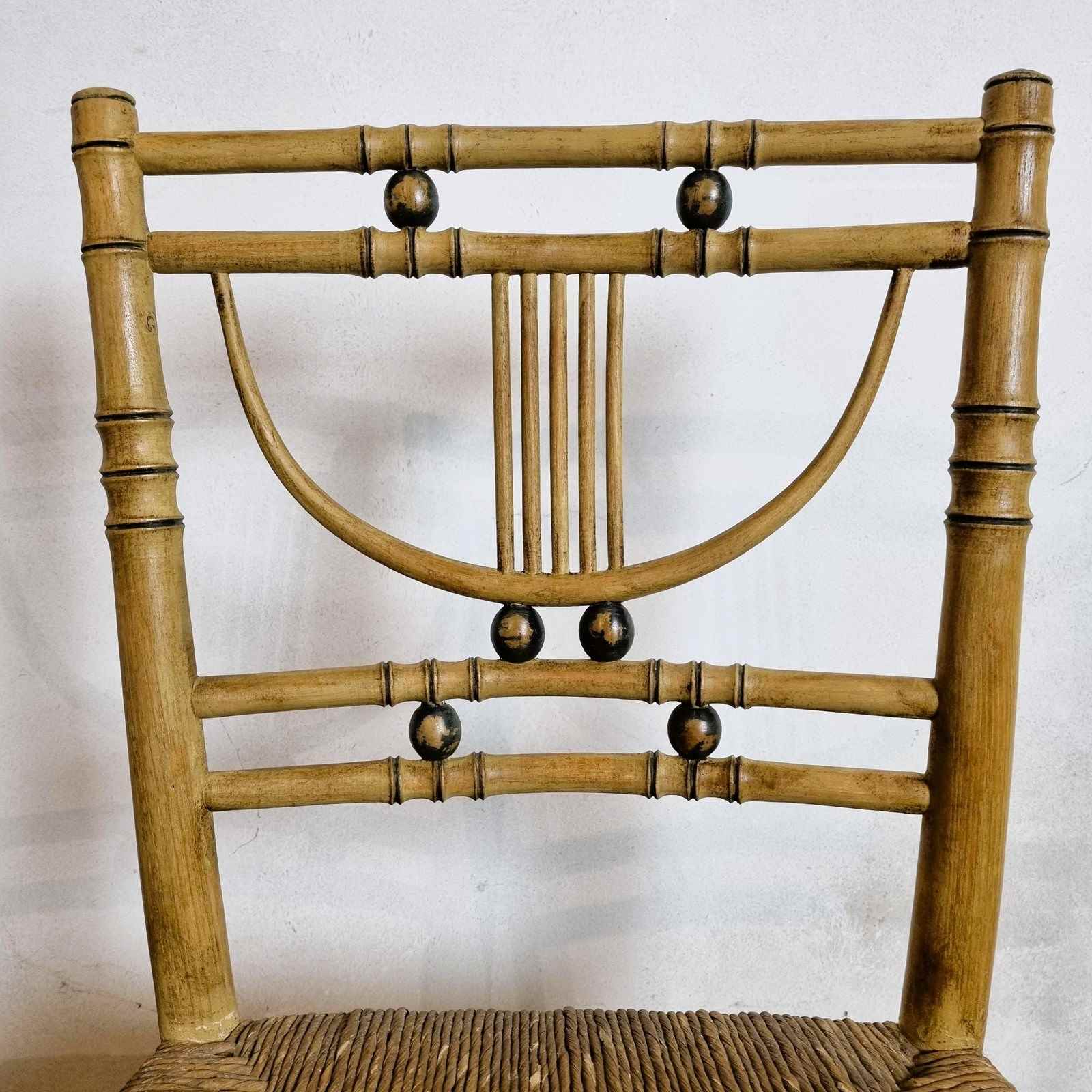 Style: Add this charming and stylish piece to your home providing historical elegance to any space. This desirable 19th-century chair boasts a faux bamboo finish that retains aged worn ochre and black paint. Intricate and delicate spindle-turned work on the back, legs, and connecting stretchers creates a captivating profile, all supporting a rush seat. Seat height 44cm.