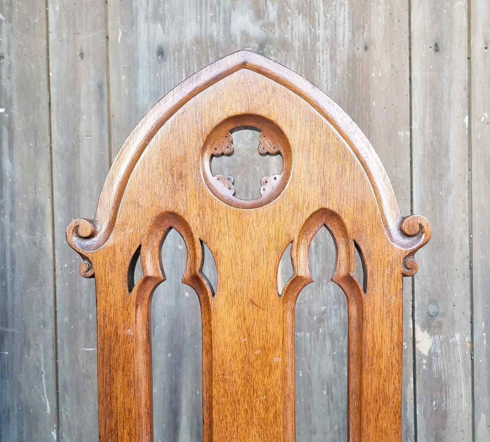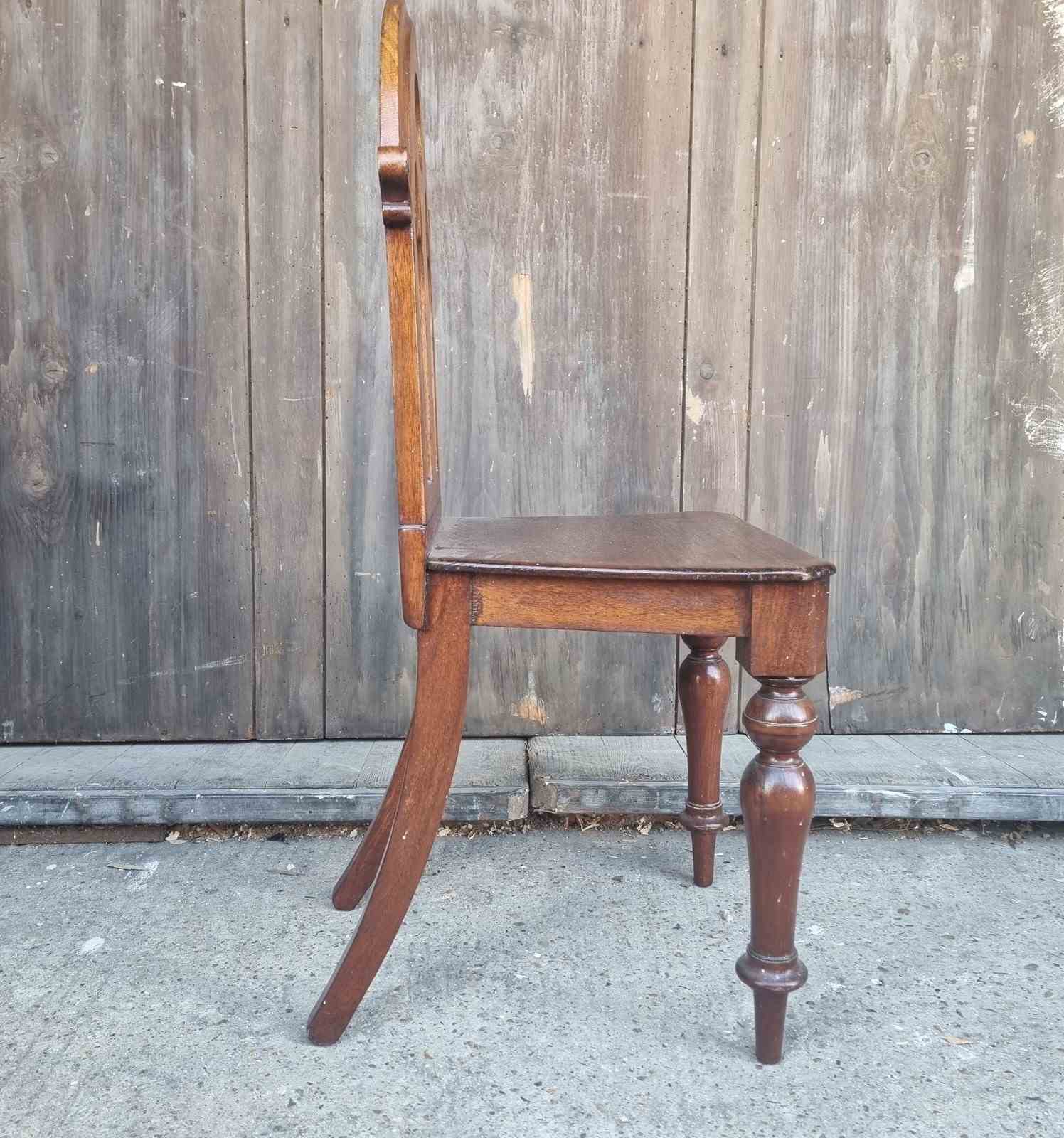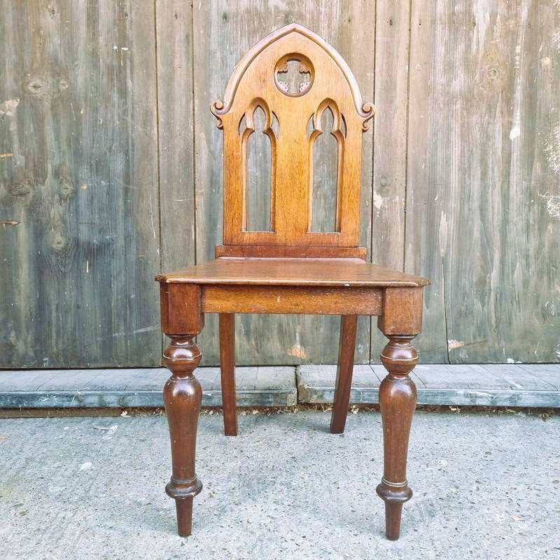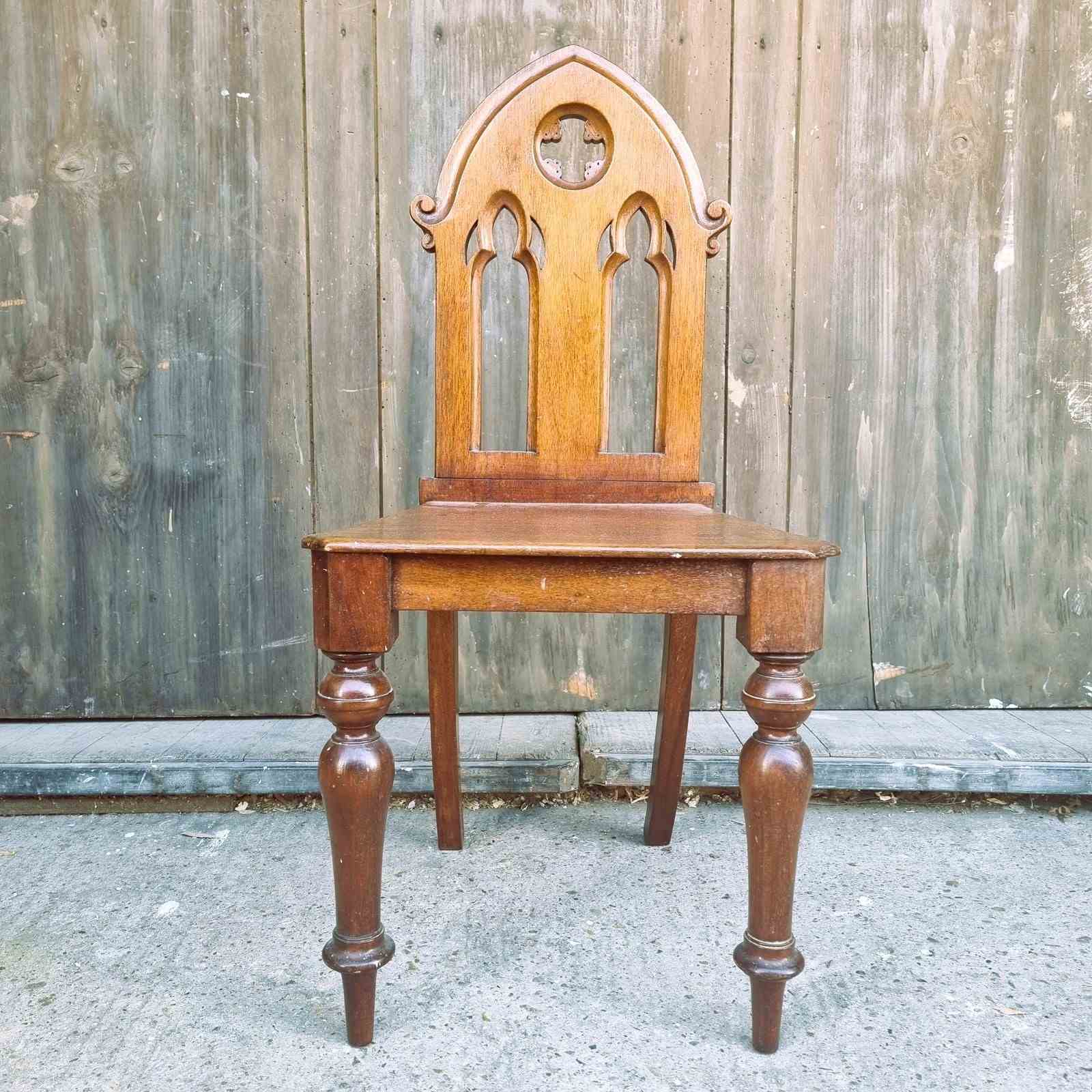 A handsome Victorian Gothic Revival hall chair. Robustly constructed from solid oak and stained, showcasing a striking back beautifully inset with three intricately pierced panels. It offers a smooth, polished wooden seat, supported by prominently ring-turned front legs and balanced by elegantly out swept rear legs. It's a beautiful pairing with the Victorian Pembroke style mahogany table available for sale.
