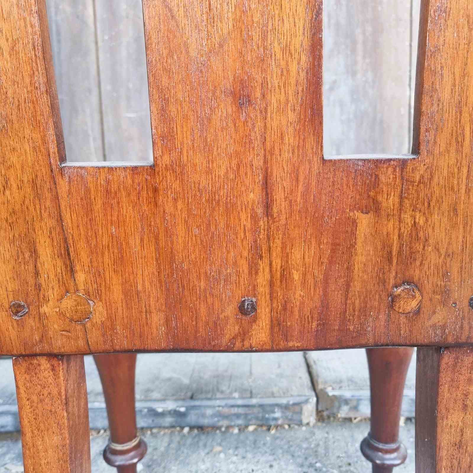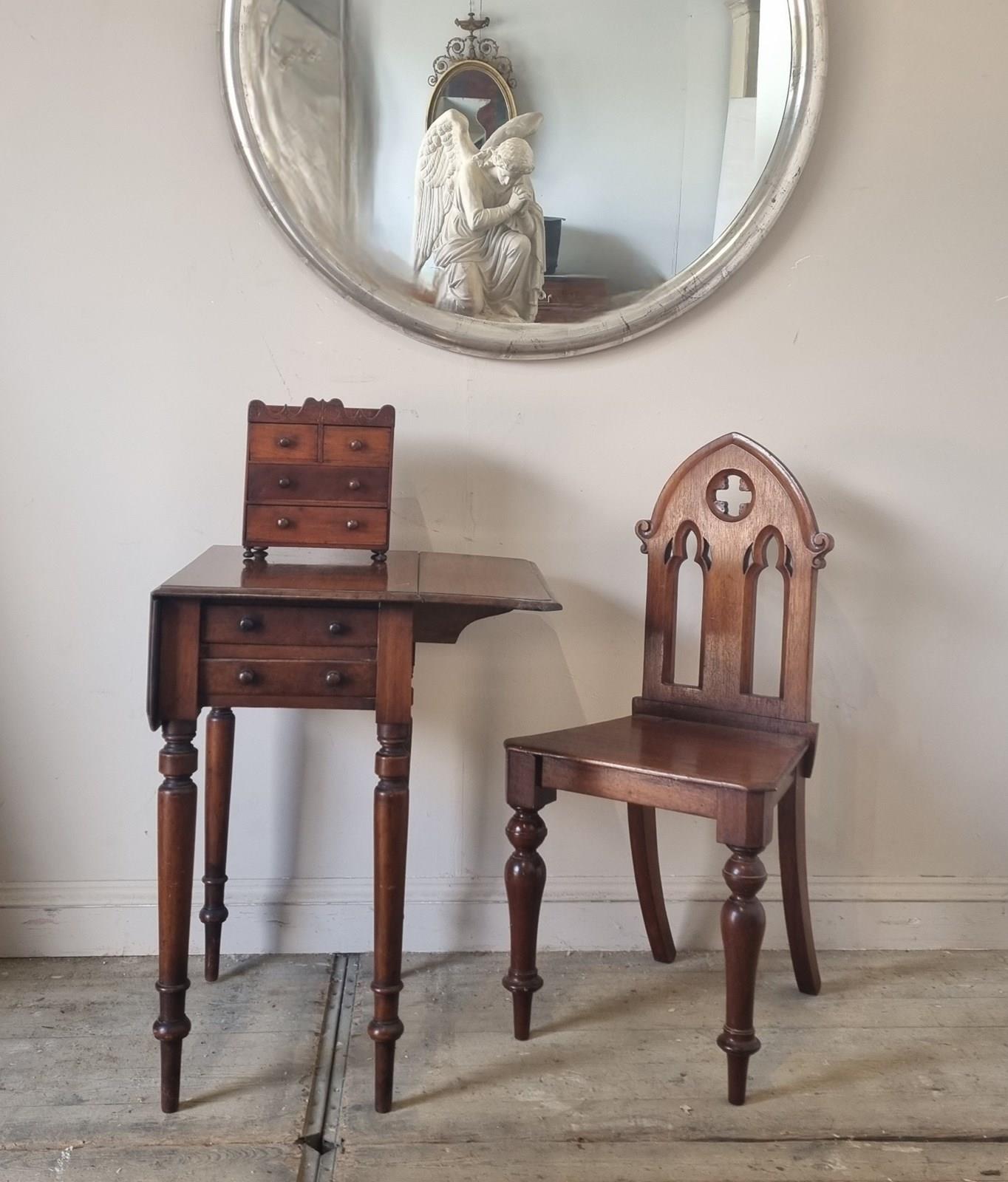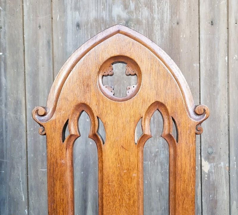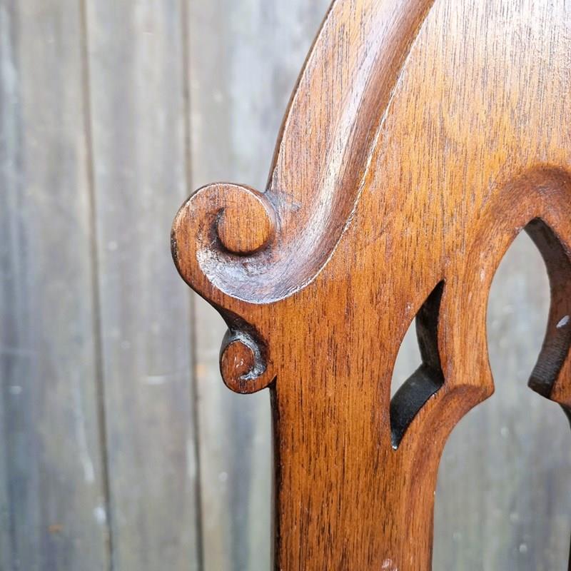 A handsome Victorian Gothic Revival hall chair. Robustly constructed from solid oak and stained, showcasing a striking back beautifully inset with three intricately pierced panels. It offers a smooth, polished wooden seat, supported by prominently ring-turned front legs and balanced by elegantly out swept rear legs. It's a beautiful pairing with the Victorian Pembroke style mahogany table available for sale.