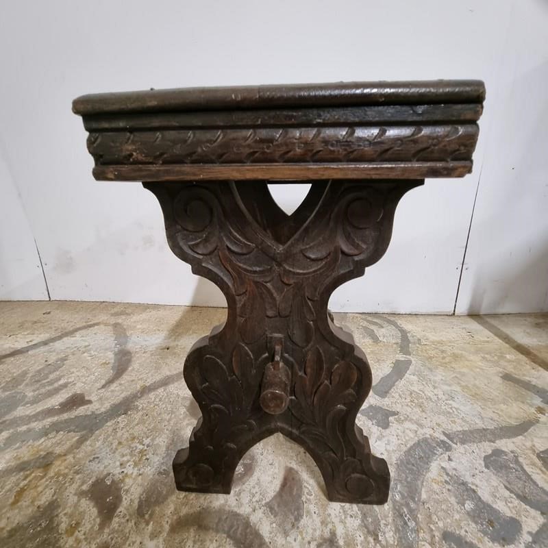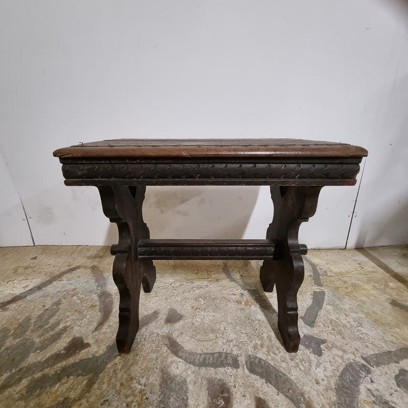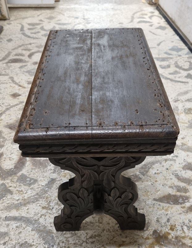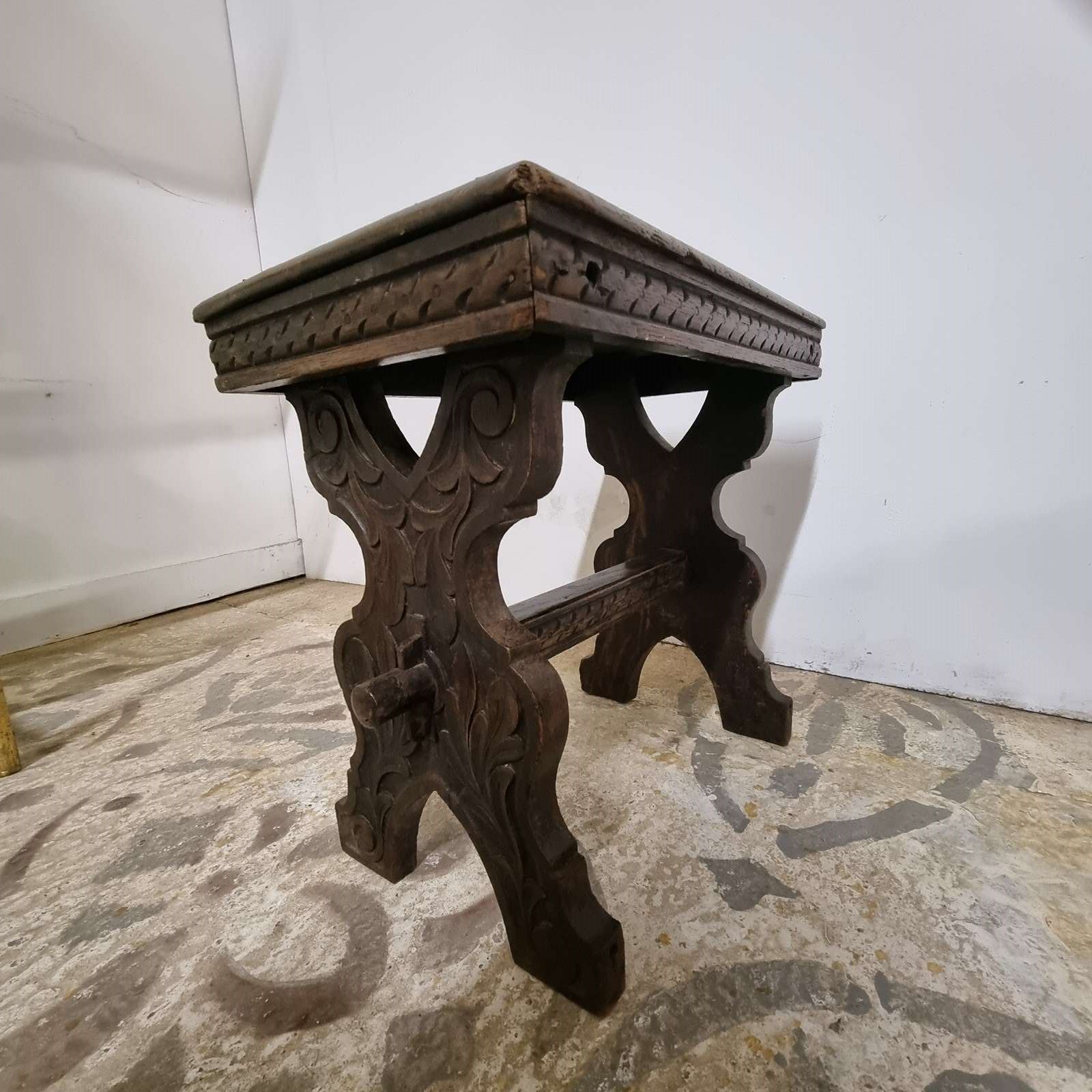 Style: A sturdy oak stool, featuring a solid seat with carved edges. Crafted in the Refectory style, it showcases traditional techniques with pegged construction, a carved cross stretcher, and distinctive x shape leges at each end, beautifully carved. Once upholstered with a pad or cushion, but now removed, the tack holes revealed add character to this rustic piece.