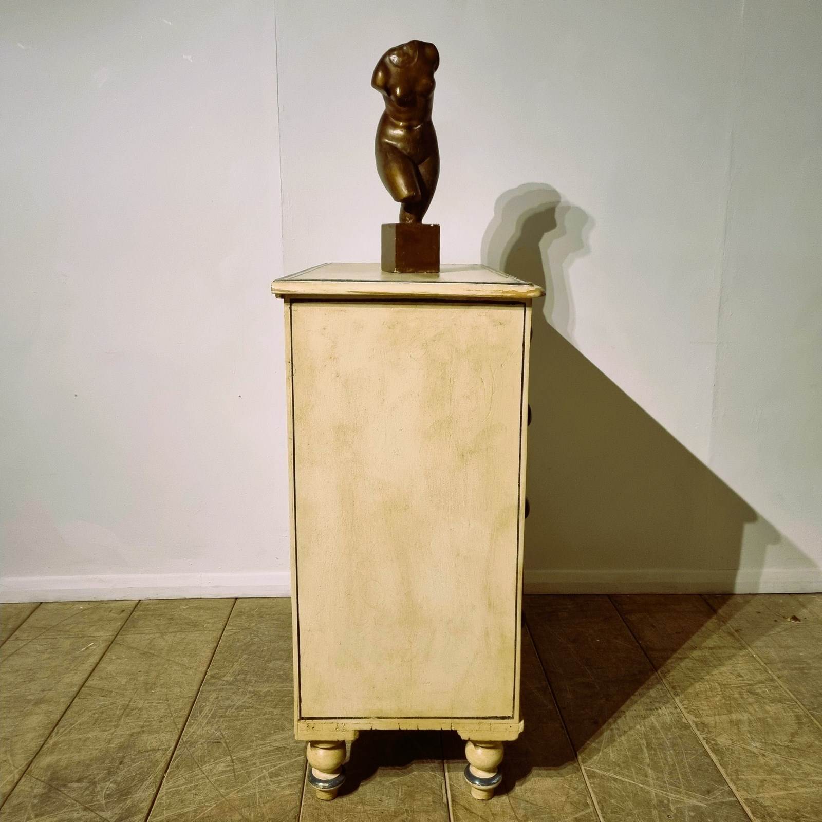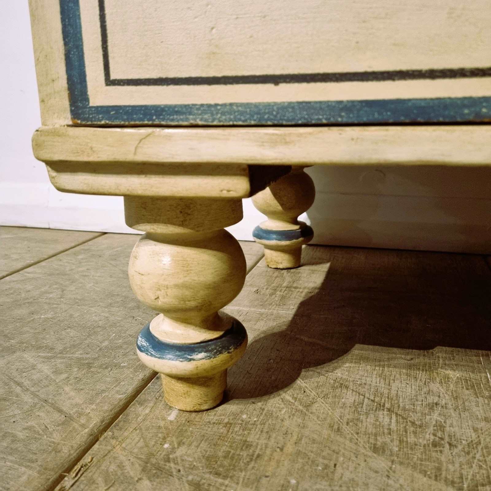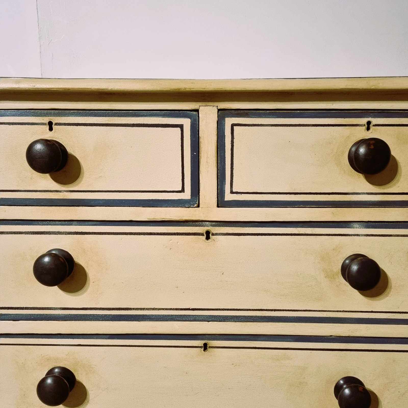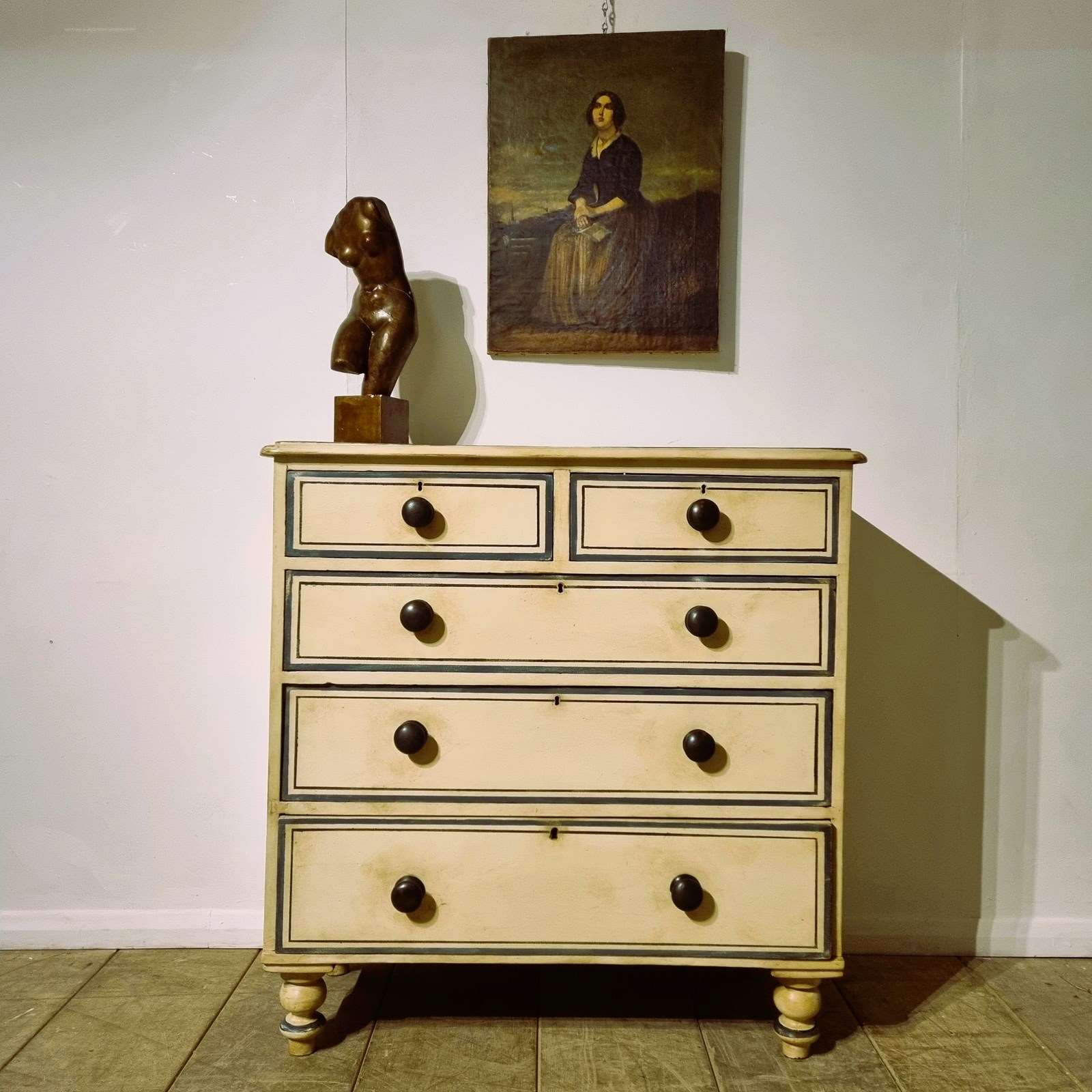 Style: Charming and useful Victorian painted pine chest of drawers, with two short deep drawers above three spacious long ones (very smooth sliders). This characterful storage a top tall turned feet brings both elegance and practicality to any room. It's worn, hand painted finish adds a touch of timeless style.