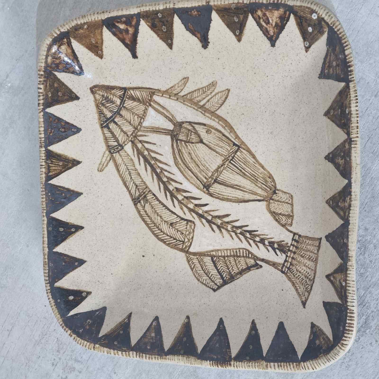 Style: This large handcrafted studio pottery dish showcases a flat fish motif, rendered in rich brown and cream glazes. The fish's surface is embellished with a fine herringbone feather pattern, and a geometric design highlights the slightly raised rim.