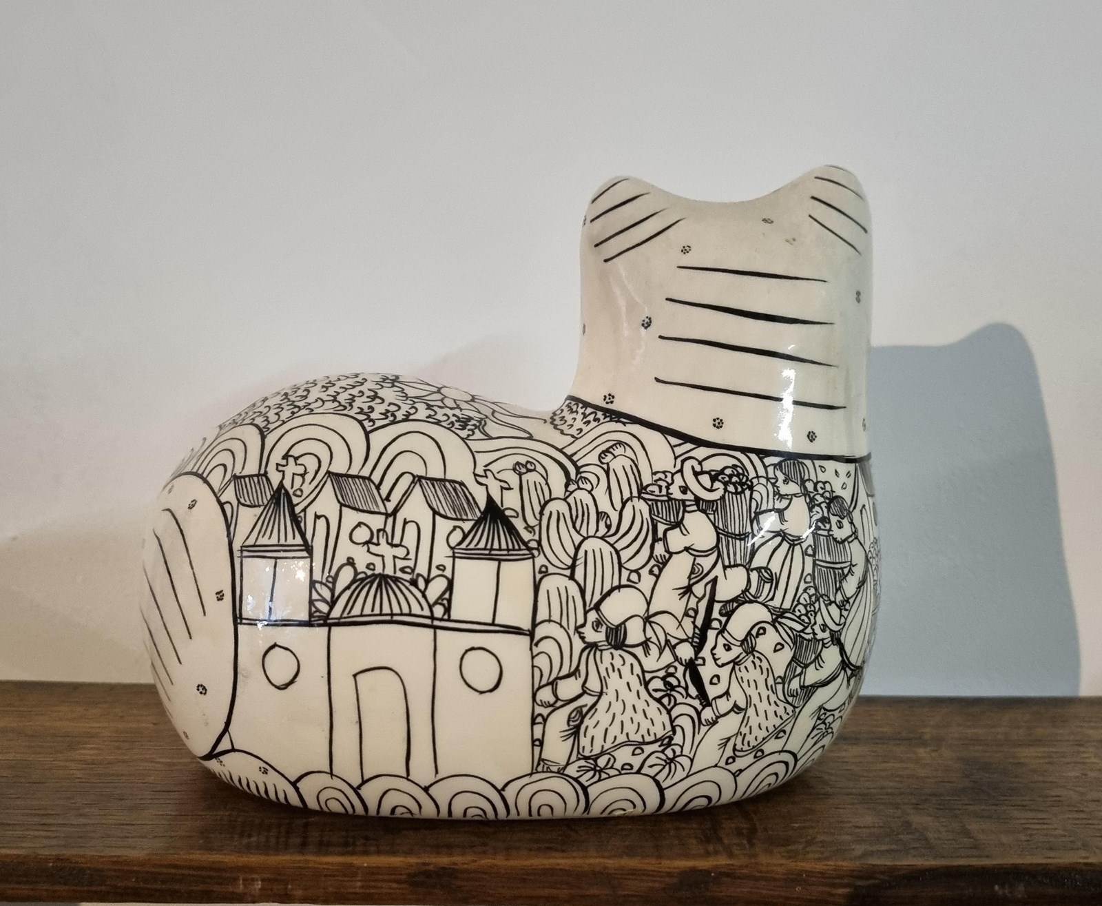 Style: This hand-painted vintage Tonala ceramic lying down cat offers a sophisticated departure from the style's traditionally vibrant palette. Rendered in a striking monochrome black and white scheme, the piece features intricate illustrations of traditional Mexican life.