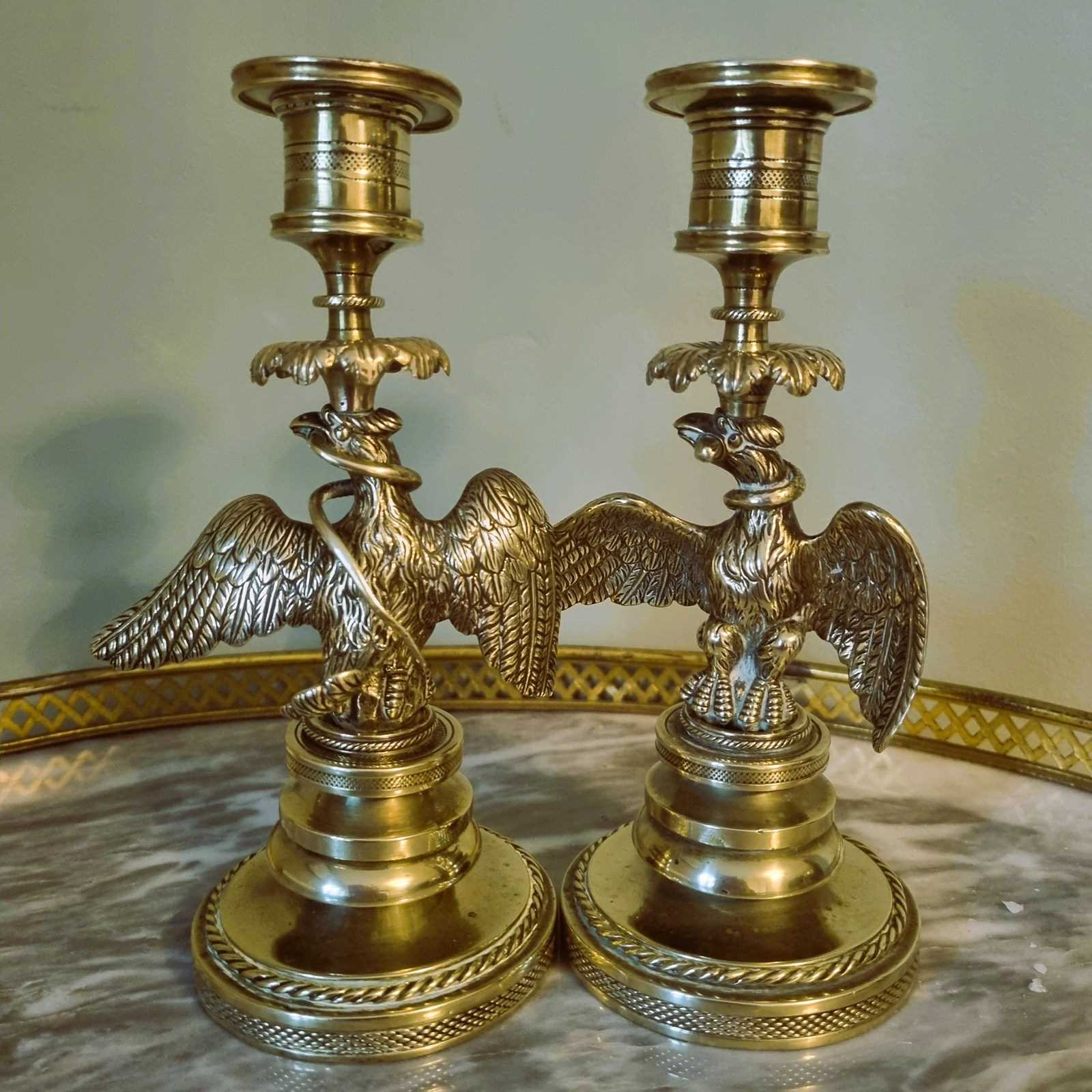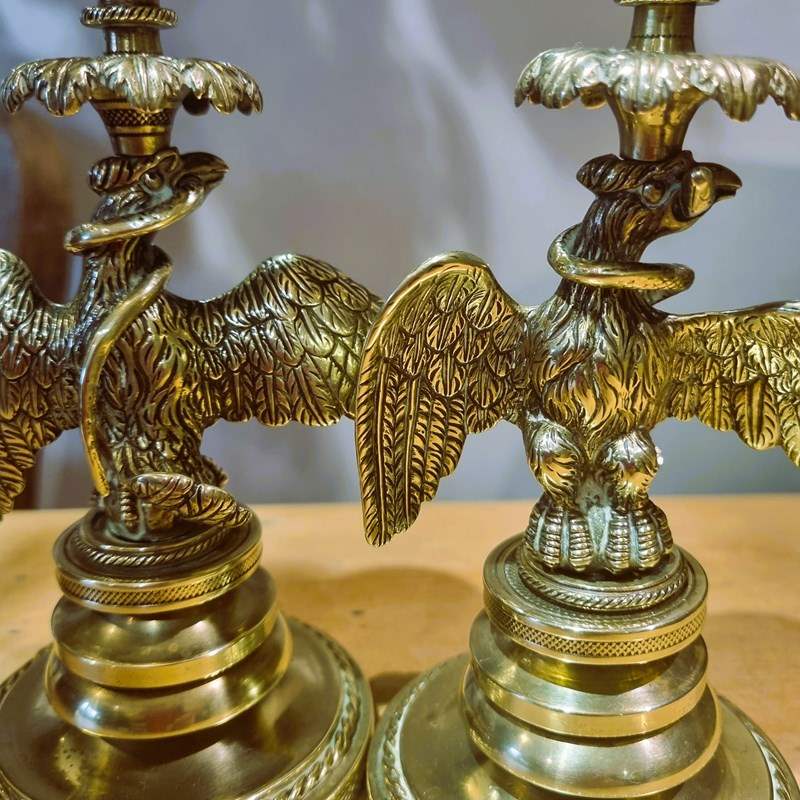 Style: A truly magnificent pair of vintage solid brass candle holders, beautifully cast with classical Regency-era designs. Each holder boasts an intricate, mirror-image motif of an imperial eagle, finely sculpted and majestic, clutching a serpent in its mouth, with every feather of its wings rendered in superb detail. In remarkable condition for their age, they promise a regal touch, perfect for gracing a fireplace mantelpiece, console, or elegant side tables.
