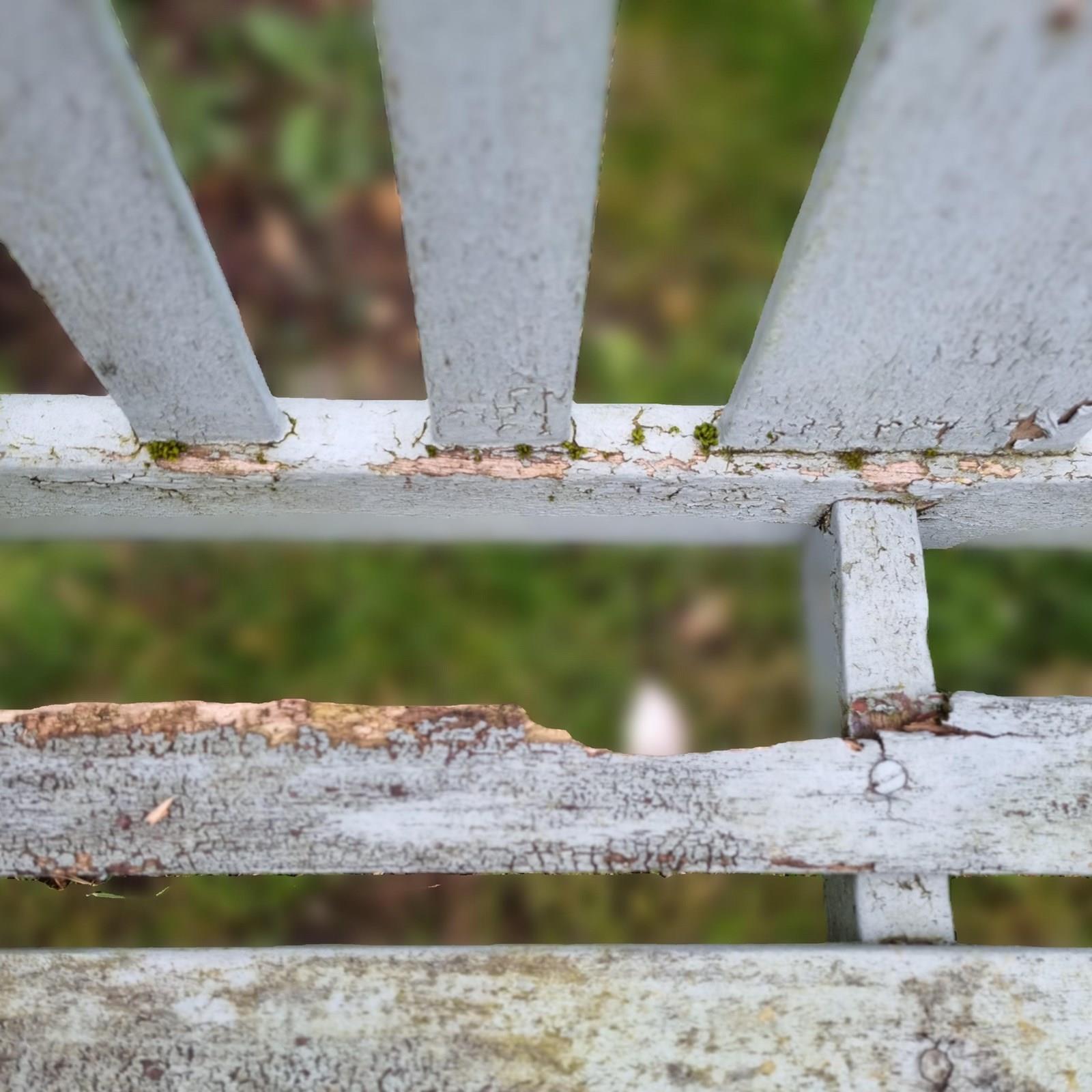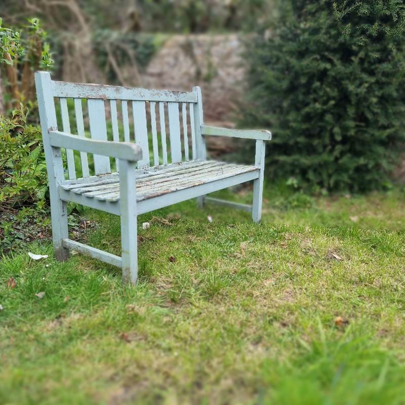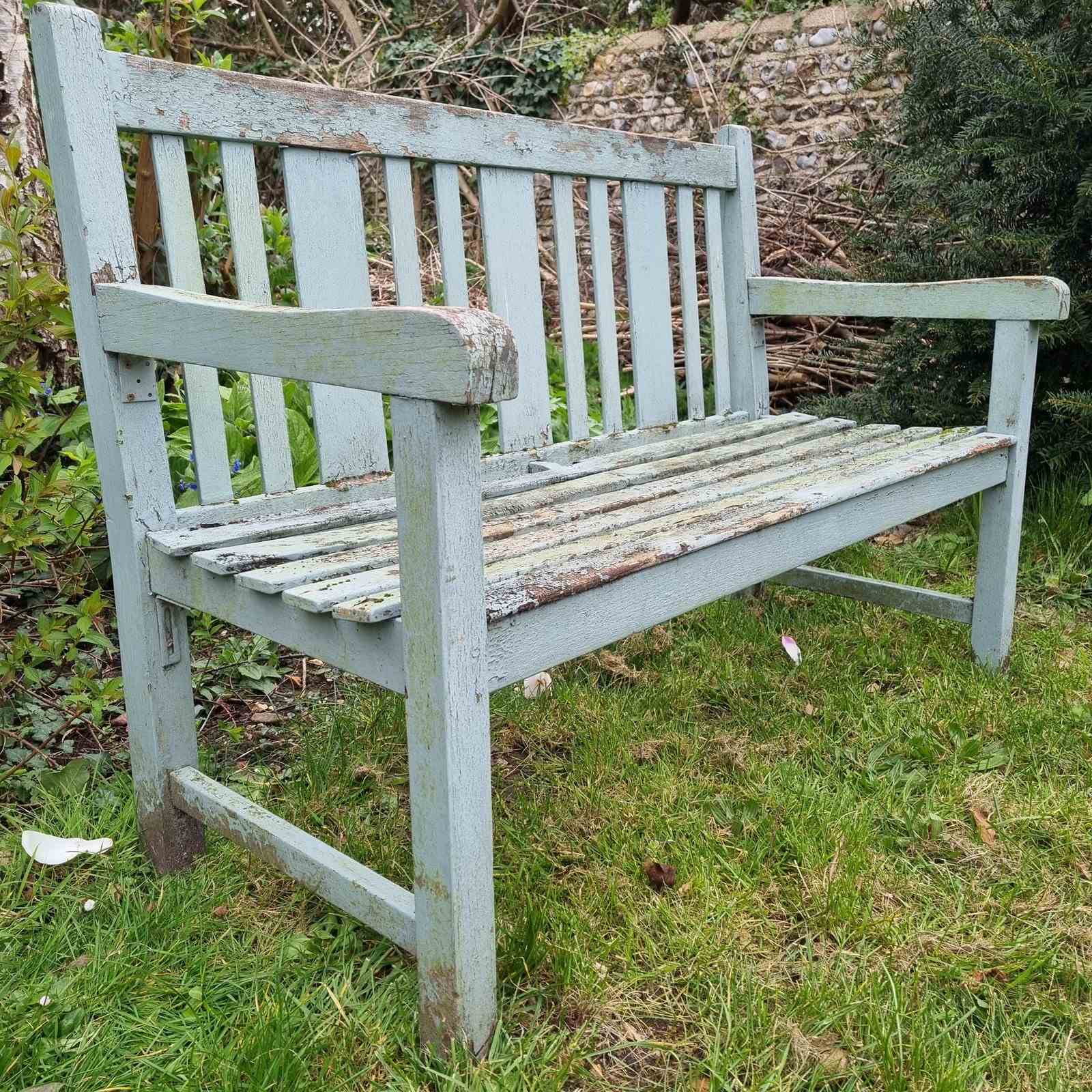 Style: A weather worn garden bench from the late 20th century, constructed of solid silvered teak painted in a faded peeling sage green. One of the rear seat slats has begun to rot, though it remains attached and doesn’t compromise the bench’s ability to be sat on. This is reflected in the price.