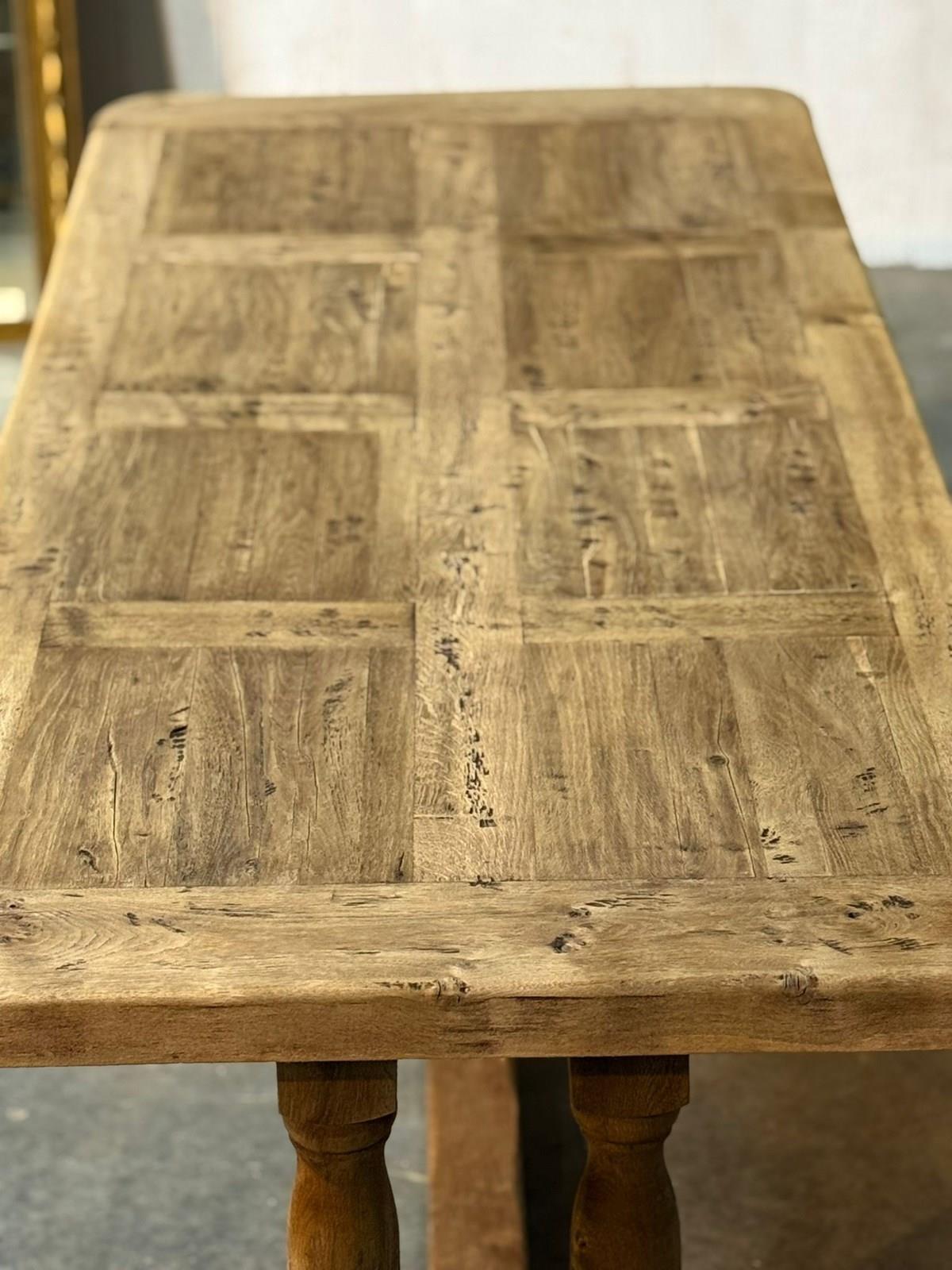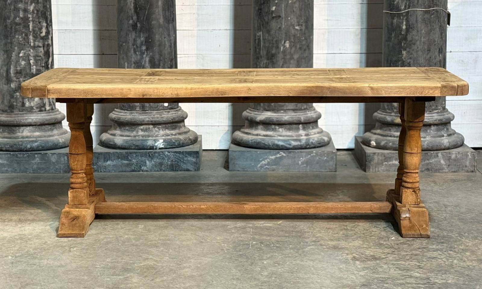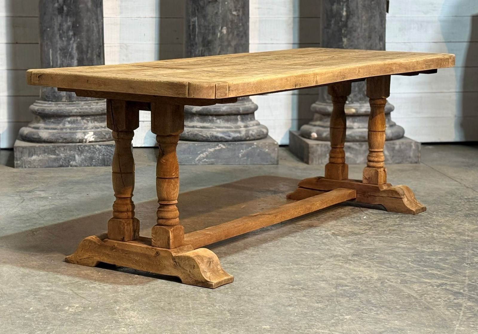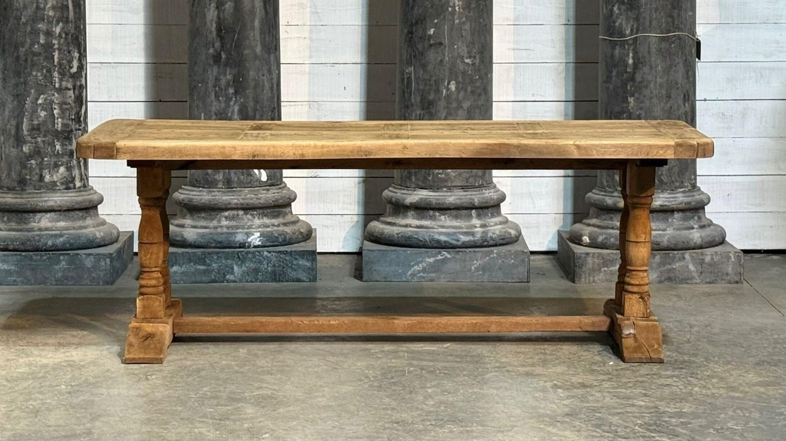A lovely Farmhouse Table having the rare advantage of being deep at 89cm. Great looking top with just the right amount of character. French in origin and dating to the early 1900s, of good quality construction and completely comes apart for easy access into the home. We have bleached it for a lighter look and in excellent condition.