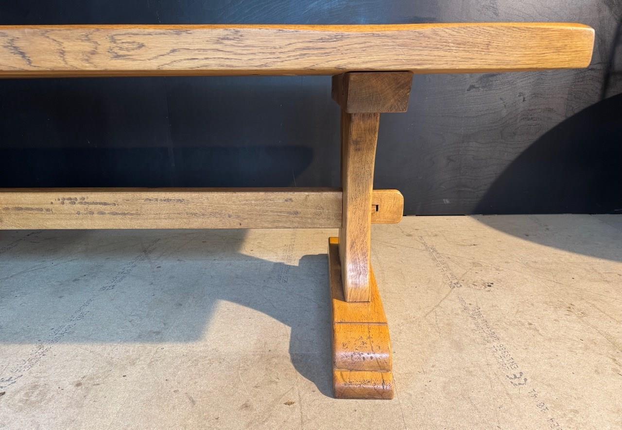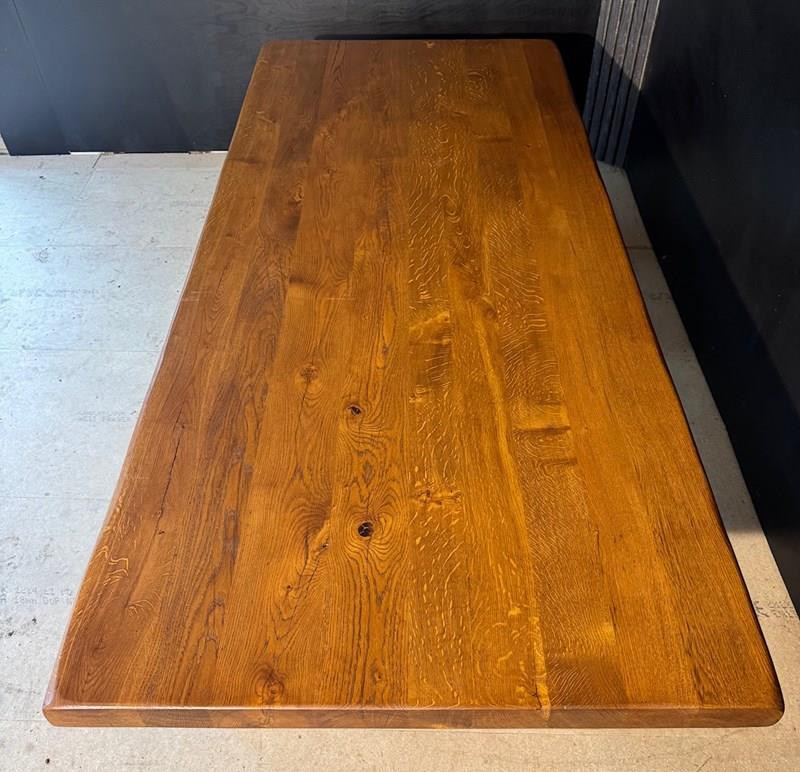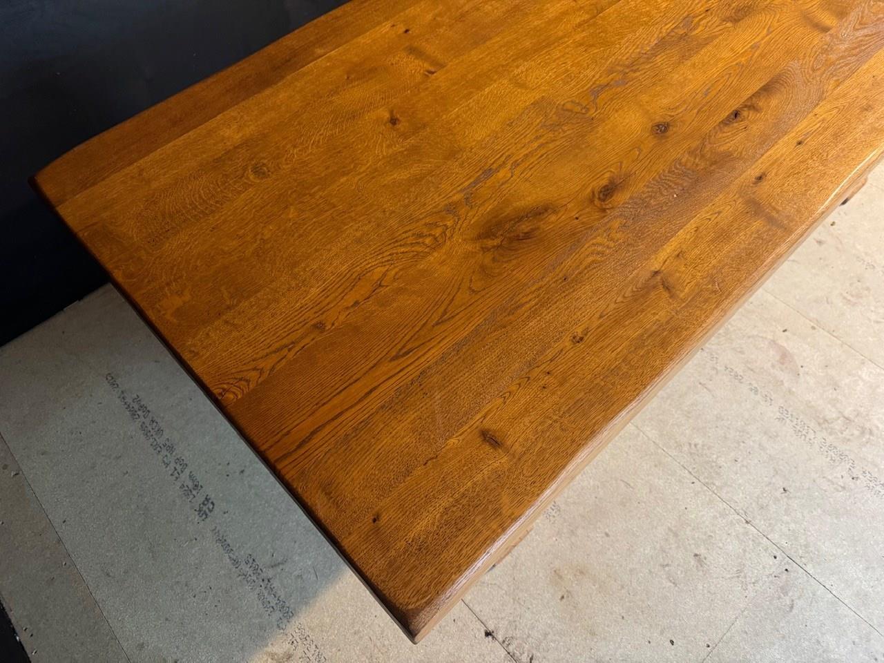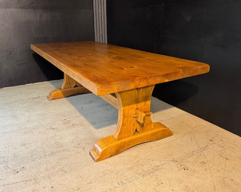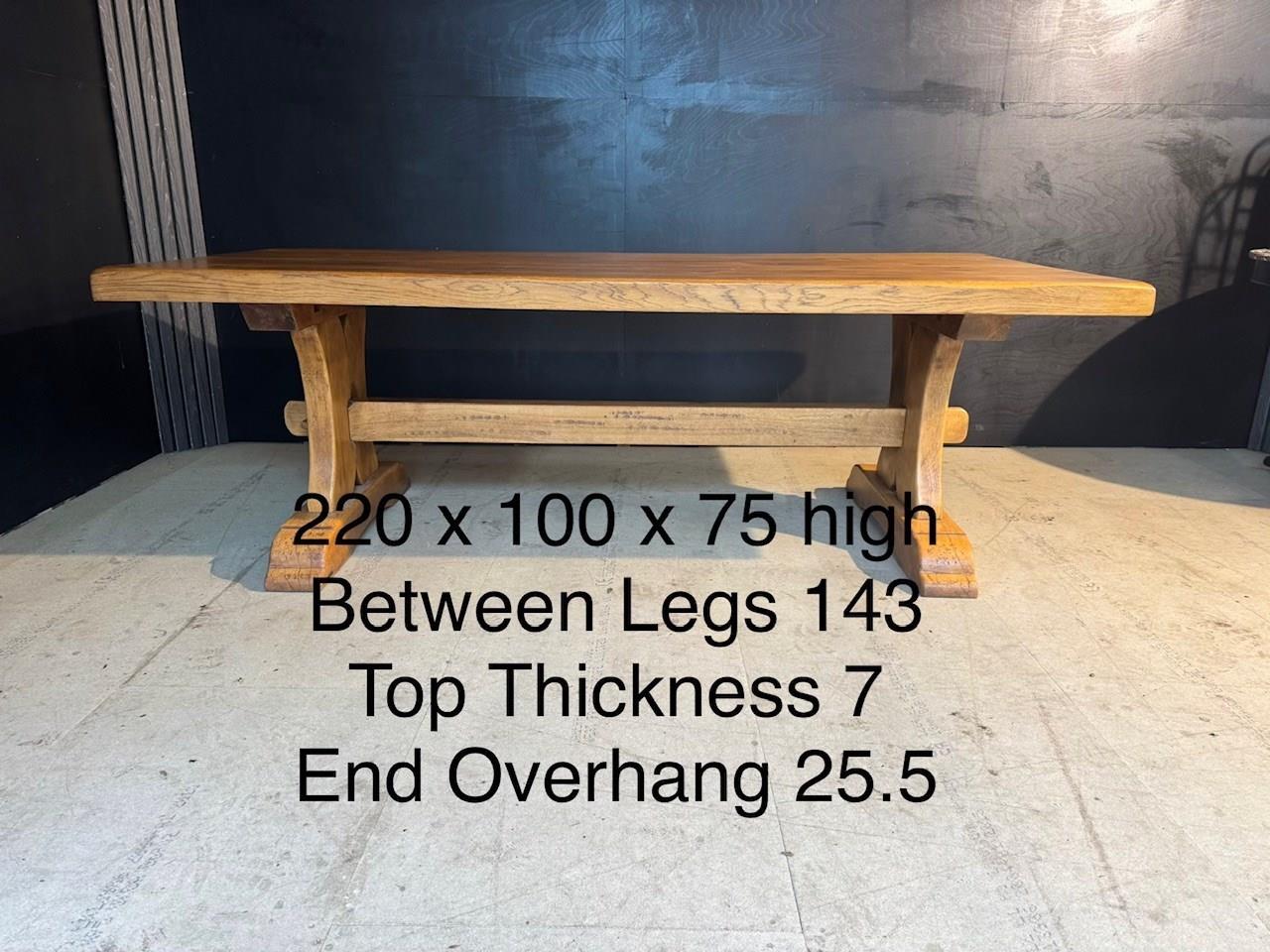 A hard to find deeper (100cm) solid Oak Farmhouse Dining Table. French in origin and dating to the 1920s, of excellent quality construction and completely comes apart for easy access into the home. Nice warm Oak colour and in overall excellent condition.