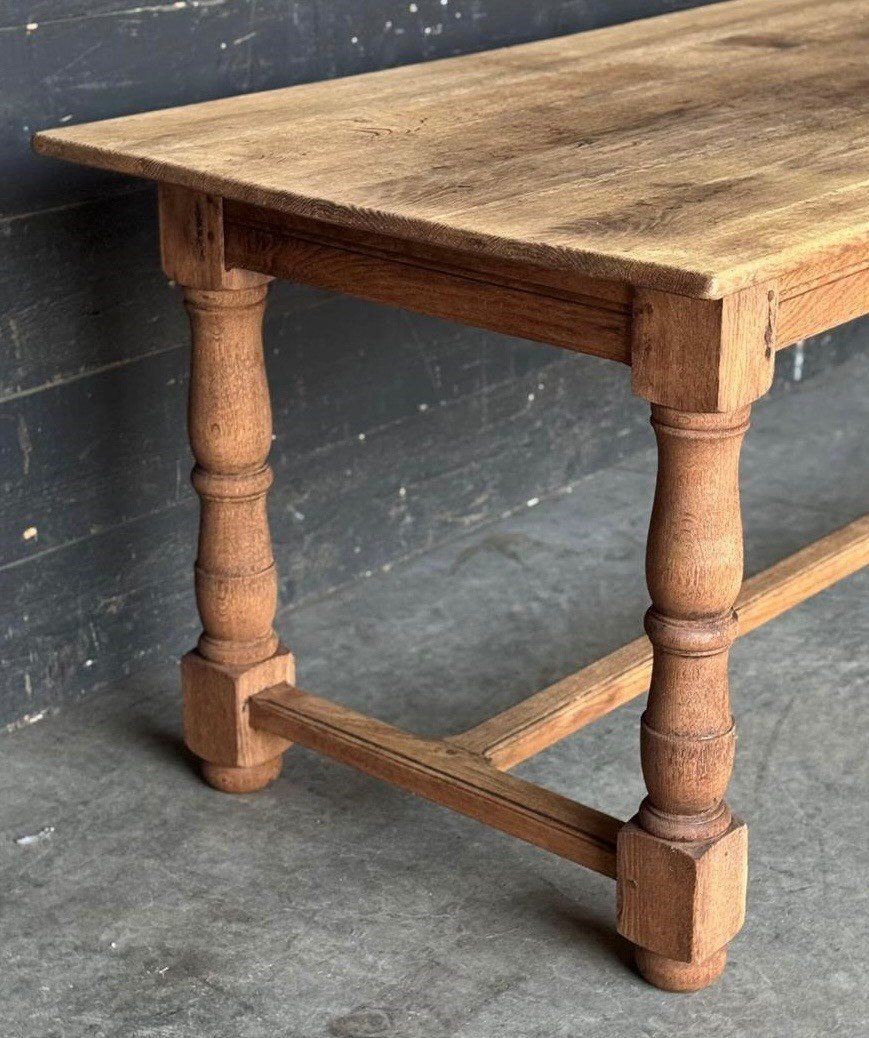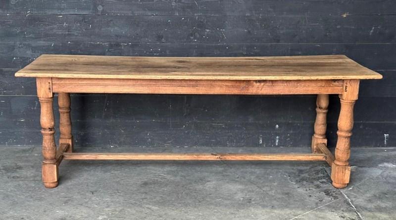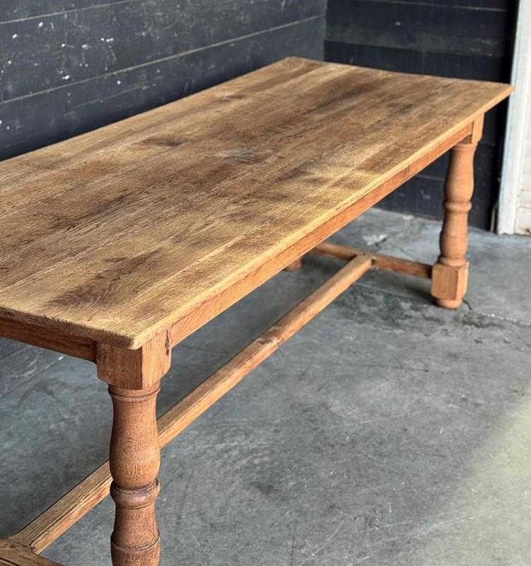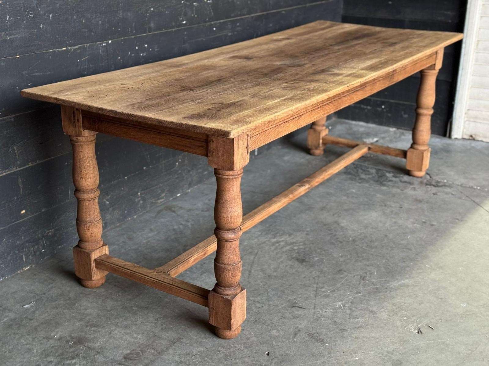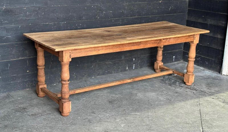 A good solid Oak Farmhouse Dining Table dating to the early 1900s. French in origin and of good quality construction with peg joints. We have bleached it for a lighter look and to bring out the beauty of the Oak. In overall excellent original condition for the home.