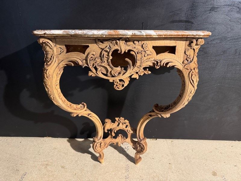 French Oak Console Table with original variegated rouge marble top. Lovely rococo scrolls and carvings. We have bleached it for a lighter look and in excellent original condition for the home. Height 82 cm Width 76 cm Depth 40 cm