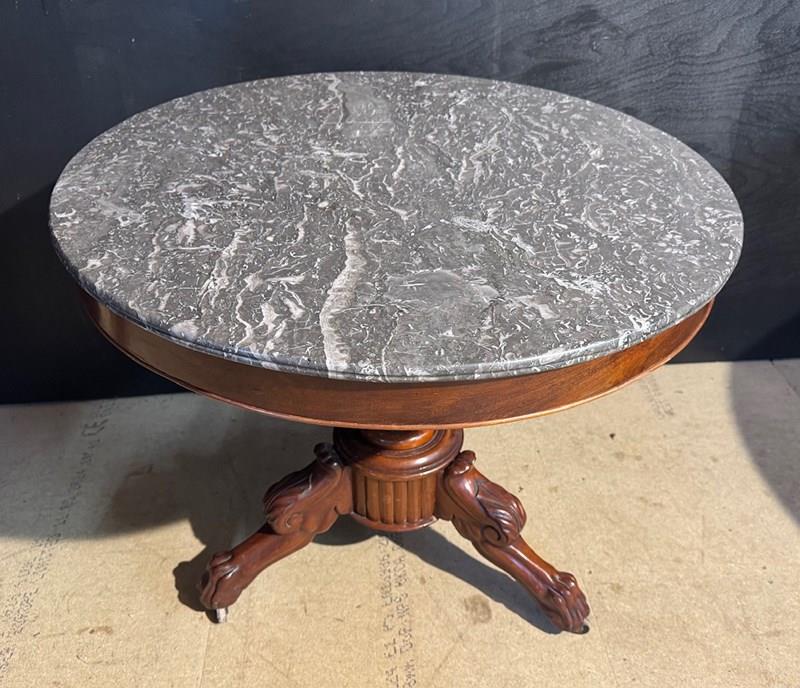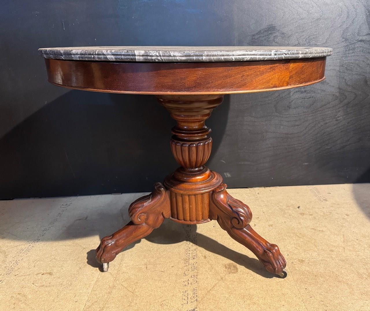 A lovely French Gueridon Table dating to the mid 19th Century. Variegated Grey original marble top with mahogany Base. In overall excellent original condition for the home.